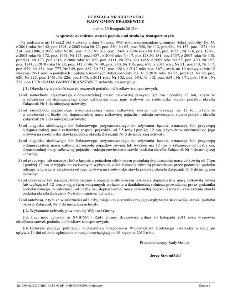 UCHWAŁA NR XXX/121/2012 RADY GMINY BRĄSZEWICE z dnia 29 listopada 2012 r. w sprawie określenia stawek podatku od środków transportowych Na podstawie art.18 ust.2 pkt 8 ustawy z dnia 8 marca 1990 roku o samorządzie gminnym /tekst jednolity Dz. U. z 2001 roku Nr 142, poz.1591, z 2002 roku Nr 23, poz. 220, Nr 62, poz. 558, Nr 113, poz.984, Nr 153, poz. 1271 i Nr 214, poz.1806, z 2003 roku Nr 80, poz. 717 i Nr 162, poz. 1568, z 2004 roku Nr 102, poz. 1055 , Nr 116, poz. 1203 , z 2005 roku Nr 172, poz. 1441, Nr 175, poz.1457 , z 2006 roku Nr 17, poz.128,Nr 181, poz.1337, z 2007 roku Nr 138, poz.974, Nr 173, poz.1218, z 2008 roku Nr 180, poz. 1111, Nr 223, poz.1458, z 2009 roku Nr 52, poz. 420, Nr 157, poz. 1241, z 2010 roku Nr 28, poz. 142 i 146, Nr 40, poz. 230, Nr 106, poz. 675, z 2011 roku Nr 21, poz.113, Nr 117, poz. 679, Nr 134, poz. 777, Nr 149, poz. 887, Nr 217, poz. 1281, z 2012 roku poz. 567 /, art.8, art.10 ustawy z dnia 12 stycznia 1991 roku o podatkach i opłatach lokalnych /tekst jednolity Dz. U. z 2010 roku Nr 95, poz.613, Nr 96, poz. 620, Nr 225, poz. 1461, Nr 226, poz.1475, z 2011 roku Nr 102, poz. 584, Nr 112, poz. 654 , Nr 171, poz. 1016 i Nr 232, poz.1378 / RADA GMINY BRĄSZEWICE uchwala, co następuje: § 1. Określa się wysokość stawek rocznych podatku od środków transportowych: 1) od samochodu ciężarowego o dopuszczalnej masie całkowitej powyżej 3,5 ton i poniżej 12 ton, z tym że w zależności od dopuszczalnej masy całkowitej oraz jego wpływu na środowisko stawki podatku określa Załącznik Nr 1 do niniejszej uchwały; 2) od samochodu ciężarowego o dopuszczalnej masie całkowitej równej lub wyższej niż 12 ton, z tym że w zależności od liczby osi, dopuszczalnej masy całkowitej pojazdu i rodzaju zawieszenia stawki podatku określa Załącznik Nr 2 do niniejszej uchwały; 3) od ciągnika siodłowego lub balastowego przystosowanego do używania łącznie z naczepą lub przyczepą o dopuszczalnej masie całkowitej zespołu pojazdów od 3,5 tony i poniżej 12 ton, z tym że w zależności od jego wpływu na środowisko stawki podatku określa Załącznik Nr 3 do niniejszej uchwały; 4) od ciągnika siodłowego lub balastowego przystosowanego do używania łącznie z naczepą lub przyczepą o dopuszczalnej masie całkowitej zespołu pojazdów równej lub wyższej niż 12 ton w zależności od liczby osi, dopuszczalnej masy całkowitej pojazdu i rodzaju zawieszenia stawki podatku określa Załącznik Nr 4 do niniejszej uchwały; 5) od przyczepy lub naczepy, które łącznie z pojazdem silnikowym posiadają dopuszczalną masę całkowitą od 7 ton i poniżej 12 ton, z wyjątkiem związanych wyłącznie z działalnością rolniczą prowadzoną przez podatnika podatku rolnego, z tym że w zależności od jego wpływu na środowisko stawki podatku określa Załącznik Nr 5 do niniejszej uchwały; 6) od przyczepy lub naczepy, które łącznie z pojazdem silnikowym posiadają dopuszczalną masę całkowitą równą lub wyższą niż 12 ton, z wyjątkiem związanych wyłącznie z działalnością rolniczą prowadzoną przez podatnika podatku rolnego, w zależności od liczby osi, dopuszczalnej masy całkowitej pojazdu i rodzaju zawieszenia stawki podatku określa Załącznik Nr 6 do niniejszej uchwały; 7) od autobusu, z tym że w zależności od liczby miejsc do siedzenia oraz jego wpływu na środowisko stawki podatku określa Załącznik Nr 7 do niniejszej uchwały. § 2. Wykonanie uchwały powierza się Wójtowi Gminy. § 3. Traci moc uchwała nr XVII/66/11 Rady Gminy Brąszewice z dnia 30 listopada 2011 roku w sprawie określenia stawek podatku od środków transportowych. § 4. Uchwała podlega publikacji w Dzienniku Urzędowym Województwa Łódzkiego i wchodzi w życie po upływie 14 dni od dnia ogłoszenia z mocą obowiązującą od 01 stycznia 2013 roku Przewodniczący Rady Gminy Jerzy Strumiński —————————————————————————————————————————————————————————— Id: E394D32E-3DBC-4B53-93BF-464B856B52E9. Podpisany Strona 1 Załącznik Nr 1 do Uchwały Nr XXX/121/2012 Rady Gminy Brąszewice z dnia 29 listopada 2012 r. STAWKA PODATKU ( w złotych ) Dopuszczalna masa całkowita (w tonach) Spełnia normy czystości spalin EURO, posiada instalację gazową lub inne Pozost ałe powyżej 3,5 do 5,5 włącznie 420 470 powyżej 5,5 do 9 włącznie 670 720 powyżej 9 i poniżej 12 720 800 —————————————————————————————————————————————————————————— Id: E394D32E-3DBC-4B53-93BF-464B856B52E9. Podpisany Strona 1 Załącznik Nr 2 do Uchwały Nr XXX/121/2012 Rady Gminy Brąszewice z dnia 29 listopada 2012 r. Liczba osi i dopuszczalna masa całkowita (w tonach) nie mniej niż mniej niż STAWKA PODATKU (w złotych) oś jezdna (osie jezdne) z zawieszeniem pneumatycznym lub zawieszeniem uznanym za równoważne inne systemy zawieszenia osi jezdnych 12 13 Dwie osie 820 13 14 840 910 14 15 890 950 15 1130 1800 12 17 Trzy osie 860 920 17 19 900 1000 19 21 950 1100 21 23 1000 1490 23 25 1460 2270 1460 2270 25 Cztery osie i więcej 1460 900 12 25 25 27 1480 2000 27 29 1450 2400 29 31 1520 3090 2370 3090 31 1470 —————————————————————————————————————————————————————————— Id: E394D32E-3DBC-4B53-93BF-464B856B52E9. Podpisany Strona 1 Załącznik Nr 3 do Uchwały Nr XXX/121/2012 Rady Gminy Brąszewice z dnia 29 listopada 2012 r. STAWKA PODATKU (w złotych) Dopuszczalna masa całkowita zespołu pojazdów: ciągnik siodłowy lub balastowy + naczepa lub przyczepa (w tonach) od 3,5 i poniżej 12 Spełnia normy czystości spalin EURO, posiada instalację gazową lub inne Pozostałe 780 920 ————————————————————
