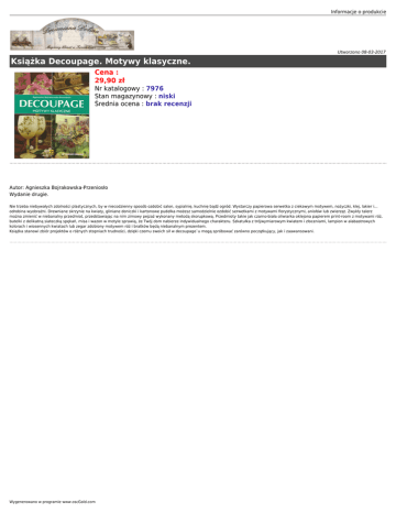 Informacje o produkcie Utworzono 08-03-2017 Książka Decoupage. Motywy klasyczne. Cena : 29,90 zł Nr katalogowy : 7976 Stan magazynowy : niski Średnia ocena : brak recenzji Autor: Agnieszka Bojrakowska-Przeniosło Wydanie drugie. Nie trzeba niebywałych zdolności plastycznych, by w niecodzienny sposób ozdobić salon, sypialnię, kuchnię bądź ogród. Wystarczy papierowa serwetka z ciekawym motywem, nożyczki, klej, lakier i... odrobina wyobraźni. Drewniane skrzynie na kwiaty, gliniane doniczki i kartonowe pudełka możesz samodzielnie ozdobić serwetkami z motywami florystycznymi, aniołów lub zwierząt. Zwykły talerz można zmienić w niebanalny przedmiot, przedstawiając na nim zimowy pejzaż wykonany metodą skorupkową. Przedmioty takie jak czarno-biała oliwiarka oklejona papierem print-room z motywami róż, butelki z delikatną siateczką spękań, misa i wazon w motyle sprawią, że Twój dom nabierze indywidualnego charakteru. Szkatułka z trójwymiarowym kwiatem i złoceniami, lampion w alabastrowych kolorach i wiosennych kwiatach lub zegar zdobiony motywem róż i bratków będą niebanalnym prezentem. Książka stanowi zbiór projektów o różnych stopniach trudności, dzięki czemu swoich sił w decoupage`u mogą spróbować zarówno początkujący, jak i zaawansowani. Wygenerowano w programie www.oscGold.com