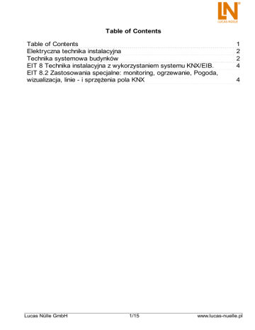 Table of Contents Table of Contents Elektryczna technika instalacyjna Technika systemowa budynków EIT 8 Technika instalacyjna z wykorzystaniem systemu KNX/EIB. EIT 8.2 Zastosowania specjalne: monitoring, ogrzewanie, Pogoda, wizualizacja, linie - i sprzężenia pola KNX Lucas Nülle GmbH 1/15 1 2 2 4 4 www.lucas-nuelle.pl Elektryczna technika instalacyjna Training systems / trainers for electrical wiring/building management systems: Protective circuitry, protective measures, building mains feed, lighting and intercom systems Industrial wiring, intercoms, alarm systems, hazard alarms and access control KNX/EIB, LON Project work, technical practice, assembly practice systems, planning software Technika systemowa budynków Technika systemowa budynków Obszar "technika systemowa budynków" obejmuje wszystkie tematy rozszerzonej techniki instalacyjnej. W nowoczesnej technice instalacyjnej coraz więcej obszarów podlega automatyzacji. Dużą rolę odgrywają też: oszczędność energii, ochrona środowiska i technika bezpieczeństwa. Te systemy techniki budynków coraz częściej mają postać programowalnych systemów magistralnych, które można łączyć zależnie od potrzeb. W trakcie kursu przekażemy podstawowe wiadomości i zrealizujemy małe projekty użytkowe. Lucas Nülle GmbH 2/15 www.lucas-nuelle.pl Lighting management using DALI Lighting management nowadays means more than just flexibility, energy saving and comfort. DALI stands for “Digital Addressable Lighting Interface” and is a protocol for digital communication between electronic lighting controls and appliances (electronic ballast units, transformers etc.). The new comprehensive system, consisting of a controller, sensor, extender and buttons, is characterised by the option of programming with or without computers or an overarching bus system. Configuration of the buscontrolled lighting system can be handled entirely by means of the display integrated into the controller with the help of a push-button rotary switch. Light management covers all areas of public life, including the following: Living room and building lighting Special effects lighting Industrial and street lighting Emergency and escape route lighting Lucas Nülle GmbH 3/15 www.lucas-nuelle.pl EIT 8 Technika instalacyjna z wykorzystaniem systemu KNX/EIB. EIT 8 Technika instalacyjna z wykorzystaniem systemu KNX/EIB. Wymagania w odniesieniu do elektrycznej instalacji domowej ciągle rosną wraz z rozwojem techniki. Instalator musi się do tego dostosować. Poniższe tematy bazują na konwencjonalnej technice instalacyjnej i pokazują, jak przejść do nowych metod zarządzania budynkami. Oprócz normalnej sieci instalacyjnej, potrzebny jest system magistralny do komunikacji pomiędzy poszczególnymi urządzeniami wykonawczymi. Wszystkie urządzenia wykonawcze są wyposażone w "inteligencję" i są programowane za pomocą komputera PC. Jest to w tym przypadku system zdecentralizowany, w którym komputer służy wyłącznie do programowania urządzeń. Podstawy magistrali instalacyjnej EIB Przygotowanie i budowa projektu EIB Programowanie urządzeń na przykładzie wyłączenia Programowanie przełącznika schodowego Integracja konwencjonalnych przełączników z projektem EIB Programowanie funkcji centralnej Włączanie i przyciemnianie lamp Sterowanie żaluzjami i zasłonami Lucas Nülle GmbH 4/15 www.lucas-nuelle.pl EIT 8.2 Zastosowania specjalne: monitoring, ogrzewanie, Pogoda, wizualizacja, linie - i sprzężenia pola KNX Lucas Nülle GmbH 5/15 www.lucas-nuelle.pl EIT 8.2 Zastosowania specjalne: monitoring, ogrzewanie, Pogoda, wizualizacja, linie i sprzężenia pola KNX Z specjalne aplikacje nabyte podczas kursu jest podstawową wiedzę pogłębił i rozszerzony. Wyposażenie dodatkowe zestawy następujące treści dydaktyczne edycji: System monitorowania Monitorowanie pokoju Korzystanie z informacji Displays Ocena sprawozdań KNX - Triton - przycisk 3 - krotnie z wyświetlaczem KNX - Czujnik obecności i ruchu KNX - Przycisk - Interfejs Okna, drzwi i śrub kontakty przełączające Sterowanie ogrzewaniem Treści dydaktyczne: Sterowanie ogrzewaniem w celu utrzymania temperatury w pomieszczeniu Sterowanie ogrzewaniem z ustawieniem ochrony przed mrozem Reakcja regulacji temperatury w pomieszczeniu na zakłócenia Automatyczne dopasowanie lato/zima Kontrola obecności Stacja pogodowa Rejestracja danych pogodowych za pomocą czujników Zasilanie czujników Przetwarzanie danych analogowych za pomocą KNX/EIB Interpretacja i wyświetlanie sygnałów analogowych Rozszerzenie obszarowe rozszerzenie topologii pojedynczej linii na rozbudowaną topologię obszarową Dodatkowe zasilacze do różnych obszarów i linii Integracja dodatkowych urządzeń Integracja dodatkowych złączy USB Obsługa i wizualizacja Uruchomienie panelu dotykowego Programowanie panelu dotykowego Prezentacja graficzna na panelu dotykowym Lucas Nülle GmbH 6/15 www.lucas-nuelle.pl Uzupelnienie do wyposazenia podstawowego: Uzupełnienie do wyposażenia podstawowego: Pos. nazwa produktu Bestell-Nr. 1 Instalacja monitoringu EIB z czujnikiem obecności i przyciskami napadowymi CO3209-9B Anz. 1 Płyta "instalacja monitoringu" udostępnia wszystkie ważne podzespoły do monitorowania pomieszczenia. Komunikaty do interpretacji różnych sygnałów i stanów są wyświetlane na wyświetlaczu informacyjnym. Płyta zawiera następujące podzespoły: Przełącznik EIB Triton, potrójny, z wyświetlaczem Czujnik ruchu EIB 170° Czujnik obecności EIB 360° Interfejs do przycisków EIB Zestyk okienny Zestyk drzwiowy Czujnik wybicia szyby Zestyk przełączający rygla Dane techniczne Napięcie robocze: 230 V/50 Hz Napięcie magistrali EIB: 30 V DC Wejścia/wyjścia sieć: bezpieczne gniazda 4 mm Wejścia/wyjścia magistrala: bezpieczne gniazda 2 mm Wymiary: 297 x 456 x 160 mm Masa: 2,5 kg Lucas Nülle GmbH 7/15 www.lucas-nuelle.pl 2 Regulator ogrzewania EIB ze wskaźnikiem temperatury, układ z kompensacją