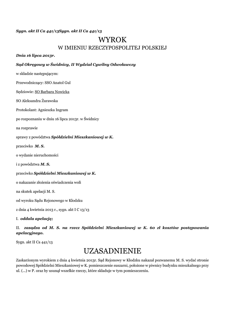 Sygn. akt II Ca 441/13Sygn. akt II Ca 441/13 WYROK W IMIENIU RZECZYPOSPOLITEJ POLSKIEJ Dnia 16 lipca 2013r. Sąd Okręgowy w Świdnicy, II Wydział Cywilny Odwoławczy w składzie następującym: Przewodniczący: SSO Anatol Gul Sędziowie: SO Barbara Nowicka SO Aleksandra Żurawska Protokolant: Agnieszka Ingram po rozpoznaniu w dniu 16 lipca 2013r. w Świdnicy na rozprawie sprawy z powództwa Spółdzielni Mieszkaniowej w K. przeciwko M. S. o wydanie nieruchomości i z powództwa M. S. przeciwko Spółdzielni Mieszkaniowej w K. o nakazanie złożenia oświadczenia woli na skutek apelacji M. S. od wyroku Sądu Rejonowego w Kłodzku z dnia 4 kwietnia 2013 r., sygn. akt I C 13/13 I. oddala apelację; II. zasądza od M. S. na rzecz Spółdzielni Mieszkaniowej w K. 60 zł kosztów postępowania apelacyjnego. Sygn. akt II Ca 441/13 UZASADNIENIE Zaskarżonym wyrokiem z dnia 4 kwietnia 2013r. Sąd Rejonowy w Kłodzku nakazał pozwanemu M. S. wydać stronie powodowej Spółdzielni Mieszkaniowej w K. pomieszczenie suszarni, położone w piwnicy budynku mieszkalnego przy ul. (...) w P. oraz by usunął wszelkie rzeczy, które składuje w tym pomieszczeniu. Ponadto Sąd ten oddalił powództwo wzajemne M. S. przeciwko Spółdzielni Mieszkaniowej w K. o nakazanie złożenia oświadczenia woli w przedmiocie przydziału mu piwnicy spełniającej kryteria techniczne przewidziane dla tych pomieszczeń. Z ustaleń Sądu Rejonowego wynika, że nieruchomość, położona przy ul. (...) w P., objęta księgą wieczystą (...), stanowi współwłasność powodowej Spółdzielni Mieszkaniowej w K.. W skład części wspólnych tej nieruchomości wchodzi pomieszczenie suszarni, położone w piwnicy budynku. Pozwanemu przysługiwało, do chwili sprzedaży w dniu 31 marca 2011r., spółdzielcze własnościowe prawo do lokalu mieszkalnego nr 1 w budynku, położonym przy ul. (...)w P.. Pomimo sprzedaży lokalu, pozwany nadal zajmował pomieszczenie suszarni, znajdujące się w budynku nr 5 na terenie przedmiotowej nieruchomości, składując tam swoje rzeczy. Pomieszczenie to było zamykane, dostęp do niego miał tylko pozwany. Powodowa Spółdzielnia wzywała pozwanego do opuszczenia zajmowanego pomieszczenia suszarni – bezskutecznie. Pozwany – powód wzajemny nabył w dniu 7 kwietnia 2011r. spółdzielcze własnościowe prawo do lokalu mieszkalnego nr 1, położonego w P.przy ul. (...), wchodzącego w skład zasobów mieszkaniowych powodowej Spółdzielni, od spadkobierców J. Ś.. W chwili zakupu obowiązywała uchwała Zarządu powodowej Spółdzielni nr (...)/2006 w sprawie określenia przedmiotu odrębnej własności lokali w nieruchomości (...) obejmującej budynki, położone w P.przy Al. (...)i ul. (...), w brzmieniu nadanym jej aneksem nr 1 z dnia 10 czerwca 2008r. Zgodnie z uchwałą, do lokalu mieszkalnego nr 1, położonego w P.przy ul. (...)przynależne było pomieszczenie piwniczne o powierzchni 2,68 m2. Pozwany – powód wzajemny zwracał się do powodowej Spółdzielni o oddanie mu do używania dotychczas zajmowanego pomieszczenia piwnicznego, położonego w budynku przy ul. (...), wskazując, że w budynku przy ul. (...) nie ma piwnicy, nadającej się do użytkowania, zgodnie z jej przeznaczeniem. Powodowa Spółdzielnia poinformowała pozwanego – powoda wzajemnego o wyrażeniu zgody na zagospodarowanie przez niego części korytarza piwnicznego w budynku przy ul. (...), które to dodatkowe pomieszczenie powinien zabezpieczyć we własnym zakresie i na własny koszt oraz opłacać w kwocie 5,04 zł miesięcznie. W odpowiedzi, pozwany – powód wzajemny złożył skargę do Rady Nadzorczej powodowej Spółdzielni na działalność Zarządu, wskazując, że nie składał wniosku o przydzielenie mu pomieszczenia dodatkowego, a wnosił o przydzielenie mu pomieszczenia, należnego każdemu lokatorowi, które spełniałoby wymogi techniczne i mogłoby być użytkowane zgodnie z jego przeznaczeniem. Poczyniwszy takie ustalenia faktyczne Sąd Rejonowy uwzględnił powództwo główne na podstawie przepisu art. 222 § 1 kc uznając, że pozwany zajmuje pomieszczenie suszarni w budynku nr 5 przy ul. (...)w P.bez tytułu prawnego. W niniejszej sprawie bezspornym było, że po zbyciu, w dniu 31 marca 2011r., spółdzielczego własnościowego prawa do lokalu mieszkalnego nr 1 w budynku, położonym przy ul. (...)w P., znajdującym się w zasobach mieszkaniowych powodowej Spółdzielni, będącej współwłaścicielem nieruchomości, pozwany M. S.nadal zajmował pomieszczenie suszarni, znajdujące się w piwnicy budynku nr 5 na terenie w/w nieruchomości, stanowiące część wspólną, składując tam swoje rzeczy i zamykając to pomieszczenie w taki sposób, że tylko on miał dostęp do tego pomieszczenia. Pozwany nie wykazał zarazem, że przysługuje mu skuteczne względem właściciela uprawnienie do władania rzeczą (art. 222 § 1 kc w zw. z art. 6 kc). Uzależnianie przez pozwanego wydania przedmiotowego pomieszczenia suszarni, znajdującego się w budynku położonym przy ul. (...), od przydzielenia mu innego pomieszczenia piwnicznego w innym budynku (przy ul. (...)), w związku z przysługującym mu spółdzielczym prawem do lokalu mieszkalnego w tym budynku, Sąd uznał za bezzasadne. Jak słusznie podniosła powodowa Spółdzielnia, fakt, że pozwanemu nie odpowiada standard pomieszczenia piwnicznego, które zajmuje w budynku przy ul. (...), nie uprawnia go do bezprawnego zajmowania innego pomieszczenia, położonego w budynku przy ul. (...). Pozwanemu, który faktycznie władał spornym pomieszczeniem suszarni, nie przysługiwało żadne prawo skuteczne względem właścicieli. Poza sporem pozostaje wszak, że stron nie łączyła jakakolwiek umowa, która dawałaby pozwanemu uprawnienie do posiadania tegoż pomieszczenia i które wyprzedzałoby roszczenie windykacyjne powoda. Natomiast powództwo wzajemne Sąd Rejonowy oddalił. Pozwany – powód wzajemny nie wykazał, że do jego lo
