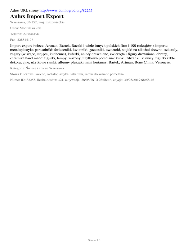 Adres URL strony http://www.domiogrod.org/82255 Anlux Import Export Warszawa, 03-152, woj. mazowieckie Ulica: Modlińska 286 Telefon: 228844196 Fax: 228844196 Import-export świece: Artman, Bartek, Raczki i wiele innych polskich firm i 100 rodzajów z importu metaloplastyka-parasolniki: świeczniki, kwietniki, gazetniki, owocarki, stojaki na alkohol drewno: szkatuły, zegary (wiszące, stojące, kuchenne), kuferki, anioły drewniane, zwierzęta i figury drewniane, obrazy, ceramika hand made: figurki, lampy, wazony, użytkowa porcelana: kubki, filiżanki, serwisy, figurki szkło dekoracyjne, użytkowe ramki, albumy pluszaki mini fontanny. Bartek, Artman, Bone China, Veronese. Kategorie: Świece i znicze Warszawa Słowa kluczowe: świece, metaloplastyka, szkatułki, ramki drewniane porcelana Numer ID: 82255, liczba odsłon: 321, aktywacja: 30/05/2010 08:58:46, edycja: 30/05/2010 08:58:46 Strona 1 / 1