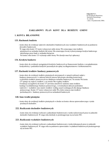 Załącznik Nr 1 do Zarządzenia Burmistrza Kamienia Pomorskiego Nr 483/06 z dnia 24 października 2006r. ZAKŁADOWY PLAN KONT DLA BUDŻETU GMINY 1. KONTA BILANSOWE 133. Rachunek budżetu - konto służy do ewidencji wpływów (dochodów) budżetowych oraz wydatków budżetowych na podstawie dowodów bankowych. W ciągu roku konto 133 może wykazywać saldo strony Wn oznaczające stan środków pieniężnych na rachunku budżetu lub strony Ma oznaczające kwotę wykorzystanego kredytu bankowego udzielonego przez bank w rachunku bieżącym. Na koniec roku konto 133 wykazuje saldo strony Wn (kredyt musi być spłacony). 134. Kredytu bankowe - konto służy do ewidencji zaciągniętych kredytów bankowych na finansowanie budżetu z uwzględnieniem kredytobiorcy i podziałem kredytów pozostałych do spłaty na długoterminowe i krótkoterminowe. 137. Rachunki środków funduszy pomocowych - konto służy do ewidencji środków pieniężnych otrzymanych w ramach realizacji zadań z funduszy pomocowych, w zakresie których umowa lub przepis określają konieczność wydzielenia środków pomocowych na odrębnym rachunku bankowym. Na stronie Wn konta 137 ujmuje się wpływy środków, a na stronie Ma wypłaty środków. Ewidencja szczegółowa do konta 137 powinna umożliwić ustalenie stanu środków każdego wyodrębnionego funduszu pomocowego, z ewentualnym dalszym podziałem wpływów i wydatków oraz stanów środków według zasad wynikających dla danego funduszu pomocowego. Konto 137 może wskazywać saldo Wn, które oznacza stan środków pochodzących z funduszy pomocowych na rachunkach bankowych. 140. Inne środki pieniężne - konto służy do ewidencji środków pieniężnych w drodze na koniec okresu sprawozdawczego z tytułu przelanych dochodów. 222. Rozliczenie dochodów budżetowych - konto służy do ewidencji rozliczeń z jednostkami budżetowymi z tytułu realizowanych przez te jednostki dochodów budżetowych. W ciagu roku dochody te przeksięgowuje się na konto 901. 223. Rozliczenie wydatków budżetowych - konto służy do ewidencji rozliczeń z jednostkami budżetowymi z tytułu dokonanych przez te jednostki wydatków budżetowych. W ciągu roku na podstawie sprawozdań o wydatkach budżetowych przeksiegowuje się na konto 902. 1 224. Rozrachunki budżetu - konto służy do ewidencji wszelkich rozrachunków dotyczacych budżetu gminy, a w szczególności: rozliczeń dochodów budżetowych realizowanych przez urzedy skarbowe z tytułu dotacji, subwencji i dochodów pobranych na rzecz budżetu państwa (analityka wg kontrahentów). 227. Rozliczenie dochodów ze środków funduszy pomocowych - konto służy do ewidencji rozliczeń z jednostkami z tytułu zrealizowanych dochodów dotyczących funduszy pomocowych. Na stronie Wn konta 227 ujmuje się dochody zrealizowane przez jednostkę w wysokości wynikającej z okresowych sprawozdań jednostek, w korespondencji z kontem 907. Na stronie Ma konta 227 ujmuje się przelewy dochodów na rachunek środków funduszy pomocowych, dokonane przez jednostki, które zrealizowały dochody, w korespondencji z kontem 137. Ewidencję szczegółową do konta 227 prowadzi się w sposób umożliwiający ustalenie stanu rozliczeń z poszczególnymi jednostkami z tytułu zrealizowanych przez nie dochodów. Konto 227 może wykazywać dwa salda. Saldo Wn konta 227 oznacza stan dochodów zrealizowanych przez jednostki i objętych okresowymi sprawozdaniami, lecz nie przekazanych na rachunek środków funduszy pomocowych. Saldo Ma konta 227 oznacza stan dochodów przekazanych przez jednostki na rachunek środków funduszy pomocowych, lecz nieobjętych okresowymi sprawozdaniami. 228. Rozliczenie wydatków ze środków funduszy pomocowych - konto służy do ewidencji rozliczeń z jednostkami z tytułu dokonywanych przez te jednostki wydatków ze środków funduszy pomocowych. Na stronie Wn konta 228 ujmuje się środki przelane z rachunków środków funduszy pomocowych na pokrycie wydatków jednostek w korespondencji z kontem 137. Na stronie Ma konta 228 ujmuje się wydatki dokonane przez jednostki w wysokości wynikającej z okresowych sprawozdań tych jednostek, w korespondencji z kontem 908. Ewidencję szczegółową do konta 228 prowadzi się w sposób umożliwiający ustalenie stanu rozliczeń z poszczególnymi jednostkami z tytułu przelanych na rachunki środków przeznaczonych na pokrycie realizowanych przez nie wydatków ze środków funduszy pomocowych. Saldo Wn konta 228 oznacza stan przelanych środków funduszy pomocowych na rachunki jednostek, lecz jeszcze nie wykorzystanych na pokrycie wydatków. 240. Pozostałe rozrachunki - konto służy do ewidencji innych rozrachunków związanych z realizacją budżetu, a w szczególności rozrachunków z bankami z tytułu pomyłek w ewidencji operacji na rachunkach środków pieniężnych, rozrachunków z tutułów wadiów (analityka wg kontrahentów). 260. Zobowiązania finansowe - konto służy do ewidencji zobowiązań zaliczanych do zobowiazań finansowych, z wyjątkiem kredytów bankowych, a w szczególności z tytułu zaciągniętych pożyczek i wyemitowanych instrumentów finansowych (analityka wg kontrahentów). 901. Dochody budżetu - konto służy do ewidencji osiągniętych dochodów budżetu gminy (analityka konta umożliwia ustalenie stanu poszczególnych dochodów budżetu wg klasyfikacji budżetowej). Pod datą ostatniego dnia roku budżetowego saldo konta 901 przenosi się na konto 961. 2 902. Wydatki budżetu - konto służy do ewidencji dokonanych wydatków budżetowych budżetu gminy i jednostek budżetowych. Analityka do tego konta jest prowadzona na koncie 130 Urzedu Miejskiego i również w poszczególnych jednostkach budżetowych . Pod datą ostatniego dnia roku budżetowego saldo konta 902 przenosi się na konto 961. 907. Dochody z funduszy pomocowych - konto służy do ewidencji osiągniętych dochodów z tytułu realizacji funduszy pomocowych Na stronie Wn konta 907 u