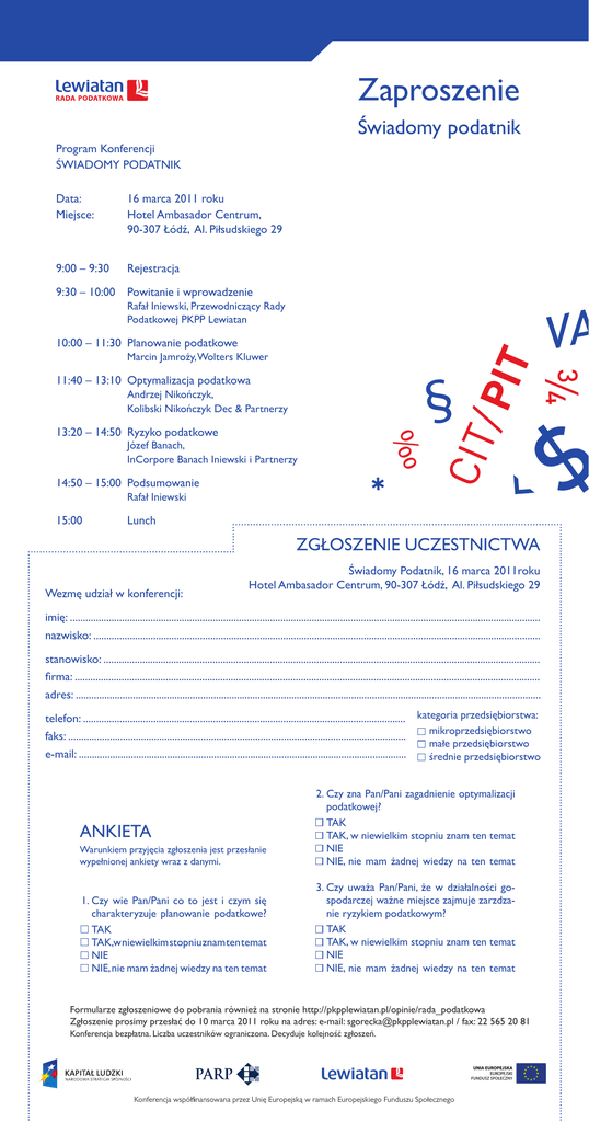 Zaproszenie Świadomy podatnik Program Konferencji ŚWIADOMY PODATNIK Data: Miejsce: 16 marca 2011 roku Hotel Ambasador Centrum, 90-307 Łódź, Al. Piłsudskiego 29 9:00 – 9:30 Rejestracja 9:30 – 10:00 Powitanie i wprowadzenie Rafał Iniewski, Przewodniczący Rady Podatkowej PKPP Lewiatan 10:00 – 11:30 Planowanie podatkowe Marcin Jamroży, Wolters Kluwer 11:40 – 13:10 Optymalizacja podatkowa Andrzej Nikończyk, Kolibski Nikończyk Dec & Partnerzy 13:20 – 14:50 Ryzyko podatkowe Józef Banach, InCorpore Banach Iniewski i Partnerzy 14:50 – 15:00 Podsumowanie Rafał Iniewski 15:00 Lunch ZGŁOSZENIE UCZESTNICTWA Wezmę udział w konferencji: Świadomy Podatnik, 16 marca 2011roku Hotel Ambasador Centrum, 90-307 Łódź, Al. Piłsudskiego 29 imię: ..................................................................................................................................................................................... nazwisko: ............................................................................................................................................................................ stanowisko: ........................................................................................................................................................................ firma: ................................................................................................................................................................................... adres: ................................................................................................................................................................................... telefon: ............................................................................................................................ kategoria przedsiębiorstwa: mikroprzedsiębiorstwo faks: .................................................................................................................................. małe przedsiębiorstwo e-mail: .............................................................................................................................. średnie przedsiębiorstwo Warunkiem przyjęcia zgłoszenia jest przesłanie wypełnionej ankiety wraz z danymi. 2. Czy zna Pan/Pani zagadnienie optymalizacji podatkowej? TAK TAK, w niewielkim stopniu znam ten temat NIE NIE, nie mam żadnej wiedzy na ten temat 1. Czy wie Pan/Pani co to jest i czym się charakteryzuje planowanie podatkowe? TAK TAK,w niewielkim stopniu znam ten temat NIE NIE, nie mam żadnej wiedzy na ten temat 3. Czy uważa Pan/Pani, że w działalności gospodarczej ważne miejsce zajmuje zarzdzanie ryzykiem podatkowym? TAK TAK, w niewielkim stopniu znam ten temat NIE NIE, nie mam żadnej wiedzy na ten temat ANKIETA Formularze zgłoszeniowe do pobrania również na stronie http://pkpplewiatan.pl/opinie/rada_podatkowa Zgłoszenie prosimy przesłać do 10 marca 2011 roku na adres: e-mail: [email protected] / fax: 22 565 20 81 Konferencja bezpłatna. Liczba uczestników ograniczona. Decyduje kolejność zgłoszeń. Konferencja współfinansowana przez Unię Europejską w ramach Europejskiego Funduszu Społecznego