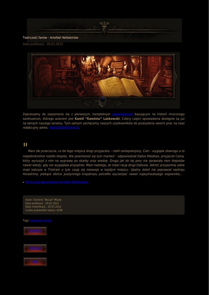Twórczość fanów - Artefakt Nefalemów Data publikacji : 29.01.2012 Zapraszamy do zapoznania się z pierwszym, kompletnym opowiadaniem bazującym na historii mrocznego sanktuarium, którego autorem jest Kamil ”Kaminiu” Laskowski. Cztery części opowiadania dostępne są już na łamach naszego serwisu. Tym samym zachęcamy naszych użytkowników do przesyłania swoich prac na nasz redakcyjny adres: [email protected]. " Mam złe przeczucia, co do tego miejsca drogi przyjacielu - rzekł zaniepokojony, Cain - wygląda złowrogo a to niejednokrotnie rodziło kłopoty. Nie powinieneś się tym martwić - odpowiedział Dallus Malahan, przyjaciel Caina, który wyruszył z nim na wyprawę po skarby oraz wiedzę. Droga jak do tej pory nie sprawiała nam kłopotów nawet wtedy, gdy nie wyglądała przyjaźnie. Mam nadzieję, że masz rację drogi Dallusie, ilekroć przypomnę sobie moje katusze w Tristram o tyle czuję się nieswojo w każdym miejscu. Upalny dzień nie poprawiał nastroju Horadrima, piekące słońce pustynnego krajobrazu potrafiło wyczerpać nawet najwytrwalszego wojownika... ● Przeczytaj opowiadanie Artefakt Nefalemów. Autor: Dominik "BeLial" Misiak Data publikacji : 29.01.2012 Data modyfikacji : 29.01.2012 Liczba wyświetleń tekstu: 4298 Tagi: twórczość fanów POWRÓT DRUKUJ PDF POLEĆ ZNAJOMEMU Komentarz (9) dodaj komentarz No no. Super:) Gratuluje~Constantine 2012/01/29 20:16 Gratulacje dla autora~baq172 2012/01/29 20:33 Nie wiem czy było. Pobije ktoś? :P http://www.xtremesystems.org/forums/showthread.php?278399-ASUS-ROG-TJ11-Diablo-III-Edtion.~midzi 2012/01/29 22:14 http://www.youtube.com/watch?v=F2oCc9gzEl0&feature=related diablo2 w wersji anime...~Duriel 2012/01/29 23:11 Jeżeli redakcja nie ma nic przeciwko byłbym skłonny napisać więcej opowiadań, nie wiem tylko czy jest to dozwolone?~Kaminiu 2012/01/29 23:46 Ja pierniczę ta maszyna jest epicka ! A opowiadanie też zacne :P~Edi-WM2012/01/30 00:13 @Duriel strasznie to słabe:p @midzi rozbawiło mnie ostatnie zdjęcie jak ten koleś przytula tą obudowę:)~Tybald 2012/01/30 09:06 Duriel ktoś już to wcześniej dal :) Ktoś coś wie, o tym wprowadzeniu tego salda na BN ?~PlsDontLie 2012/01/30 09:39 Prezentacja jak w praktyce działa nowy system bnetu mający zapobiegać występowanie lagu w porównaniu do D2. http://www.youtube.com/watch?v=4G5SGG2zUTw&feature=player_embedded Na moim słabym łączu, gdzie miałem pewnie około 300-350ms (chociaż ten wskaźnik z D3 tylko pobieżnie pokazuje opóźnienie, nie jest to polecenie ping, w cmd:) ) dało się bez problemu grać, ale jakieś tam opóźnienie dało się wyczuć. Szczególnie przy rozwalaniu skrzyń, itp, koleś w filmiku z resztą o tym wspomina. Mam nadzieję, że po wprowadzeniu serwerów w europie, ten problem praktycznie zniknie.~Pedroxx 2012/01/30 09:56 dodaj komentarz
