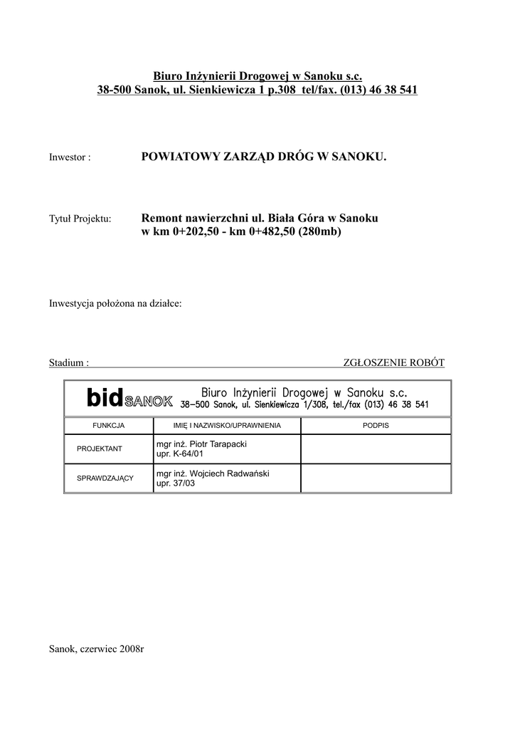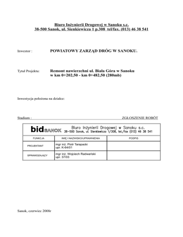 Biuro InŜynierii Drogowej w Sanoku s.c. 38-500 Sanok, ul. Sienkiewicza 1 p.308 tel/fax. (013) 46 38 541 Inwestor : POWIATOWY ZARZĄD DRÓG W SANOKU. Tytuł Projektu: Remont nawierzchni ul. Biała Góra w Sanoku w km 0+202,50 - km 0+482,50 (280mb) Inwestycja połoŜona na działce: Stadium : ZGŁOSZENIE ROBÓT FUNKCJA IMIĘ I NAZWISKO/UPRAWNIENIA PROJEKTANT mgr inŜ. Piotr Tarapacki upr. K-64/01 SPRAWDZAJĄCY mgr inŜ. Wojciech Radwański upr. 37/03 Sanok, czerwiec 2008r PODPIS CZĘŚĆ OPISOWA : Spis zawartości : Dokumenty ogólne 1.1 Orientacja - skala 1:10000 1.2 Wyrys z mapy ewidencyjnej 1.3 Wypis z rejestru gruntów 1.4 Uprawnienia projektantów 1.5 Plan BIOS 1.6 Oświadczenie projektanta 2. Część opisowa 2.1 Opis techniczny 2.2 Rozwiązania konstrukcyjno – materiałowe podstawowych elementów konstrukcyjnych i sposób ich wykonania. 3.Rysunki budowlano-konstrukcyjne 3.1 Plan sytuacyjny – stan projektowany 3.3 Przekroje typowe ` skala 1:500 skala 1:50 Część opisowa: Opis techniczny a) Przedmiot, podstawa, zakres i cel opracowania. Przedmiotem opracowania jest wykonanie projektu remontu nawierzchni ulicy Biała Góra w miejscowości Sanok. Podstawa opracowania: - plan sytuacyjno wysokościowy - skala 1:500 - umowa pomiędzy Powiatowym Zarządem Dróg a BID s.c. Sanok - wizja lokalna i pomiary w terenie - Dz.U. nr 43 z dnia 14.05.1999r - „Warunki techniczne jakim powinny odpowiadać drogi publiczne i ich usytuowanie”, Instrukcja oznakowania robót prowadzonych w pasie drogowym i literatura techniczna Zakres opracowania obejmuje rysunki konstrukcyjne, opis wykonania remontu nawierzchni ulicy, przedmiar robót Celem opracowania jest poprawienie warunków dla poruszania się pojazdów i pieszych wzdłuŜ ulicy Biała Góra w Sanoku b) Lokalizacja i usytuowanie Przedmiotowa ulica znajduje się za mostem białogórskim na terenach potocznie nazywanych Biała Góra w Sanoku c) Dane techniczne : -szerokość ulicy : od 5,00 do 6,00 m -długość ulicy: – 280 mb -nawierzchnia ulicy : beton asfaltowy gr. 5cm d) Stan istniejący i projektowany : Stan istniejący. Przedmiotowy odcinek ul. Biała Góra (pierwsze 300 m za mostem) jest w bardzo złym stanie technicznym. Nawierzchnia posiada liczne ubytki jest nierówna i popękana. W licznych ubytkach znalazły miejsce zastoiska wody. Pojazdy poruszają się bardzo wolno. Na remontowanym odcinku występuje zabudowa jednorodzinna i obiekty uŜyteczności publicznej (restauracje). Wody opadowe są odprowadzane w przyległy teren. Stan projektowany Stan projektowany zakłada remont istniejącej nawierzchni poprzez uzupełnieni istniejących ubytków masą mineralno bitumiczną i wykonanie nawierzchni z betonu asfaltowego. Dla wykonania remontu nawierzchni: - wykonać oznakowanie robót drogowych zgodnie z projektem organizacji ruchu na czas wykonywania robót - wyznaczyć geodezyjnie punkty i linie charakterystyczne ulicy -wykonać roboty przygotowawcze (roboty rozbiórkowe wykonać koryto pod poszerzenie, wykopy pod studnie chłonną) - wykonać warstwy konstrukcyjne poszerzenia i studnie chłonną -ustawić krawęŜniki i ściek - wykonać uzupełnienie ubytków i nawierzchnię - uporządkować teren budowy i wykonać inwentaryzację podwykonawczą W miejscu remontowanej ulicy załoŜono regulacje wysokości istniejących studzienek telekomunikacyjnych, ściekowych, zaworów wodnych i gazowych. 2.2 Rozwiązania konstrukcyjno – materiałowe podstawowych elementów konstrukcyjnych i sposób ich wykonania: 2.2.1 Przekrój typowy: Zaprojektowano przekrój daszkowy i jednostronny \ o spadku 1-2% Konstrukcja nawierzchni chodnika: − przyjęto zgodnie z Rozporządzeniem Ministra Transportu i Gospodarki Morskiej z dnia 2 marca 1999r w sprawie warunków technicznych, jakim powinny odpowiadać drogi publiczne i ich usytuowanie I KONSTRUKCJA NAWIERZCHNI NA IST. NAWIERZCHNI BITUMICZNEJ. W-wa ścieralna Beton asfaltowy - gr. 5cm W-wa profilowa Beton asfaltowy - gr. 0-2cm II KONSTRUKCJA NAWIERZCHNI NA POSZERZENIU W-wa ścieralna Beton asfaltowy - gr. 5cm W-wa wiąŜąca Beton asfaltowy - gr. 5cm W-wa podbudowy Beton asfaltowy - gr. 7cm W-wa podbudowy z kruszywa łamanego stab. mech gr. 20cm W-wa mrozoochrona z kruszywa naturalnego stab mech gr. 25cm 3. Uwagi końcowe Wszelkie prace naleŜy prowadzić zgodnie z przepisami BHP. Przed przystąpieniem do robót naleŜy opracować i zatwierdzić projekt organizacji ruchu na czas wykonywania remontu.