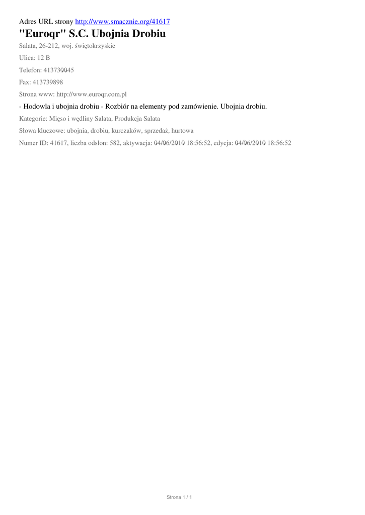 Adres URL strony http://www.smacznie.org/41617 "Euroqr" S.C. Ubojnia Drobiu Salata, 26-212, woj. świętokrzyskie Ulica: 12 B Telefon: 413730045 Fax: 413739898 Strona www: http://www.euroqr.com.pl - Hodowla i ubojnia drobiu - Rozbiór na elementy pod zamówienie. Ubojnia drobiu. Kategorie: Mięso i wędliny Salata, Produkcja Salata Słowa kluczowe: ubojnia, drobiu, kurczaków, sprzedaż, hurtowa Numer ID: 41617, liczba odsłon: 582, aktywacja: 04/06/2010 18:56:52, edycja: 04/06/2010 18:56:52 Strona 1 / 1
