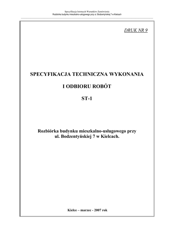 Specyfikacja Istotnych Warunków Zamówienia Rozbiórka budynku mieszkalno-usługowego przy ul. Bodzentyńskiej 7 w Kielcach _________________________________________________________________________________________________________________ DRUK NR 9 SPECYFIKACJA TECHNICZNA WYKONANIA I ODBIORU ROBÓT ST-1 Rozbiórka budynku mieszkalno-usługowego przy ul. Bodzentyńskiej 7 w Kielcach. Kielce – marzec - 2007 rok Specyfikacja Istotnych Warunków Zamówienia Rozbiórka budynku mieszkalno-usługowego przy ul. Bodzentyńskiej 7 w Kielcach _________________________________________________________________________________________________________________ DOKUMENTACJA PROJEKTOWO - KOSZTORYSOWA ROZBIÓRKI BUDYNKÓW PRZY UL. BODZENTYŃSKIEJ 7 W KIELCACH Dział 2 SPECYFIKACJA TECHNICZNA WYKONANIA I ODBIORU ROBÓT BUDOWLANYCH NAZWA I KOD ROBÓT: Roboty w zakresie burzenia, roboty ziemne - kod CPV 45111000-8 OBIEKT BUDOWLANY: Budynki mieszkalny i usługowy Kielce, ul. Bodzentyńska 7 ZAMAWIAJĄCY: Miejski Zarząd Budynków ul. Paderewskiego 20 25-004 Kielce PRACOWNIA PROJEKTOWA: PBUT ZIMEX ul. Kopernika 19 25-336 Kielce tel. 0-41-368 23 58 Funkcja: Tytuł, imię i nazwisko Nr uprawnień Kierownik zespołu – projektant: prof.dr hab.inŜ. Jerzy Zb. Piotrowski UW-3/92 KL-90/90 Kielce, 27 lutego 2007 r. Podpis Specyfikacja Istotnych Warunków Zamówienia Rozbiórka budynku mieszkalno-usługowego przy ul. Bodzentyńskiej 7 w Kielcach _________________________________________________________________________________________________________________ I. CZĘŚĆ OGÓLNA 1. Nazwa zamówienia Wykonanie rozbiórki budynku mieszkalnego i budynku usługowego zlokalizowanych przy ulicy Bodzentyńskiej 7 w Kielcach, oznaczonych na mapie sytuacyjnej kolorem zielonym . 2. Przedmiot i zakres robót budowlanych Przedmiotem zamówienia jest wykonanie robót budowlanych w zakresie wyburzenia budynku mieszkalnego i budynku usługowego zlokalizowanych przy ulicy Bodzentyńskiej 7 w Kielcach, przy wschodniej granicy działki. 3. Zakres stosowania Specyfikacji Technicznej Wykonania i Odbioru Robót Budowlanych Specyfikacja Techniczna jest stosowana jako dokument przetargowy i kontraktowy przy zleceniu i realizacji robót objętych zamówieniem. 4. Informacje o terenie rozbiórki 4.1. Charakterystyka obiektu Nieruchomość budowlana zlokalizowana jest przy ulicy Bodzentyńskiej 7 w Kielcach. Budynki mieszkalny i usługowy przeznaczone do rozbiórki zlokalizowane są przy wschodniej granicy działki i przylegają do budynku na posesji sąsiedniej. Budynek mieszkalny do rozbiórki jest nie uŜytkowany, dwukondygnacyjny, murowany, z poddaszem uŜytkowym, podpiwniczony. Dachem drewnianym jednospadowym krytym papą. Zlokalizowany jest bezpośrednio wschodniej granicy nieruchomości i przylega do ściany budynku na posesji sąsiedniej, a ścianą szczytową południową przylega do sąsiedniego budynku usługowego, który równieŜ jest przeznaczony do rozbiórki. Budynek usługowy jest parterowy z poddaszem nieuŜytkowym, bez podpiwniczenia i równieŜ przylega do budynku na posesji sąsiedniej. Nieruchomość przedmiotowa nie jest ogrodzona i istniej łatwy dostęp osób postronnych do groŜących zwaleniem budynków. 4.2. Przekazanie terenu rozbiórki Wykonawca w terminie określonym w umowie przejmuje od Zamawiającego teren z obiektami do wykonania robót rozbiórkowych. Zamawiający wskaŜe Wykonawcy miejsce poboru energii elektrycznej dla celów robót budowlanych. Wykonawca ponosi pełne koszty ew. korzystania z energii elektrycznej. W przypadku braku moŜliwości technicznych Wykonawca zapewni we własnym zakresie energię elektryczną potrzebną dla celów robót budowlanych (np. agregat prądotwórczy). 4.3. Zabezpieczenie terenu rozbiórki Wykonawca jest zobowiązany do wykonania odpowiednich zabezpieczeń w okresie trwania realizacji kontraktu aŜ do zakończenia i odbioru końcowego robót. Teren, na którym prowadzone będą roboty rozbiórkowe obiektów budowlanych, naleŜy trwale ogrodzić i oznakować tablicami ostrzegawczymi, a takŜe urządzić zaplecze. Wykonawca dostarczy, zainstaluje i będzie utrzymywać wszelkie środki niezbędne do ochrony robót, wygody społeczności i innych. 4.4. Ochrona środowiska w czasie wykonywania robót Wykonawca ma obowiązek znać i stosować w czasie prowadzenia robót wszelkie przepisy dotyczące ochrony środowiska naturalnego. Materiały bitumiczne i zawierające azbest naleŜy przekazać do utylizacji wyspecjalizowanym firmom. W okresie trwania robót Wykonawca będzie podejmować wszelkie uzasadnione kroki mające na celu stosowanie się do przepisów i norm dotyczących ochrony środowiska na terenie działki oraz będzie unikać uszkodzeń lub uciąŜliwości dla osób trzecich lub dóbr publicznych i innych, a wynikających z nadmiernego hałasu, wibracji, zanieczyszczenia lub innych przyczyn powstałych w następstwie jego sposobu działania. Stosując się do tych wymagań będzie miał szczególny wzgląd Specyfikacja Istotnych Warunków Zamówienia Rozbiórka budynku mieszkalno-usługowego przy ul. Bodzentyńskiej 7 w Kielcach _________________________________________________________________________________________________________________ na środki ostroŜności i zabezpieczenia przed: zanieczyszczeniem zbiorników i cieków wodnych pyłami lub substancjami toksycznymi, zanieczyszczeniem powietrza pyłami i gazami oraz moŜliwością powstania poŜaru. Wykonawca będzie przestrzegać przepisów o ochronie przeciwpoŜarowej. Materiały łatwopalne będą składowane przez Wykonawcę w sposób zgodny z odpowiednimi przepisami i zabezpieczone przed dostępem osób trzecich. Wykonawca będzie odpowiedzialny za wszelkie straty spowodowane poŜarem wywołanym jako rezultat realizacji robót albo przez personel Wykonawcy. 4.5. Bezpieczeństwo i higiena pracy Podczas realizacji robót Wykonawca będzie przestrzegać przepisów dotyczących bezpieczeństwa i higieny pracy.