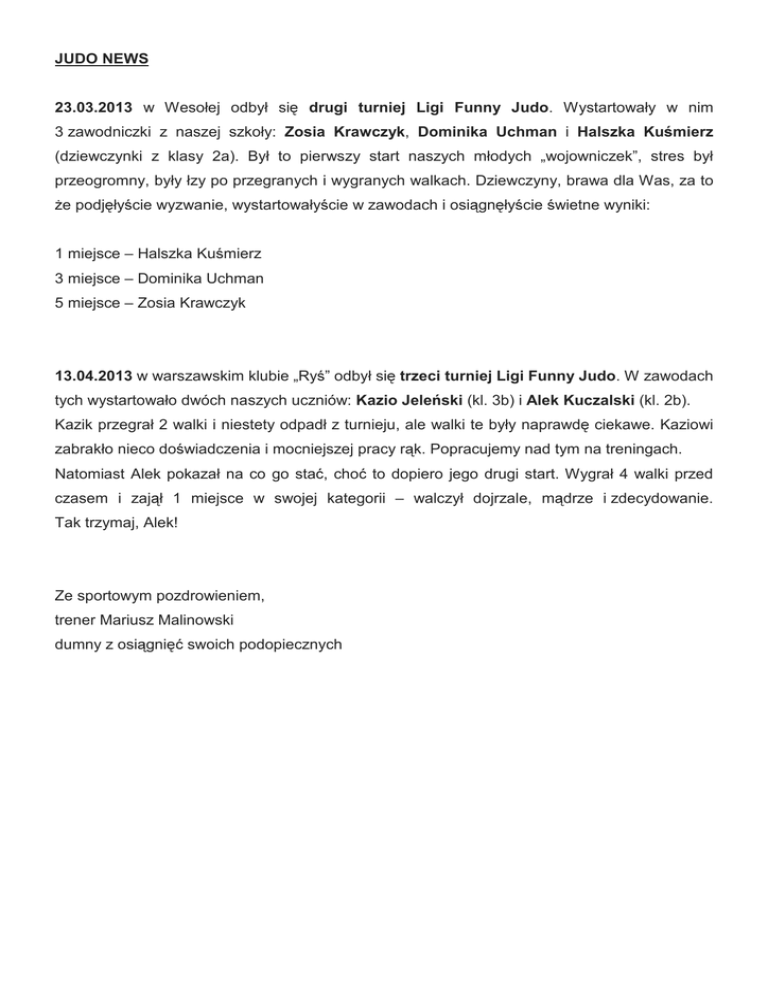 JUDO NEWS 23.03.2013 w Wesołej odbył się drugi turniej Ligi Funny Judo. Wystartowały w nim 3 zawodniczki z naszej szkoły: Zosia Krawczyk, Dominika Uchman i Halszka Kuśmierz (dziewczynki z klasy 2a). Był to pierwszy start naszych młodych „wojowniczek”, stres był przeogromny, były łzy po przegranych i wygranych walkach. Dziewczyny, brawa dla Was, za to że podjęłyście wyzwanie, wystartowałyście w zawodach i osiągnęłyście świetne wyniki: 1 miejsce – Halszka Kuśmierz 3 miejsce – Dominika Uchman 5 miejsce – Zosia Krawczyk 13.04.2013 w warszawskim klubie „Ryś” odbył się trzeci turniej Ligi Funny Judo. W zawodach tych wystartowało dwóch naszych uczniów: Kazio Jeleński (kl. 3b) i Alek Kuczalski (kl. 2b). Kazik przegrał 2 walki i niestety odpadł z turnieju, ale walki te były naprawdę ciekawe. Kaziowi zabrakło nieco doświadczenia i mocniejszej pracy rąk. Popracujemy nad tym na treningach. Natomiast Alek pokazał na co go stać, choć to dopiero jego drugi start. Wygrał 4 walki przed czasem i zajął 1 miejsce w swojej kategorii – walczył dojrzale, mądrze i zdecydowanie. Tak trzymaj, Alek! Ze sportowym pozdrowieniem, trener Mariusz Malinowski dumny z osiągnięć swoich podopiecznych