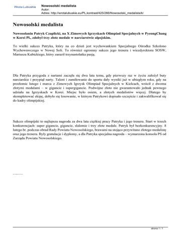 Nowosolski medalista Autor: Adres: http://wrotalubuskie.eu/PL,kontrast/425/266/Nowosolski_medalista/k/ Nowosolski medalista Nowosolanin Patryk Czaplicki, na X Zimowych Igrzyskach Olimpiad Specjalnych w PyeongChang w Korei Pł., zdobył trzy złote medale w narciarstwie alpejskim. To wielki sukces Patryka, który na co dzień jest wychowankiem Specjalnego Ośrodka Szkolono Wychowawczego w Nowej Soli. To również ogromny sukces jego trenera i wicedyrektora SOSW, Mariusza Kubickiego, który zaraził trzynastolatka pasją. Dla Patryka przygoda z nartami zaczęła się dwa lata temu, gdy pierwszy raz w życiu założył buty narciarskie i przypiął narty. Talent i zamiłowanie do sportu dały wyniki już w ubiegłym roku, gdy na przełomie lutego i marca z Zimowych Igrzysk Olimpiad Specjalnych w Kielcach, wrócił z dwoma złotymi medalami – w gigancie i supergigancie. Podwójne złoto nie gwarantowało jednak pewnego udziału na Igrzyskach w Korei. Miejsc było osiem, a złotych medalistów więcej. Dlatego by skompletować ekipę, dobyło się losowanie, w którym Patrykowi dopisało szczęście i zakwalifikował się do kadry olimpijskiej. Sukces olimpijski to najlepsza nagroda za dwa lata ciężkiej pracy Patryka i jego trenera. Start w trzech konkurencjach: super gigancie, gigancie, slalomie i trzy złote medale. Patryk był bezkonkurencyjny. 8 lutego br. podczas obrad Rady Powiatu Nowosolskiego, brawami na stojąco przywitano złotego medalistę oraz jego trenera. Były gratulacje i dyplomy, a dla Patryka specjalna nagroda – wymarzona konsola PS od Zarządu Powiatu Nowosolskiego. tekst: Małgorzata Grotowska strona 1 / 1 Powered by TCPDF (www.tcpdf.org)