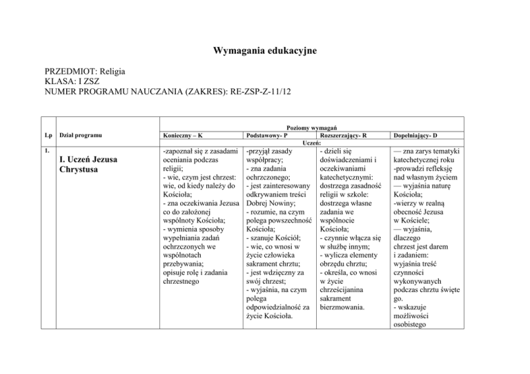 Wymagania edukacyjne PRZEDMIOT: Religia KLASA: I ZSZ NUMER PROGRAMU NAUCZANIA (ZAKRES): RE-ZSP-Z-11/12 Lp Dział programu 1. I. Uczeń Jezusa Chrystusa Konieczny – K -zapoznał się z zasadami oceniania podczas religii; - wie, czym jest chrzest: wie, od kiedy należy do Kościoła; - zna oczekiwania Jezusa co do założonej wspólnoty Kościoła; - wymienia sposoby wypełniania zadań ochrzczonych we wspólnotach przebywania; opisuje rolę i zadania chrzestnego Poziomy wymagań Podstawowy- P Rozszerzający- R Uczeń: -przyjął zasady współpracy; - zna zadania ochrzczonego; - jest zainteresowany odkrywaniem treści Dobrej Nowiny; - rozumie, na czym polega powszechność Kościoła; - szanuje Kościół; - wie, co wnosi w życie człowieka sakrament chrztu; - jest wdzięczny za swój chrzest; - wyjaśnia, na czym polega odpowiedzialność za życie Kościoła. - dzieli się doświadczeniami i oczekiwaniami katechetycznymi: dostrzega zasadność religii w szkole: dostrzega własne zadania we wspólnocie Kościoła; - czynnie włącza się w służbę innym; - wylicza elementy obrzędu chrztu; - określa, co wnosi w życie chrześcijanina sakrament bierzmowania. Dopełniający- D — zna zarys tematyki katechetycznej roku -prowadzi refleksję nad własnym życiem — wyjaśnia naturę Kościoła; -wierzy w realną obecność Jezusa w Kościele; — wyjaśnia, dlaczego chrzest jest darem i zadaniem: wyjaśnia treść czynności wykonywanych podczas chrztu święte go. - wskazuje możliwości osobistego 2. II. Świat człowieka i Boga -rozumie, na czym polega życie wiarą; -interpretuje, dlaczego Abrahama uznajemy za ojca wszystkich wierzących; - wyjaśnia termin ekumenizm; - wyjaśnia, czym jest nadprzyrodzone objawienie; - tłumaczy, dlaczego człowiek powinien odpowiedzieć na inicjatywę Boga; - wyjaśnia, w jaki sposób człowiek może odpowiedzieć na usłyszane Słowo Boga; - opowiada, jakiego Boga przedstawia nam Jezus; - wie, kto jest autorem Pisma świętego; - wyjaśnia, czym jest natchnienie Boże; - wie, co Bóg oferuje człowiekowi, co obiecuje, do czego zaprasza; - stara się poznawać Boga; - wyjaśnia, dlaczego człowiek poszukuje Boga; - wymienia religie chrześcijańskie; - wie, co wyróżnia chrześcijaństwo spośród innych religii; - wie, w jaki sposób Bóg mówi o Sobie; - wierzy Słowu Bożemu; - tłumaczy, na czym polega pełne objawienie w Jezusie; - wierzy w bóstwo Jezusa; - wie, co najważniejszego wnosi Jezus w życie człowieka; - uznaje pośrednictwo Jezusa w objawieniu Boga; - wylicza etapy powstawania Biblii; - wierzy w - wyjaśnia, dlaczego Boga można poznać na podstawie rzeczy stworzonych; - wskazuje przykłady religii niechrześcijańskich; - opisuje, jakiego Boga poznajemy za pośrednictwem Mojżesza; - wie, o czym świadczy postawa dialogu Boga i człowieka; - wyjaśnia treść Prologu św. Jana; - dostrzega, w czym przejawia się prawda, że Jezus jest szczytem Objawienia; - wyjaśnia poznany fragment Listu do Hebrajczyków; - uzasadnia, na jakiej podstawie twierdzimy, że Jezus odsłania tajemnicę Boga; świadectwa we wspólnocie Kościoła. - interpretuje, dlaczego człowiek jest drogą poznania Boga; - wymienia przyczyny niewiary; - publicznie wyznaje wiarę; - uzasadnia wartość dialogu międzyreligijnego; - rozpoznaje Boga zatroskanego o los człowieka; - określa kolejne etapy dialogu Boga z człowiekiem; - wskazuje, jakie trudności mogą być spotykane w procesie uznania Jezusa jako Boga; 3. III. Bóg obietnic -wie, czym jest modlitwa. możliwość życia wiecznego w niebie; - wyjaśnia, jaka powinna być modlitwa; - modli się. - uzasadnia, skąd istnieje w człowieku dobro; - wyjaśnia określenie człowiek sumienia; - opisuje, czym jest sumienie; - wie, z jakim religijnym przesłaniem zwracają się chrześcijanie do swego otoczenia w okresie adwentu; - opowiada, jak chrzcścijanin powinien postrzegać swoją pracę; - wyjaśnia termin własność; - rozumie, dlaczego Bóg i Kościół staje w obronie własności; - wskazuje, jakie postawy i w jaki sposób - rozumie termin dobro; -troszczy się o dobro; - opisuje, dlaczego koniecznie należy czynić dobro; - rozumie, dlaczego chrześcijanin powinien być „człowiekiem sumienia”; - rozpoznaje źródło zła; - podejmuje chrześcijańskie przeżywanie adwentu; - wyjaśnia, jakie prawa i obowiązki posiadają względem siebie pracodawca i pracownik; - słucha orędzia ewangelicznego podczas zgromadzeń liturgicznych; - opowiada wybrane teksty biblijne o modlitwie; - określa miejsca, w których należy się modlić. - wyjaśnia pojęcie prawda; - opisuje, na jakiej podstawie twierdzimy, że Bóg jest dobrem prawdą; - kształtuje własną postawę rozprzestrzeniania dobra; - troszczy się o formację sumienia; - wyjaśnia określenie dwa biblijne adwenty; - opisuje, na czym polega dewaluacja ludzkiej pracy; - wie, w imię jakich wartości Kościół angażuje się w sprawy związane z - poszukuje prawdy i dobra; - formuje umiejętność życia w prawdzie; - przytacza fragmenty biblijne uzasadniające potrzebę czynienia dobra; - wyjaśnia, jaki jest sens ludzkiej pracy; - poznał treść wybranych fragmentów z Laborem exercens - wie, dlaczego chrześcijanie są szczególnie wezwani do poszanowania pracy: - tłumaczy, na jaki zasadniczy motyw-po 4. IV. Bóg dal swego Syna dla zbawienia człowieka są szkodliwe wobec własności. - opisuje, co Kościół ma do zaoferowania ludzkości w sprawach odnoszących się do własności. ludzką pracą; - uzasadnia relacje przykazań Bożych i własności. wód angażowania się Kościoła w sprawy społeczne można wskazać na podstawie analizowanych tekstów Laborem exercens - zna religijny wymiar świąt Bożego Narodzenia; - opowiada o trosce Boga do człowieka; - wylicza nabożeństwa Wielkiego Postu; - wyjaśnia, co dokonało się w święto Paschy; - uczestniczy w liturgii paschalnej; - zna formułę sakramentalnego Pojednania i poku