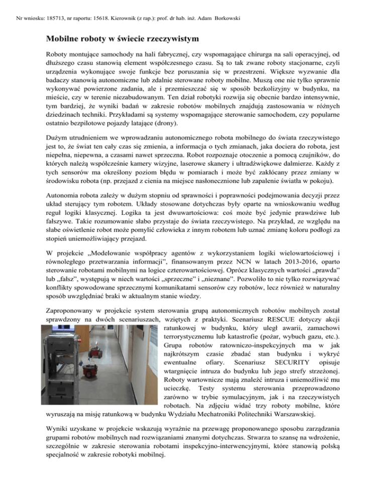 Nr wniosku: 185713, nr raportu: 15618. Kierownik (z rap.): prof. dr hab. inż. Adam Borkowski Mobilne roboty w świecie rzeczywistym Roboty montujące samochody na hali fabrycznej, czy wspomagające chirurga na sali operacyjnej, od dłuższego czasu stanowią element współczesnego czasu. Są to tak zwane roboty stacjonarne, czyli urządzenia wykonujące swoje funkcje bez poruszania się w przestrzeni. Większe wyzwanie dla badaczy stanowią autonomiczne lub zdalnie sterowane roboty mobilne. Muszą one nie tylko sprawnie wykonywać powierzone zadania, ale i przemieszczać się w sposób bezkolizyjny w budynku, na mieście, czy w terenie niezabudowanym. Ten dział robotyki rozwija się obecnie bardzo intensywnie, tym bardziej, że wyniki badań w zakresie robotów mobilnych znajdują zastosowania w różnych dziedzinach techniki. Przykładami są systemy wspomagające sterowanie samochodem, czy popularne ostatnio bezpilotowe pojazdy latające (drony). Dużym utrudnieniem we wprowadzaniu autonomicznego robota mobilnego do świata rzeczywistego jest to, że świat ten cały czas się zmienia, a informacja o tych zmianach, jaka dociera do robota, jest niepełna, niepewna, a czasami nawet sprzeczna. Robot rozpoznaje otoczenie a pomocą czujników, do których należą współcześnie kamery wizyjne, laserowe skanery i ultradźwiękowe dalmierze. Każdy z tych sensorów ma określony poziom błędu w pomiarach i może być zakłócany przez zmiany w środowisku robota (np. przejazd z cienia na miejsce nasłonecznione lub zapalenie światła w pokoju). Autonomia robota zależy w dużym stopniu od sprawności i poprawności podejmowania decyzji przez układ sterujący tym robotem. Układy stosowane dotychczas były oparte na wnioskowaniu według reguł logiki klasycznej. Logika ta jest dwuwartościowa: coś może być jedynie prawdziwe lub fałszywe. Takie rozumowanie słabo przystaje do świata rzeczywistego. Na przykład, ze względu na słabe oświetlenie robot może pomylić człowieka z innym robotem lub uznać zmianę koloru podłogi za stopień uniemożliwiający przejazd. W projekcie „Modelowanie współpracy agentów z wykorzystaniem logiki wielowartościowej i równoległego przetwarzania informacji”, finansowanym przez NCN w latach 2013-2016, oparto sterowanie robotami mobilnymi na logice czterowartościowej. Oprócz klasycznych wartości „prawda” lub „fałsz”, występują w niech wartości „sprzeczne” i „nieznane”. Pozwoliło to nie tylko rozwiązywać konflikty spowodowane sprzecznymi komunikatami sensorów czy robotów, lecz również w naturalny sposób uwzględniać braki w aktualnym stanie wiedzy. Zaproponowany w projekcie system sterowania grupą autonomicznych robotów mobilnych został sprawdzony na dwóch scenariuszach, wziętych z praktyki. Scenariusz RESCUE dotyczy akcji ratunkowej w budynku, który uległ awarii, zamachowi terrorystycznemu lub katastrofie (pożar, wybuch gazu, etc.). Grupa robotów ratowniczo-inspekcyjnych ma w jak najkrótszym czasie zbadać stan budynku i wykryć ewentualne ofiary. Scenariusz SECURITY opisuje wtargnięcie intruza do budynku lub jego strefy strzeżonej. Roboty wartownicze mają znaleźć intruza i uniemożliwić mu ucieczkę. Testy systemu sterowania przeprowadzono zarówno w trybie symulacyjnym, jak i na rzeczywistych robotach. Na zdjęciu widać trzy roboty mobilne, które wyruszają na misję ratunkową w budynku Wydziału Mechatroniki Politechniki Warszawskiej. Wyniki uzyskane w projekcie wskazują wyraźnie na przewagę proponowanego sposobu zarządzania grupami robotów mobilnych nad rozwiązaniami znanymi dotychczas. Stwarza to szansę na wdrożenie, szczególnie w zakresie sterowania robotami inspekcyjno-interwencyjnymi, które stanowią polską specjalność w zakresie robotyki mobilnej.