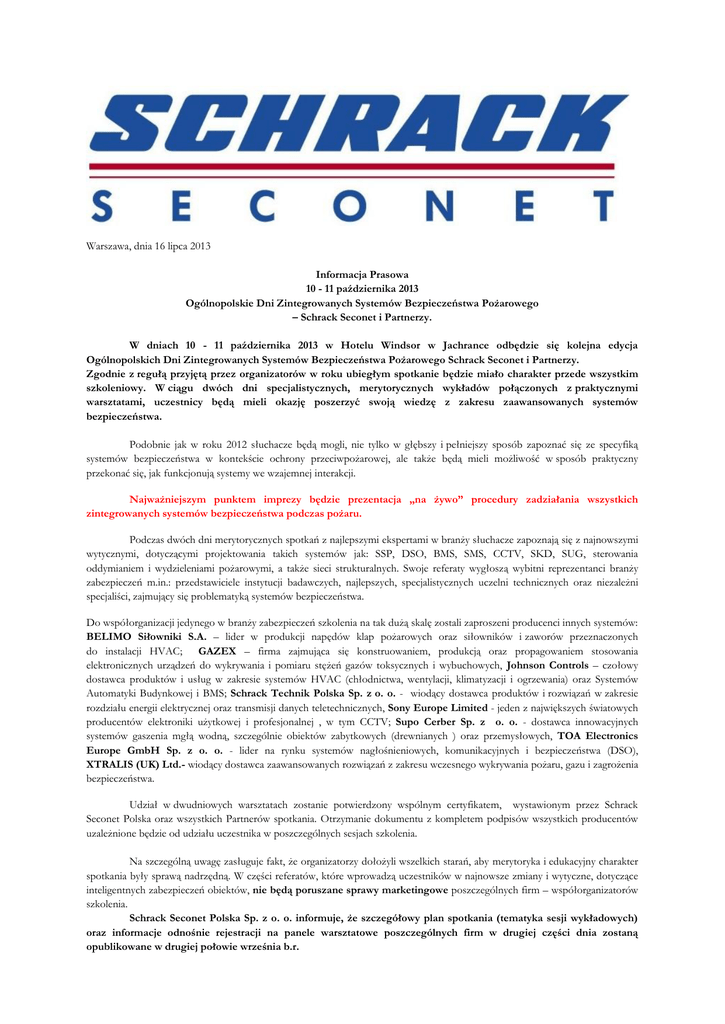 Warszawa, dnia 16 lipca 2013 Informacja Prasowa 10 - 11 października 2013 Ogólnopolskie Dni Zintegrowanych Systemów Bezpieczeństwa Pożarowego – Schrack Seconet i Partnerzy. W dniach 10 - 11 października 2013 w Hotelu Windsor w Jachrance odbędzie się kolejna edycja Ogólnopolskich Dni Zintegrowanych Systemów Bezpieczeństwa Pożarowego Schrack Seconet i Partnerzy. Zgodnie z regułą przyjętą przez organizatorów w roku ubiegłym spotkanie będzie miało charakter przede wszystkim szkoleniowy. W ciągu dwóch dni specjalistycznych, merytorycznych wykładów połączonych z praktycznymi warsztatami, uczestnicy będą mieli okazję poszerzyć swoją wiedzę z zakresu zaawansowanych systemów bezpieczeństwa. Podobnie jak w roku 2012 słuchacze będą mogli, nie tylko w głębszy i pełniejszy sposób zapoznać się ze specyfiką systemów bezpieczeństwa w kontekście ochrony przeciwpożarowej, ale także będą mieli możliwość w sposób praktyczny przekonać się, jak funkcjonują systemy we wzajemnej interakcji. Najważniejszym punktem imprezy będzie prezentacja „na żywo” procedury zadziałania wszystkich zintegrowanych systemów bezpieczeństwa podczas pożaru. Podczas dwóch dni merytorycznych spotkań z najlepszymi ekspertami w branży słuchacze zapoznają się z najnowszymi wytycznymi, dotyczącymi projektowania takich systemów jak: SSP, DSO, BMS, SMS, CCTV, SKD, SUG, sterowania oddymianiem i wydzieleniami pożarowymi, a także sieci strukturalnych. Swoje referaty wygłoszą wybitni reprezentanci branży zabezpieczeń m.in.: przedstawiciele instytucji badawczych, najlepszych, specjalistycznych uczelni technicznych oraz niezależni specjaliści, zajmujący się problematyką systemów bezpieczeństwa. Do współorganizacji jedynego w branży zabezpieczeń szkolenia na tak dużą skalę zostali zaproszeni producenci innych systemów: BELIMO Siłowniki S.A. – lider w produkcji napędów klap pożarowych oraz siłowników i zaworów przeznaczonych do instalacji HVAC; GAZEX – firma zajmująca się konstruowaniem, produkcją oraz propagowaniem stosowania elektronicznych urządzeń do wykrywania i pomiaru stężeń gazów toksycznych i wybuchowych, Johnson Controls – czołowy dostawca produktów i usług w zakresie systemów HVAC (chłodnictwa, wentylacji, klimatyzacji i ogrzewania) oraz Systemów Automatyki Budynkowej i BMS; Schrack Technik Polska Sp. z o. o. - wiodący dostawca produktów i rozwiązań w zakresie rozdziału energii elektrycznej oraz transmisji danych teletechnicznych, Sony Europe Limited - jeden z największych światowych producentów elektroniki użytkowej i profesjonalnej , w tym CCTV; Supo Cerber Sp. z o. o. - dostawca innowacyjnych systemów gaszenia mgłą wodną, szczególnie obiektów zabytkowych (drewnianych ) oraz przemysłowych, TOA Electronics Europe GmbH Sp. z o. o. - lider na rynku systemów nagłośnieniowych, komunikacyjnych i bezpieczeństwa (DSO), XTRALIS (UK) Ltd.- wiodący dostawca zaawansowanych rozwiązań z zakresu wczesnego wykrywania pożaru, gazu i zagrożenia bezpieczeństwa. Udział w dwudniowych warsztatach zostanie potwierdzony wspólnym certyfikatem, wystawionym przez Schrack Seconet Polska oraz wszystkich Partnerów spotkania. Otrzymanie dokumentu z kompletem podpisów wszystkich producentów uzależnione będzie od udziału uczestnika w poszczególnych sesjach szkolenia. Na szczególną uwagę zasługuje fakt, że organizatorzy dołożyli wszelkich starań, aby merytoryka i edukacyjny charakter spotkania były sprawą nadrzędną. W części referatów, które wprowadzą uczestników w najnowsze zmiany i wytyczne, dotyczące inteligentnych zabezpieczeń obiektów, nie będą poruszane sprawy marketingowe poszczególnych firm – współorganizatorów szkolenia. Schrack Seconet Polska Sp. z o. o. informuje, że szczegółowy plan spotkania (tematyka sesji wykładowych) oraz informacje odnośnie rejestracji na panele warsztatowe poszczególnych firm w drugiej części dnia zostaną opublikowane w drugiej połowie września b.r. PARTNERZY SCHRACK SECONET POLSKA: PATRONI MEDIALNI: Firma Schrack Seconet jest jednym z największych i najbardziej znanych producentów systemów sygnalizacji pożarowej na świecie. Od wielu lat Schrack Seconet Polska jest liderem na rynku polskim w sprzedaży najnowocześniejszych rozwiązań z dziedziny zabezpieczeń. Na przestrzeni niemal trzydziestu lat działalności Schrack Seconet w Polsce, na liście referencyjnej firmy pojawiło się ponad 2500 obiektów, które zostały wyposażone w całą gamę systemów ochrony ppoż. oraz systemów komunikacji. Osoby do kontaktu: Marta Nowak – Marketing Manager [email protected]