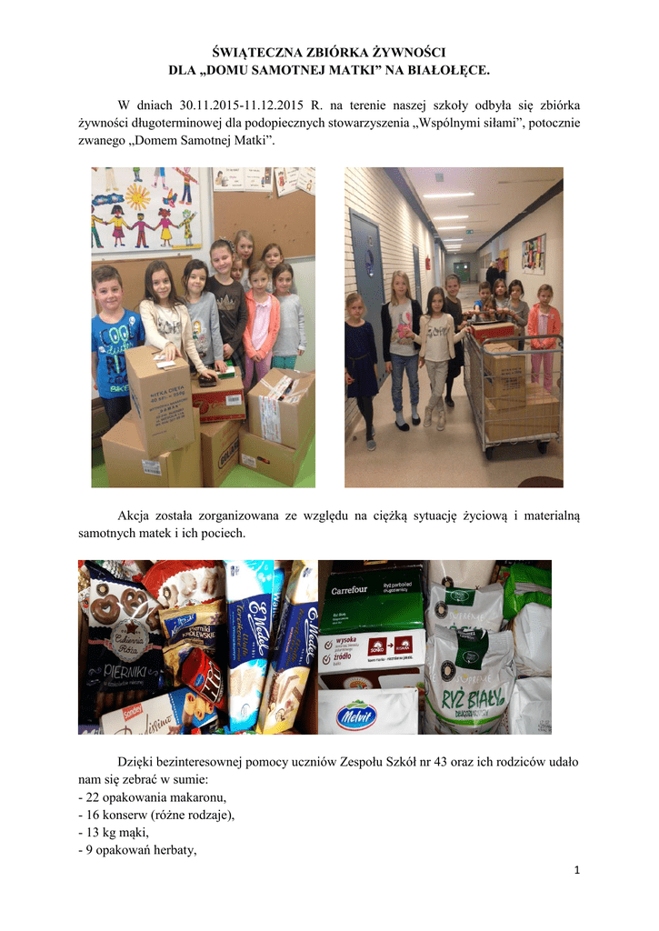 ŚWIĄTECZNA ZBIÓRKA ŻYWNOŚCI DLA „DOMU SAMOTNEJ MATKI” NA BIAŁOŁĘCE. W dniach 30.11.2015-11.12.2015 R. na terenie naszej szkoły odbyła się zbiórka żywności długoterminowej dla podopiecznych stowarzyszenia „Wspólnymi siłami”, potocznie zwanego „Domem Samotnej Matki”. Akcja została zorganizowana ze względu na ciężką sytuację życiową i materialną samotnych matek i ich pociech. Dzięki bezinteresownej pomocy uczniów Zespołu Szkół nr 43 oraz ich rodziców udało nam się zebrać w sumie: - 22 opakowania makaronu, - 16 konserw (różne rodzaje), - 13 kg mąki, - 9 opakowań herbaty, 1 - 8 l oleju, - 6 opakowań kaszy (różne rodzaje), a także mnóstwo słodyczy, przypraw oraz innych produktów spożywczych. Wszystkim ofiarodawcom SERDECZNIE DZIĘKUJEMY. Jednocześnie pragniemy poinformować Państwa, że zbiórka żywności ma charakter cykliczny i organizowana jest dwa razy w roku (tj. przed Świętami Wielkanocnymi oraz Bożego Narodzenia). Organizatorki 2