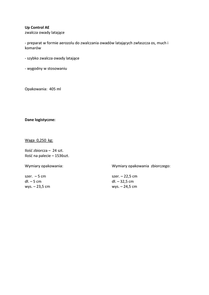 Up Control AE zwalcza owady latające - preparat w formie aerozolu do zwalczania owadów latających zwłaszcza os, much i komarów - szybko zwalcza owady latające - wygodny w stosowaniu Opakowania: 405 ml Dane logistyczne: Waga 0,250 kg: Ilość zbiorcza – 24 szt. Ilość na palecie – 1536szt. Wymiary opakowania: Wymiary opakowania zbiorczego: szer. – 5 cm dł. – 5 cm wys. – 23,5 cm szer. – 22,5 cm dł. – 32,5 cm wys. – 24,5 cm