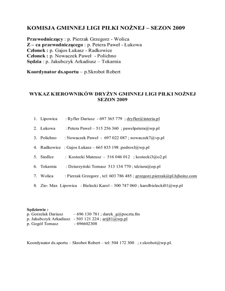 KOMISJA GMINNEJ LIGI PIŁKI NOŻNEJ – SEZON 2009 Przewodniczący : p. Pierzak Grzegorz - Wolica Z – ca przewodniczącego : p. Petera Paweł - Łukowa Członek : p. Gajos Łukasz - Radkowice Członek : p. Nowaczek Paweł - Polichno Sędzia : p. Jakubczyk Arkadiusz – Tokarnia Koordynator ds.sportu – p.Skrobot Robert WYKAZ KIEROWNIKÓW DRYŻYN GMINNEJ LIGI PIŁKI NOŻNEJ SEZON 2009 1. Lipowica : Ryfler Dariusz - 697 365 779 ; [email protected] 2. Łukowa : Petera Paweł – 515 256 360 ; [email protected] 3. Polichno : Nowaczek Paweł - 697 022 087 ; [email protected] 4. Radkowice : Gajos Łukasz – 665 835 198 ;[email protected] 5. Siedlce : Kostecki Mateusz - 516 046 012 ; [email protected] 6. Tokarnia : Dziurzyński Tomasz 513 134 770 ; [email protected] 7. Wolica : Pierzak Grzegorz , tel: 603 786 485 ; [email protected] 8. Zio- Max Lipowica : Bielecki Karol – 500 747 060 ; [email protected] Sędziowie : p. Gorzelak Dariusz – 696 130 781 ; [email protected] p. Jakubczyk Arkadiusz - 503 121 224 ; [email protected] p. Gogół Tomasz - 696602308 Koordynator ds.sportu – Skrobot Robert – tel: 504 172 300 ; [email protected].