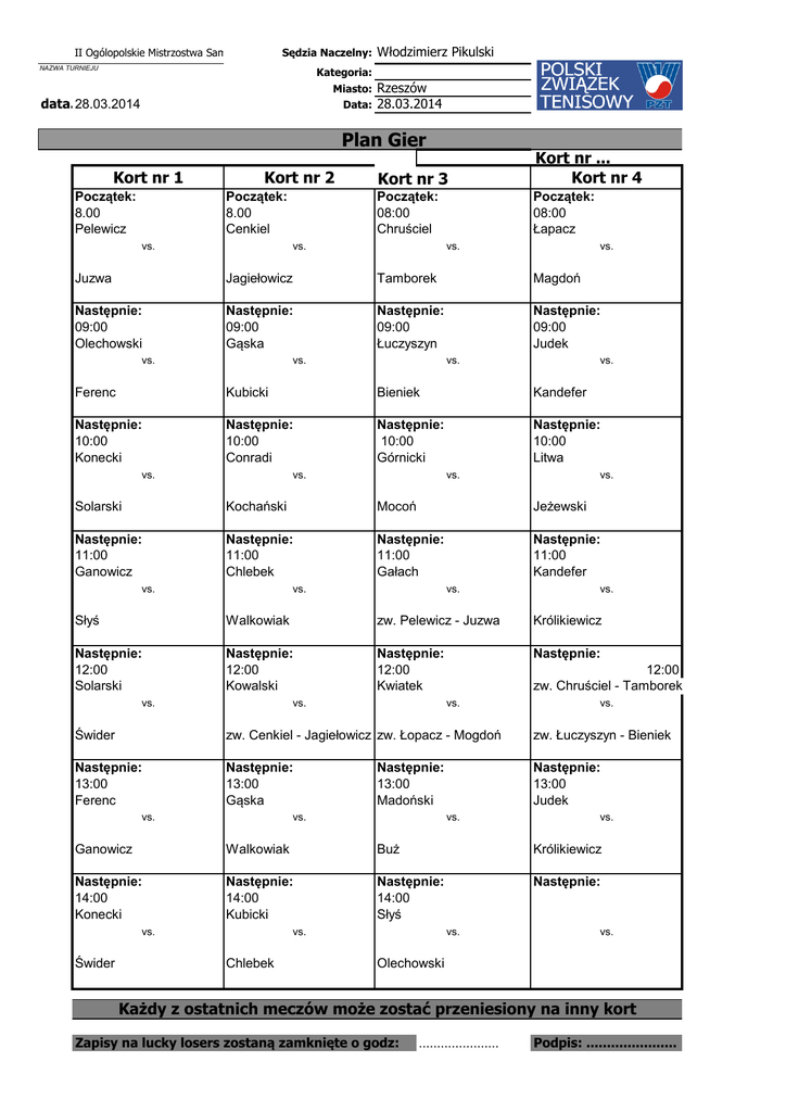 II Ogólopolskie Mistrzostwa SamorządowcówSędzia Naczelny: Włodzimierz Pikulski Kategoria: NAZWA TURNIEJU Miasto: data..................................... 28.03.2014 Data: Rzeszów 28.03.2014 Plan Gier Kort nr 1 Początek: 8.00 Pelewicz Kort nr 2 Początek: 8.00 Cenkiel vs. Kort nr 3 Kort nr ... Kort nr 4 Początek: 08:00 Chruściel Początek: 08:00 Łapacz vs. vs. vs. Juzwa Jagiełowicz Tamborek Magdoń Następnie: 09:00 Olechowski Następnie: 09:00 Gąska Następnie: 09:00 Łuczyszyn Następnie: 09:00 Judek vs. vs. vs. vs. Ferenc Kubicki Bieniek Kandefer Następnie: 10:00 Konecki Następnie: 10:00 Conradi Następnie: 10:00 Górnicki Następnie: 10:00 Litwa vs. vs. vs. vs. Solarski Kochański Mocoń Jeżewski Następnie: 11:00 Ganowicz Następnie: 11:00 Chlebek Następnie: 11:00 Gałach Następnie: 11:00 Kandefer vs. vs. vs. vs. Słyś Walkowiak zw. Pelewicz - Juzwa Królikiewicz Następnie: 12:00 Solarski Następnie: 12:00 Kowalski Następnie: 12:00 Kwiatek Następnie: vs. vs. 12:00 zw. Chruściel - Tamborek vs. vs. Świder zw. Cenkiel - Jagiełowicz zw. Łopacz - Mogdoń zw. Łuczyszyn - Bieniek Następnie: 13:00 Ferenc Następnie: 13:00 Gąska Następnie: 13:00 Judek vs. Następnie: 13:00 Madoński vs. vs. vs. Ganowicz Walkowiak Buż Królikiewicz Następnie: 14:00 Konecki Następnie: 14:00 Kubicki Następnie: 14:00 Słyś Następnie: vs. Świder vs. Chlebek vs. vs. Olechowski Każdy z ostatnich meczów może zostać przeniesiony na inny kort Zapisy na lucky losers zostaną zamknięte o godz: ...................... Podpis: ......................