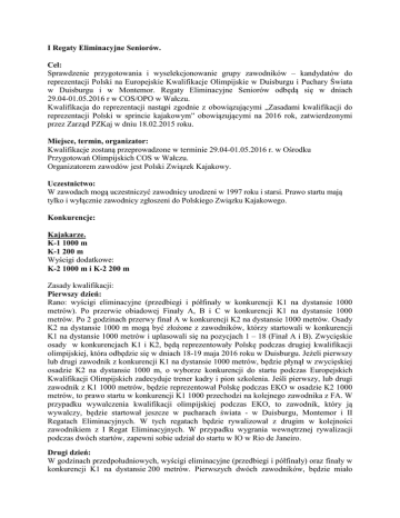 I Regaty Eliminacyjne Seniorów. Cel: Sprawdzenie przygotowania i wyselekcjonowanie grupy zawodników – kandydatów do reprezentacji Polski na Europejskie Kwalifikacje Olimpijskie w Duisburgu i Puchary Świata w Duisburgu i w Montemor. Regaty Eliminacyjne Seniorów odbędą się w dniach 29.04-01.05.2016 r w COS/OPO w Wałczu. Kwalifikacja do reprezentacji nastąpi zgodnie z obowiązującymi „Zasadami kwalifikacji do reprezentacji Polski w sprincie kajakowym” obowiązującymi na 2016 rok, zatwierdzonymi przez Zarząd PZKaj w dniu 18.02.2015 roku. Miejsce, termin, organizator: Kwalifikacje zostaną przeprowadzone w terminie 29.04-01.05.2016 r. w Ośrodku Przygotowań Olimpijskich COS w Wałczu. Organizatorem zawodów jest Polski Związek Kajakowy. Uczestnictwo: W zawodach mogą uczestniczyć zawodnicy urodzeni w 1997 roku i starsi. Prawo startu mają tylko i wyłącznie zawodnicy zgłoszeni do Polskiego Związku Kajakowego. Konkurencje: Kajakarze. K-1 1000 m K-1 200 m Wyścigi dodatkowe: K-2 1000 m i K-2 200 m Zasady kwalifikacji: Pierwszy dzień: Rano: wyścigi eliminacyjne (przedbiegi i półfinały w konkurencji K1 na dystansie 1000 metrów). Po przerwie obiadowej Finały A, B i C w konkurencji K1 na dystansie 1000 metrów. Po 2 godzinach przerwy finał A w konkurencji K2 na dystansie 1000 metrów. Osady K2 na dystansie 1000 m mogą być złożone z zawodników, którzy startowali w konkurencji K1 na dystansie 1000 metrów i uplasowali się na pozycjach 1 – 18 (Finał A i B). Zwycięskie osady w konkurencjach K1 i K2, będą reprezentowały Polskę podczas drugiej kwalifikacji olimpijskiej, która odbędzie się w dniach 18-19 maja 2016 roku w Duisburgu. Jeżeli pierwszy lub drugi zawodnik z konkurencji K1 na dystansie 1000 metrów, będzie płynął w zwycięskiej osadzie K2 na dystansie 1000 m, o wyborze konkurencji do startu podczas Europejskich Kwalifikacji Olimpijskich zadecyduje trener kadry i pion szkolenia. Jeśli pierwszy, lub drugi zawodnik z K1 1000 metrów, będzie reprezentował Polskę podczas EKO w osadzie K2 1000 metrów, to prawo startu w konkurencji K1 1000 przechodzi na kolejnego zawodnika z FA. W przypadku wywalczenia kwalifikacji olimpijskiej podczas EKO, to zawodnik, który ją wywalczy, będzie startował jeszcze w pucharach świata - w Duisburgu, Montemor i II Regatach Eliminacyjnych. W tych regatach będzie rywalizował z drugim w kolejności zawodnikiem z I Regat Eliminacyjnych. W przypadku wygrania wewnętrznej rywalizacji podczas dwóch startów, zapewni sobie udział do startu w IO w Rio de Janeiro. Drugi dzień: W godzinach przedpołudniowych, wyścigi eliminacyjne (przedbiegi i półfinały) oraz finały w konkurencji K1 na dystansie 200 metrów. Pierwszych dwóch zawodników, będzie miało pierwszeństwo do startu podczas Pucharu Świata w Duisburgu i Montemor w konkurencji K1 200 metrów oraz wystartuje w II Regatach Eliminacyjnych. W przypadku wygrania wewnętrznej rywalizacji podczas dwóch startów, zwycięzca tej rywalizacji zapewni sobie start w IO Rio de Janeiro, w konkurencji K1 200 metrów. Jeśli wynik tej rywalizacji w Duisburgu i Montemor będzie nierozstrzygnięty to decydujący dla tych dwóch zawodników będzie start w II Regatach Eliminacyjnych 17-19.06.2016 w Wałczu. Po godzinnej przerwie (od startu w finałach, w konkurencji K1) zostanie rozegrany finał w konkurencji K2 na dystansie 200 metrów. Osady mogą być złożone z 10 pierwszych zawodników na 200 metrów (9 z finału A i pierwszy z finału B). Osady zostaną rozstawione na torach 5, 4, 6, 3, 7 wg. klucza: osada K2, w której będzie płynął najlepszy zawodnik z rywalizacji indywidualnej na 200 metrów na torze nr 5, kolejny na torze nr 4 itd. Zwycięska osada będzie miała prawo reprezentować Polskę podczas EKO 17-19.05.2016 w Duisburgu. W przypadku wywalczenia kwalifikacji olimpijskiej przez osadę K2 na dystansie 200 m, podczas EKO, osada ta będzie startowała jeszcze w pucharach świata w Duisburgu, Montemor i II Regatach Eliminacyjnych. W tych regatach będzie rywalizowała z drugą w kolejności osadą z I Regat Eliminacyjnych. W przypadku wygrania wewnętrznej rywalizacji podczas dwóch startów, zapewni sobie udział do startu w IO Rio de Janeiro. Wstępna kwalifikacja do reprezentacji narodowej kajakarzy dotyczy dwunastu miejsc, na które kwalifikuje się pierwszych jedenastu zawodników wyłonionych z wyścigów finałowych w konkurencji K1 na dystansach 200 m, i 1000 m (w tym zwycięzcy z poszczególnych dystansów) oraz jeden zawodnik kwalifikowany na wniosek trenera. Łącznie do 12 zawodników. Kajakarki. K-1 2000 m K-1 1000 m K-1 500 m K-1 200 m Zasady kwalifikacji: Pierwszy dzień: Specjalizacja 1 x 2000 m i 1 x 1000 m (sprawdzian indywidualny w odstępach czasowych 1 min.) z przerwą 10 min. oraz wyścigi finałowe, A i B na dystansie 1000 m wg zajętych miejsc w wyścigu na dystansie 2000 m (za sprawdzianu indywidualnego). Tory w finałach wg. klucza. pierwszy czas z przejazdu na 2000 metrów - tor nr 5, drugi czas tor nr 4, trzeci czas tor nr 6 itd. - zwyciężczyni w finale A na dystansie 1000 metrów ma pierwszeństwo startu w konkurencji K-1 na dystansie 1000 metrów na pucharach świata. Drugi dzień: Specjalizacja, wyścigi finałowe A, B na dystansie 500 m wg zajętych miejsc w wyścigu na dystansie 1000 m (ze sprawdzianu indywidualnego). Tory w finałach wg. klucza: pierwszy czas z przejazdu na 1000 metrów - tor nr 5 w finale A, drugi czas tor nr 4 w finale A, trzeci czas tor nr 6 itd. , 10 czas – tor nr 5 w finale B itd. - zwyciężczyni w finale A na dystansie 500 metrów, ma pierwszeństwo startu w konkurencji K-1 na dystansie 500 metrów na pucharach świata. Po dwugodzinnej przerwie odbędą się wyścigi kwalifikacyjne na dystansie 200 m, a następnie wyścig finałowy (finał A) wg poniższych zasad: - w wyścigach kwalifikacyjnych będzie uczestniczyć pierwszych 16 zawodniczek z wyścigów finałowych na dystansie 500 m (d