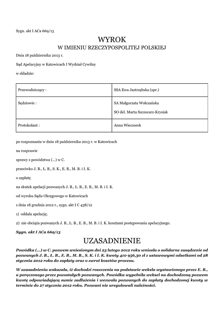 Sygn. akt I ACa 669/13 WYROK W IMIENIU RZECZYPOSPOLITEJ POLSKIEJ Dnia 18 października 2013 r. Sąd Apelacyjny w Katowicach I Wydział Cywilny w składzie: Przewodniczący : SSA Ewa Jastrzębska (spr.) Sędziowie : SA Małgorzata Wołczańska SO del. Marta Szczocarz-Krysiak Protokolant : Anna Wieczorek po rozpoznaniu w dniu 18 października 2013 r. w Katowicach na rozprawie sprawy z powództwa (...) w C. przeciwko J. B., Ł. B., S. K., E. B., M. B. i I. K. o zapłatę na skutek apelacji pozwanych J. B., Ł. B., E. B., M. B. i I. K. od wyroku Sądu Okręgowego w Katowicach z dnia 18 grudnia 2012 r., sygn. akt I C 438/12 1) oddala apelację; 2) nie obciąża pozwanych J. B., Ł. B., E. B., M. B. i I. K. kosztami postępowania apelacyjnego. Sygn. akt I ACa 669/13 UZASADNIENIE Powódka (...) w C. pozwem wniesionym dni 23 lutego 2012 roku wniosła o solidarne zasądzenie od pozwanych J. B., Ł. B., E. B., M. B., S. K. i I. K. kwoty 410 956,30 zł z ustawowymi odsetkami od 28 stycznia 2012 roku do zapłaty oraz o zwrot kosztów procesu. W uzasadnieniu wskazała, iż dochodzi roszczenia na podstawie weksla wystawionego przez E. B., a poręczonego przez pozostałych pozwanych. Powódka wypełniła weksel na dochodzoną pozwem kwotę odpowiadającą sumie zadłużenia i wezwała pozwanych do zapłaty dochodzonej kwoty w terminie do 27 stycznia 2012 roku. Pozwani nie uregulowali należności. Dnia 9 marca 2012 roku Sąd Okręgowy w Katowicach wydał nakaz zapłaty w postępowaniu nakazowym uwzględniając żądanie w całości. Od nakazu tego pozwani wnieśli zarzuty. Domagali się uchylenia nakazu zapłaty i oddalenia powództwa, ze względu na sytuację finansową. Podnosili, że spłacali kredyt, E. B. miała pracę, J. B. rentę i usługi taxi. W lipcu 2011 roku J. B. stracił możliwość zarobkowania, co spowodowało, że pozwani są w trudnej sytuacji finansowej. Wnosili o odstąpienie o natychmiastowej spłaty kredytu i o rozłożenie na raty, a nie o anulowanie długu, gdyby nie utrata wzroku przez J. B., dług byłby spłacany. Wyrokiem z dnia 18 grudnia 2012r. Sąd Okręgowy w Katowicach utrzymał w mocy nakaz zapłaty Sądu Okręgowego w Katowicach z dnia 9 marca 2012 roku (sygn. akt I Nc 61/12) w stosunku do J. B., Ł. B., E. B., M. B. i I. K.. W uzasadnieniu ustalił, iż pozwana E. B. jest wystawcą weksla (k. 29 akt) wypełnionego przez powódkę na kwotę 410 956,30 zł. Pozostali pozwani poręczyli weksel (k. 30 akt). Weksel został złożony jako zabezpieczenie umowy pożyczki z dnia 25 lutego 2011 roku (k. 225 akt) na podstawie punktu(...) umowy. Umowa była sporządzona w konsekwencji wniosku E. B. o pożyczkę konsolidacyjną w kwocie 385 000 zł (k. 241 akt). Na dzień 25 lutego 2011 roku kapitał udzielonej pożyczki wynosił 385 000 zł. Razem z odsetkami do spłaty w 60 ratach było 554 631,71 zł. Raty ustalone zostały w wysokości po 3 500 zł, z tym, iż ostatnia rata przypadająca na 25 lutego 2016 roku wynosiła 348 131,71 zł. Dnia 10 października 2011 roku powódka wypowiedziała umowę z dnia 25 lutego 2011 roku wobec zaprzestania terminowej spłaty zobowiązania (k. 234). Zawiadomiono poręczycieli (k. 235-238 akt). Na dzień 19 stycznia 2012 roku (k. 226 akt) niespłaconego kapitału było 382 664,63 złote, a niespłaconych odsetek 11 649,94 złote. Łącznie 410 956,30 złotych. Na tę kwotę został wypełniony weksel. Do wypełnienia weksla doszło wobec zaprzestania spłat rat przez pozwanych. Wystosowano do pozwanych wezwania do zapłaty (k. 13-18 akt). W ocenie Sądu pierwszej instancji żądanie pozwu jest zasadne. Zgodnie z art. 493 § 1 kpc, w brzmieniu sprzed zmiany ustawy z 16 września 2011 roku, która weszła w życie 3 maja 2012 roku, pismo zawierające zarzuty wnosi się do sądu, który wydał nakaz zapłaty. W piśmie pozwany winien wskazać czy zaskarża nakaz w całości czy w części, przedstawić zarzuty, które pod rygorem utraty należy zgłosić przed wdaniem się w spór, oraz pozostałe zarzuty przeciwko żądaniu pozwu, a także wszystkie okoliczności faktyczne i dowody na ich potwierdzenie. Pozwani w zarzutach nie podnosili nieprawidłowości w wypełnieniu weksla, braku prawa do jego wypełnienia. Nie kwestionowali wysokości zadłużenia. Zarzuty w stosunku do wysokości prowizji, braku możliwości zapoznania się przez jednego z pozwanych z umową, że próbowano ominąć przepisy, są bezskuteczne. Zgodnie z art. 9 prawa wekslowego wystawca weksla odpowiada za przyjęcie i zapłatę wekslu. Zgodnie z art. 30 prawa wekslowego poręczenie udzielone na wekslu „in blanco” także zabezpiecza zapłatę z weksla, a nie wykonanie zobowiązania zabezpieczonego wekslem. Zgodnie z prawem wekslowym (art. 10) wystawca weksla może podnosić zarzut nieprawidłowości wypełnienia weksla w postaci niezgodności z deklaracją wekslową. W takiej sytuacji może dojść do badania stosunku umownego, na podstawie którego weksel został wypełniony. Ciężar dowodu zawarcia umowy regulującej sposób wypełnienia weksla oraz wypełnienia weksla niezgodnie z umową ciąży na wekslowo zobowiązanym. W niniejszym procesie, wobec treści zarzutów, nie zachodziła zdaniem sądu pierwszej instancji potrzeba badania stosunków umownych pomiędzy stronami. Zarzuty przeciwko żądaniu pozwu, a także wszelkie okoliczności faktyczne nie zgłoszone w zarzutach, nie mogą być już skutecznie zgłaszane z uwagi na treść art. 493 § 1 kpc, w brzmieniu obowiązującym do postępowań wszczętych przed dniem 3 maja 2012 roku ( Dz. U. 2011.233.1381), który stanowił o rygorze utraty niezgłoszonych zarzutów w zarzutach do nakazu zapłaty. Sąd pierwszej instancji nie uwzględnił wniosku o rozłożenie należności na raty, bowiem pozwani nie mają możliwości spłacania ewentualnych rat, które byłyby bardzo wysokie (powódka proponowała 8 000 zł). Już w toku procesu narosło odsetek około 45 000 zł. Nawet rata 3 800 zł (k. 33) wskazana p