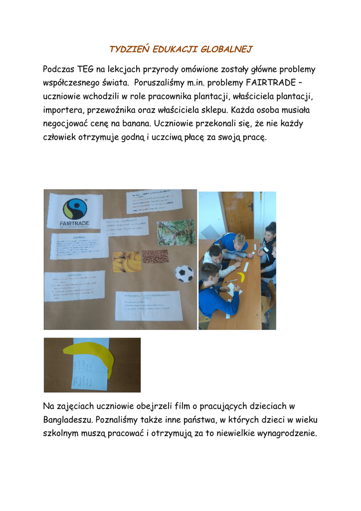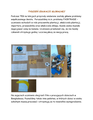 TYDZIEŃ EDUKACJI GLOBALNEJ Podczas TEG na lekcjach przyrody omówione zostały główne problemy współczesnego świata. Poruszaliśmy m.in. problemy FAIRTRADE – uczniowie wchodzili w role pracownika plantacji, właściciela plantacji, importera, przewoźnika oraz właściciela sklepu. Każda osoba musiała negocjować cenę na banana. Uczniowie przekonali się, że nie każdy człowiek otrzymuje godną i uczciwą płacę za swoją pracę. Na zajęciach uczniowie obejrzeli film o pracujących dzieciach w Bangladeszu. Poznaliśmy także inne państwa, w których dzieci w wieku szkolnym muszą pracować i otrzymują za to niewielkie wynagrodzenie. Na zajęciach w świetlicy szkolnej, młodsi uczniowie odmierzali ile wody pitnej jest na Ziemi. Wszyscy byli bardzo zdziwieni, że jest jej tak mało !!! Większość uczniów doskonale wie, jak należy oszczędzać wodę ! Joanna Hoffmann