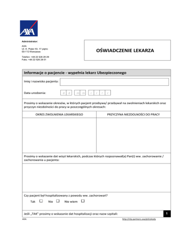 Administrator: AXA UI. E. Plater 53, 17 piętro 00-113 Warszawa OŚWIADCZENIE LEKARZA Telefon: +48 22 526 29 29 Faks: +48 22 526 28 01 Informacje o pacjencie - wypełnia lekarz Ubezpieczonego Imię i nazwisko pacjenta: Data urodzenia: d d m m r r r r Prosimy o wskazanie okresów, w których pacjent przebywa/ przebywał na zwolnieniach lekarskich oraz przyczyn niezdolności do pracy w poszczególnych okresach: OKRES ZWOLNIENIA LEKARSKIEGO PRZYCZYNA NIEZDOLNOŚCI DO PRACY Prosimy o wskazanie dat wizyt lekarskich, podczas których rozpoznawał(a) Pan(i) ww. zachorowanie / zachorowania u pacjenta: Czy pacjent był hospitalizowany z powodu ww. zachorowań? Tak Nie Nie wiem 1 Jeśli „TAK” prosimy o wskazanie dat hospitalizacji oraz nazw szpitali: AXA http://clp.partners.axa/pl/szkody Okres hospitalizacji Nazwa szpitala Czy czasowa niezdolność do pracy jest wynikiem prawidłowej ciąży: Tak Nie Jeżeli „TAK”, prosimy podać szczegóły: Nie wiem Czy zachorowanie jest wynikiem samookaleczenia? Tak Nie Nie wiem Czy zachorowanie jest wynikiem nieprzestrzegania zaleceń lekarskich? Tak Nie Nie wiem Czy zachorowanie jest wynikiem poddania się zabiegom o charakterze medycznym poza kontrolą lekarską lub uprawnionych do tego osób? Tak Nie Nie wiem Podpis lekarza: Data: Pieczątka lekarza: d d m m r r r r 2 AXA http://clp.partners.axa/pl/szkody