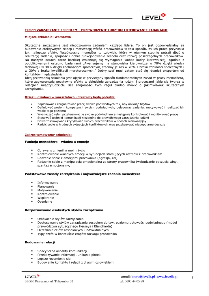 Temat: ZARZĄDZANIE ZESPOŁEM – PRZEWODZENIE LUDZIOM I KIEROWANIE ZADANIAMI Miejsce szkolenia: Warszawa Skuteczne zarządzanie jest nieodzownym zadaniem każdego lidera. To on jest odpowiedzialny za budowanie efektywnych relacji i motywację wśród pracowników w taki sposób, by ich praca przynosiła jak najlepsze efekty. Współczesny menedżer to człowiek, który w równym stopniu potrafi dbać o realizację zadania, spójność i dobre funkcjonowanie zespołu oraz rozwój poszczególnych pracowników. Na naszych oczach coraz bardziej zmieniają się wymagania wobec kadry kierowniczej, zgodnie z opublikowanymi ostatnio badaniami „Awansujemy na stanowiska kierownicze w 70% dzięki wiedzy fachowej i w 30% dzięki zdolnościom społecznym, tracimy je zaś w 70% z braku zdolności społecznych i w 30% z braku kwalifikacji merytorycznych." Dobry szef musi zatem stać się również ekspertem od kontaktów międzyludzkich. Ideą przewodnią szkolenia jest ujęcie w przystępny sposób fundamentalnych zasad w pracy menadżera, które zagwarantują pozytywne efekty w dziedzinie zarządzania ludźmi i procesami jakie się tworzą w relacjach międzyludzkich. Bez znajomości tych reguł trudno mówić o jakimkolwiek skutecznym zarządzaniu. Dzięki udziałowi w warsztatach uczestnicy będą potrafili: • • • • • • Zaplanować i zorganizować pracę swoich podwładnych tak, aby uniknąć błędów Definiować poziom kompetencji swoich podwładnych, delegować zadania, motywować i rozliczać ich wedle tego poziomu Wyznaczać cele i przekazywać je swoim podwładnym a następnie kontrolować i monitorować pracę Stosować techniki komunikacji niezbędne do prawidłowego zarządzania ludźmi Dowartościowywać i krytykować swoich pracowników w sposób nieinwazyjny Radzić sobie w trudnych sytuacjach konfliktowych oraz przekazywać niepopularne decyzje Zakres tematyczny szkolenia: Funkcja menedżera - władza a emocje Co awans zmienił w moim życiu Kontrolowanie własnych emocji w sytuacjach stresujących rozmów z pracownikiem Radzenie sobie z emocjami pracownika (agresja, żal) Radzenie sobie z manipulacja emocjonalna ze strony pracownika (wzbudzanie poczucia winy, szantaż emocjonalny, Podstawowe zasady zarządzania i najważniejsze zadania menedżera Informowanie Planowanie Motywowanie Kontrolowanie Wspieranie Ocenianie Rozpoznawanie osobistych stylów zarządzania Omówienie stylów zarządzania Dostosowanie stylów zarządzania zespołem do tzw. poziomu gotowości podwładnego (model przywództwa sytuacyjnego Herseya i Blancharda) Określanie celów zespołowych i indywidualnych Typy szefa w kontekście etapów rozwoju pracownika Budowanie relacji Specyficzne aspekty komunikacji Przekazywanie informacji, unikanie plotek Lepsze rozumienie sie Budowanie kontaktu i relacji z drugim człowiekiem 05-500 Piaseczno, ul. Tulipanów 32 e:mail: [email protected] www.levelk.pl tel. 0600 44 05 88 1 Motywowanie - zaangażowanie zespołu i podnoszenie efektywności pracy Piramida potrzeb Maslowa - motywacja z punktu widzenia biologii i psychologii Motywacja jako czynnik wyzwalający energie Metody motywowania pozapłacowego o Osiągnięcia o Uznanie o Odpowiedzialność o Wywieranie wplywu o Rozwój osobisty Sposoby udzielania informacji zwrotnej (feedback) Sposoby i schematy udzielania feedbacku - czyli dawania i brania informacji zwrotnej zarówno przez managera jak i pracownika, po to, aby osiągać wspólne korzyści o Informacje zwrotne a krytyka o Sposoby chwalenia i doceniania o Metody krytykowania o Komunikaty karzące, opiekuńcze, wspierające o Komunikat "JA" jako technika zmniejszania oporu odbiorcy Rozwiązywanie konfliktów wewnątrz grupy Źródła i rodzaje konfliktów Sposoby radzenia sobie z sytuacja konfliktowa Test style reakcji na konflikt (H.L. Tosi, J.R. Rizzo, S.J. Carroll) - rywalizacja, unikanie, kompromis, łagodzenie, kooperacja Budowa i zarządzanie zespołem Typy osobowości pracowników wg Junga oraz instrukcja obsługi każdego z nich Struktura grupy i role grupowe Rola jednostki w zespole Co decyduje o sukcesie zespołu - podstawowe narzędzia Czego unikać w kierowaniu zespołem - podstawowe zagrożenia Komunikacja wewnątrz zespołu Metodologia szkolenia: Szkolenia prowadzone są metodą warsztatową, uwzględniają specyfikę uczenia się osób dorosłych. Uczestnicy biorą udział w ćwiczeniach grupowych, indywidualnych i w symulacjach, doświadczają procesów i technik zarządzania w sposób praktyczny. Odbywa się to w oparciu o gry i ćwiczenia mające swoje odniesienie do codziennych sytuacji, z jakimi spotykają się w swojej pracy zawodowej. Zajęcia mają charakter dynamiczny. Cena: 1490zł. brutto Każda kolejna osoba z tej samej firmy – 20% zniżki! Informacje i zgłoszenia: [email protected] tel. 0600 44 05 88 05-500 Piaseczno, ul. Tulipanów 32 e:mail: [email protected] www.levelk.pl tel. 0600 44 05 88 2