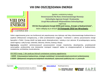 VIII DNI OSZCZĘDZANIA ENERGII Zgodnie z wieloletnią tradycją Stowarzyszenie Na Rzecz Zrównoważonego Rozwoju Dolnośląska Agencja Energii i Środowiska Urząd Marszałkowski Województwa Dolnośląskiego organizują VIII Dni Oszczędzania Energii (DOE) pod nazwą „Energia w Budownictwie”, które odbędą się w dniach 3‐4 listopada 2010 we Wrocławiu. Celem organizowanej przez nas konferencji jest popularyzacja oraz dyskusja nad ideą zrównoważonego budownictwa w aspekcie efektywności energetycznej, a także przedstawienie osiągnięć i możliwości z zakresu poszanowania energii Specjaliści z Polski i Europy dzielić się będą swoim doświadczeniem i wiedzą w tym zakresie. W przedsięwzięciu wezmą udział regiony z całej Europy: Jutlandia, Saksonia, Ukraina, Szwecja, Alzacja. Zapraszamy wszystkich zainteresowanych poszanowaniem energii: inwestorów, deweloperów, przedstawicieli samorządów, producentów oraz dostawców rozwiązań mających wpływ na energooszczędność w budownictwie, instalatorów, architektów, konstruktorów. VIII DOE trwają 2 dni podczas których omówione zostaną zagadnienia: I DZIEŃ : Zrównoważone budownictwo, strategia rewitalizacji i termomodernizacji przestrzeni zurbanizowanej, II DZIEŃ : Efektywność energetyczna budynkach mieszkalnych, użyteczności publicznej oraz w przemyśle Organizator Szczegóły: www.cieplej.pl Współorganizatorzy W trakcie DOE obędą się wydarzenia: • Panel doradców –dokładnie omówione zostaną zagadnienia związane z efektywnością i poszanowaniem energii, termomodernizowanych i rewitalizacją istniejących budynków, oraz z realizacją budownictwa zrównoważonego o racjonalnie niskim poziomie zapotrzebowania na ciepło. W trakcie panelu doradców specjaliści zaprezentują wpływ powierzchni zielonych na energooszczędność i środowisko naturalne. Przedstawione będą nowe kierunki w budownictwie: budownictwo aktywne czy pasywne oraz możliwości zależności, jakości energetycznej od kształtowania formy architektonicznej. Innowacyjne technologie wykorzystania odnawialnych źródeł energii, oraz wpływ zwiększania efektywności energetycznej na wartość rynkową nieruchomości będą ważnymi tematami tego panelu. Omówione zostaną nowe możliwości finansowania budownictwa energooszczędnego w ramach programów unijnych. • Panel regionów ‐ głownie adresowany do przedstawicieli samorządów, którzy mają wpływ na politykę energetyczną w swoim regionie. W trakcie panelu poruszone zostaną zagadnienia związane z planowaniem energetycznym oraz efektywnością energetyczną w skali makro, prezentowane będą konkretne działania realizowane przez miasta polskie oraz europejskie w zakresie: redukcji emisji gazów cieplarnianych, poszanowania energii i poprawy efektywności energetycznej. Specjaliści z zaprzyjaźnionych europejskich regionów przedstawią swoje doświadczenia w zakresie poszanowania energii, stosowania technologii wiatrowej, solarnej. Prezentowane będą również doświadczenia polskich miast : Bielsko Biała i Częstochowa, które osiągnęły sukces finansowy w oszczędzaniu energii. Na szczególna uwagę zasługuje prezentacja na temat doświadczeń związanych z użytkowaniem biogazowi oraz małych elektrowni wodnych. Ekologiczne organizacje pozarządowe przedstawia swoje programy i ich rezultaty wzmacniające świadomość racjonalnego zużycia energii w budownictwie i transporcie. Posumowaniem panelu będzie prezentacja alternatywnej Polityki Energetycznej Polski li kładącej nacisk na wykorzystane odnawianych źródeł energii. Omówione zostaną nowe możliwości finansowania działań energooszczędnych w ramach programów unijnych oraz w ramach finansowania w systemie ESCO. Imprezy towarzyszące: podczas konferencji prezentowane będą działania na rzecz efektywności energetycznej prowadzone przez organizacje pozarządowe, prezentacje konkretnych rozwiązań na rzecz poszanowania energii oraz działania związane z redukcją emisji CO2. Będzie można nawiązać kontakt z zagranicznymi firmami poszukujących partnerów w zakresie rozwoju wymiany technologii efektywnych energetycznie. Zorganizowana będzie wystawa projektów budynków ekologicznych i energooszczędnych. Organizator Szczegóły: www.cieplej.pl Współorganizatorzy W konferencji wezmą udział w roli prelegentów wybitni specjaliści: dr hab. inż. Dorota Chwieduk ‐ Prezes Polskiego Towarzystwa Energetyki Słonecznej, profesor Politechniki Warszawskiej. mgr inż. Bożena Herbuś – Inżynier Miejski Miasta Częstochowa, w latach 1997‐2003 zastępca i dyrektor Miejskiego Zarządu Dróg, aktualnie także Naczelnik Wydziału Komunalnego. dr Andrzej Kassenberg ‐ prezes Instytutu na rzecz Ekorozwoju, członek m.in. komitetu „Człowiek i środowisko” PAN. dr hab.inż. Henryk Nowak – profesor Politechniki Wrocławskiej, dr inż. hab. kierownik Zakładu Fizyki Budowli i Komputerowych Metod Projektowania, specjalista w zakresie stosowania technik termowizyjnych. mgr Bartłomiej Ostrowski‐ dyrektor Regionalnego Biura Województwa Dolnośląskiego w Brukseli. Absolwent politologii na Uniwersytecie Wrocławskim. Zajmował się współpracą polsko‐niemiecką, pracował w Kancelarii Premiera Saksonii oraz w Instytucie Ekologicznego Rozwoju Przestrzennego w Dreźnie. mgr inż. Aleksander Panek ‐ Prezes zarządu Narodowej Agencji Poszanowania Energii S.A. Adiunkt w Zakładzie Systemów Ciepłowniczych i Gazowniczych na Wydziale Inżynierii Środowiska Politechniki Warszawskiej. Ekspert w zakresie termomodernizacji, auditingu energetycznego i certyfikacji. mgr Andrzej Rajkiewicz ‐ wiceprezes Narodowej Agencji Poszanowania Energii. Ekspert w zakresie inżynierii finansowej projektów dotyczących efektywności energetycznej w budynkach i w gospodarce komunalnej. Opracowuje wielobranżowe analizy dotyczące przedsięwzięć energooszczędnych w budownictwie przy wykorzystaniu o