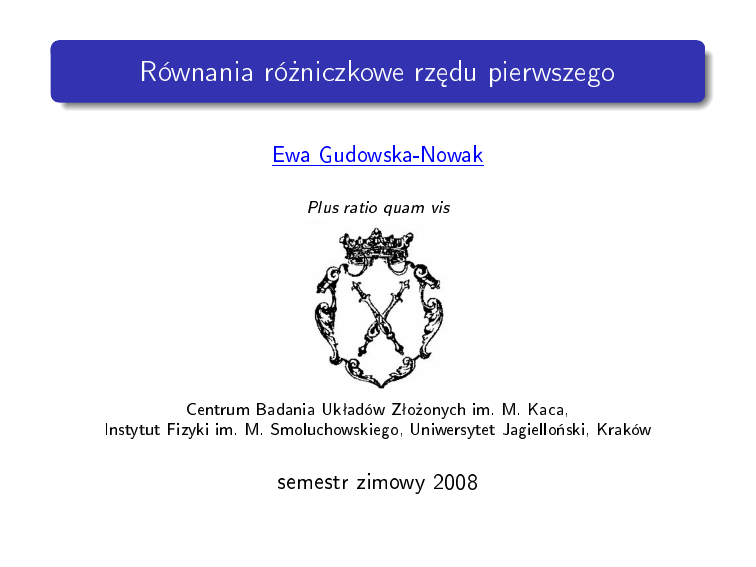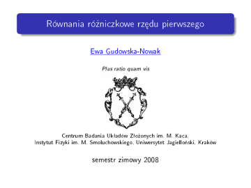 Równania ró»niczkowe rz¦du pierwszego Ewa Gudowska-Nowak Plus ratio quam vis Centrum Badania Ukªadów Zªo»onych im. M. Kaca, Instytut Fizyki im. M. Smoluchowskiego, Uniwersytet Jagiello«ski, Kraków semestr zimowy 2008 Wprowadzenie Podej±cie geometryczne Analiza graczna Jednoznaczno±¢ rozwi¡za« Stabilno±¢-doprecyzowanie... Podsumowanie Przykªady Równania ró»niczkowe zwyczajne Wprowadzenie najprostsze mo»liwe... Ewa Gudowska-Nowak Wst¦p do teorii ukªadów dynamicznych Wprowadzenie Podej±cie geometryczne Analiza graczna Jednoznaczno±¢ rozwi¡za« Stabilno±¢-doprecyzowanie... Podsumowanie Przykªady Równania ró»niczkowe zwyczajne Zªe dobrego pocz¡tki... Posta¢ ogólna równania rz¦du pierwszego f (t , x , dx dt ) = 0. je±li daje si¦ rozwi¡za¢ ze wzgl¦du na pierwsza pochodn¡, to dx = f (x , t ) dt powy»sze mo»na przedstawic jako P (t , x )dt + Q (t , x )dx = 0 rozwi¡zaniem w pewnym przedziale I nazywamy funkcj¦ rózniczkowaln¡ x = φ(t ) tak¡, »e po jej podstawieniu do jednego z równa« jak wy»ej, przechodzi ono w to»samo±¢ je±li np. φ(t , x , C ) speªnia równanie dx dt = f (x , t ), to φ jest rozwi¡zaniem (caªk¡) ogóln¡ tego równania dla konkretnego warunku poczatkowego rozwi¡zanie to przechodzi w caªk¦ szczególn¡... Ewa Gudowska-Nowak Wst¦p do teorii ukªadów dynamicznych Wprowadzenie Podej±cie geometryczne Analiza graczna Jednoznaczno±¢ rozwi¡za« Stabilno±¢-doprecyzowanie... Podsumowanie Przykªady Równania ró»niczkowe zwyczajne Wprowadzenie Zagadnienia potok fazowy kierunki styczne pole kierunków stycznych punkty ekstremalne Steven H. Strogatz Nonlinear Dynamics and Chaos with Applications , Westview, (1994) Heinz G. Schuster Chaos deterministyczny, PWN, Warszawa (1995) to Physics, Biology, Chemistry and Engineering Herman Haken , Springer, Berlin (1982) Synergetics Ewa Gudowska-Nowak Wst¦p do teorii ukªadów dynamicznych Wprowadzenie Podej±cie geometryczne Analiza graczna Jednoznaczno±¢ rozwi¡za« Stabilno±¢-doprecyzowanie... Podsumowanie Przykªady ukªady 1-dim Podej±cie geometryczne rozwi¡zaniu ogólnemu odpowiada "potok fazowy", z którego dla konkretnej warto±ci staªej C (warunki pocz¡tkowe!) wybieramy pewna krzyw¡ caªkowa zagadnienie Cauchy'ego - znajdowanie rozwiazania x = φ(t ) speªniajacego warunek pocz¡tkowy φ(t0 ) = x0 przez dowolny punkt krzywej calkowej mozemy przeprowadzi¢ prosta, która nachylona jest do osi 0X pod k¡tem arctg (f (t , x )). Zatem równanie ró»niczkowe okresla zbiór kierunkow stycznych pole kierunków stycznych: przyporz¡dkowanie ka»demu z kierunków wektora (strzaªki) Ewa Gudowska-Nowak Wst¦p do teorii ukªadów dynamicznych Wprowadzenie Podej±cie geometryczne Analiza graczna Jednoznaczno±¢ rozwi¡za« Stabilno±¢-doprecyzowanie... Podsumowanie Przykªady ukªady 1-dim Podej±cie geometryczne punkty ekstremalne równania dx dt = f (t , x ). Je±li rozwi¡zanie jawne x = φ(t ) speªnia to równanie, w punktach ekstremalnych mamy ddtφ = f (t , φ(t )) = 0, lub inaczej f (t , x ) = 0 niech t0 oznacza odci¦t¦ ekstremum - wówczas mówimy o maksimum, je±li φ” (t0 ) < 0 oraz o minimum, jesli φ” (t0 ) > 0 ukªady autonomiczne: funkcja f (x ) nie zale»y explicite od czasu dla ukªadów autonomicznych: punkty staªe wyznaczane przez x (t ) = x ∗ , t ∈ R s¡ (staªymi, tj. niezale»nymi od czasu) rozwi¡zaniami ẋ = f (x ) przy warunku x (0) = x ∗ inaczej : punkty "równowagi" Ewa Gudowska-Nowak Wst¦p do teorii ukªadów dynamicznych Wprowadzenie Podej±cie geometryczne Analiza graczna Jednoznaczno±¢ rozwi¡za« Stabilno±¢-doprecyzowanie... Podsumowanie Przykªady ukªady 1-dim O u»yteczno±ci analizy gracznej rozwa»my równanie nieliniowe ẋ = sin x ; niech t oznacza czas, a ẋ pr¦dko±¢ wyimaginowanej cz¡steczki, która przyjmuje poªo»enie x potok fazowy "porusza" si¦ w prawo je±li sin(x ) > 0 (dodatnia pr¦dko±¢) i w lewo, gdy sin x < 0 (pr¦dko±¢ ujemna) punkty staªe x ∗ = k π wyznaczone z równania ẋ = 0 rozpatrzmy punkty stabilne i niestabilne Ewa Gudowska-Nowak Wst¦p do teorii ukªadów dynamicznych Wprowadzenie Podej±cie geometryczne Analiza graczna Jednoznaczno±¢ rozwi¡za« Stabilno±¢-doprecyzowanie... Podsumowanie Przykªady Graczna analiza jako±ciowa Trajektoria x (t ) Zachowania asymptotyczne Graczna analiza jako±ciowa Ewa Gudowska-Nowak Wst¦p do teorii ukªadów dynamicznych Wprowadzenie Podej±cie geometryczne Analiza graczna Jednoznaczno±¢ rozwi¡za« Stabilno±¢-doprecyzowanie... Podsumowanie Przykªady Graczna analiza jako±ciowa Trajektoria x (t ) Zachowania asymptotyczne dx dostajemy przez scaªkowanie Rozwi¡zanie analityczne dt = sin x 1 +cos x t + C = − log | sin x |. St¡d je±li x (0) = x0 , to C = − log | 1 + cos x0 |, sin x0 (1) (2) albo inaczej t [1 + cos(x0 )] sin(x ) = log sin(x )[1 + cos(x )] 0 (3) Z warunkiem x0 = π/3 znajdujemy, »e x (t ) dla t = 12 speªnia [1 + cos(π/3)] sin(x ) = 12 log sin(π/3)[1 + cos(x )] Ewa Gudowska-Nowak Wst¦p do teorii ukªadów dynamicznych (4) Wprowadzenie Podej±cie geometryczne Analiza graczna Jednoznaczno±¢ rozwi¡za« Stabilno±¢-doprecyzowanie... Podsumowanie Przykªady Graczna analiza jako±ciowa Trajektoria x (t ) Zachowania asymptotyczne Zachowania asymptotyczne Zachowanie "trajektorii" potoku dla 0 ¬ t ¬ 10, zwró¢ uwag¦ na ró»nice w warunkach pocz¡tkowych ẋ = sin x Ewa Gudowska-Nowak Wst¦p do teorii ukªadów dynamicznych Wprowadzenie Podej±cie geometryczne Analiza graczna Jednoznaczno±¢ rozwi¡za« Stabilno±¢-doprecyzowanie... Podsumowanie Przykªady Graczna analiza jako±ciowa Trajektoria x (t ) Zachowania asymptotyczne Punkt materialny rozpoczyna ewolucj¦ z pozycji x0 = π/4 i porusza si¦ coraz szybciej w prawo, a» do osi¡gni¦cia x = π/2 (maksimum funkcji sin x ). Po przej±ciu przez ten punkt, "ruch" zostaje zwolniony i zmierza do staªego punktu stabilnego x = π . Ewa Gudowska-Nowak Wst¦p