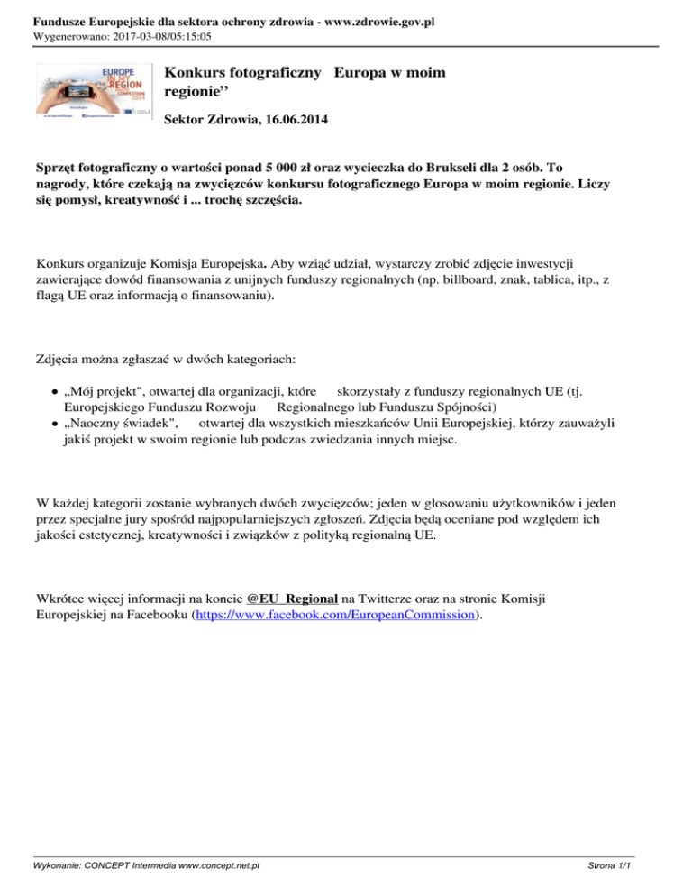Fundusze Europejskie dla sektora ochrony zdrowia - www.zdrowie.gov.pl Wygenerowano: 2017-03-08/05:15:05 Konkurs fotograficzny „Europa w moim regionie” Sektor Zdrowia, 16.06.2014 Sprzęt fotograficzny o wartości ponad 5 000 zł oraz wycieczka do Brukseli dla 2 osób. To nagrody, które czekają na zwycięzców konkursu fotograficznego Europa w moim regionie. Liczy się pomysł, kreatywność i ... trochę szczęścia. Konkurs organizuje Komisja Europejska. Aby wziąć udział, wystarczy zrobić zdjęcie inwestycji zawierające dowód finansowania z unijnych funduszy regionalnych (np. billboard, znak, tablica, itp., z flagą UE oraz informacją o finansowaniu). Zdjęcia można zgłaszać w dwóch kategoriach: „Mój projekt", otwartej dla organizacji, które skorzystały z funduszy regionalnych UE (tj. Europejskiego Funduszu Rozwoju Regionalnego lub Funduszu Spójności) „Naoczny świadek", otwartej dla wszystkich mieszkańców Unii Europejskiej, którzy zauważyli jakiś projekt w swoim regionie lub podczas zwiedzania innych miejsc. W każdej kategorii zostanie wybranych dwóch zwycięzców; jeden w głosowaniu użytkowników i jeden przez specjalne jury spośród najpopularniejszych zgłoszeń. Zdjęcia będą oceniane pod względem ich jakości estetycznej, kreatywności i związków z polityką regionalną UE. Wkrótce więcej informacji na koncie @EU_Regional na Twitterze oraz na stronie Komisji Europejskiej na Facebooku (https://www.facebook.com/EuropeanCommission). Wykonanie: CONCEPT Intermedia www.concept.net.pl Strona 1/1