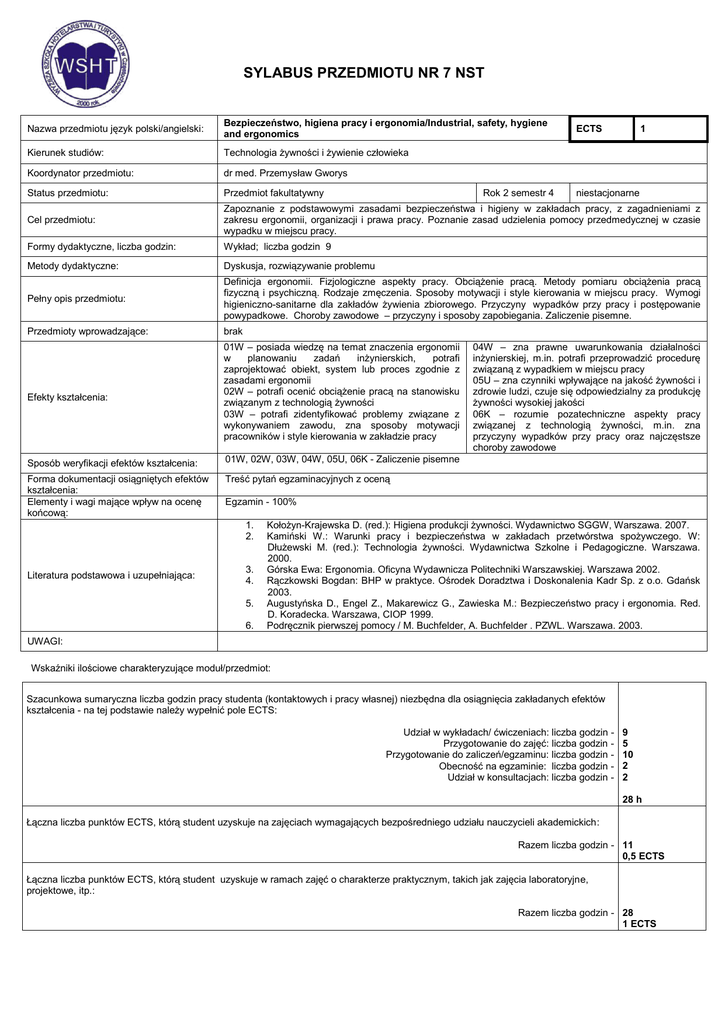 SYLABUS PRZEDMIOTU NR 7 NST Nazwa przedmiotu język polski/angielski: Bezpieczeństwo, higiena pracy i ergonomia/Industrial, safety, hygiene and ergonomics Kierunek studiów: Technologia żywności i żywienie człowieka Koordynator przedmiotu: dr med. Przemysław Gworys Status przedmiotu: Przedmiot fakultatywny Cel przedmiotu: Zapoznanie z podstawowymi zasadami bezpieczeństwa i higieny w zakładach pracy, z zagadnieniami z zakresu ergonomii, organizacji i prawa pracy. Poznanie zasad udzielenia pomocy przedmedycznej w czasie wypadku w miejscu pracy. Formy dydaktyczne, liczba godzin: Wykład; liczba godzin 9 Metody dydaktyczne: Dyskusja, rozwiązywanie problemu Pełny opis przedmiotu: Definicja ergonomii. Fizjologiczne aspekty pracy. Obciążenie pracą. Metody pomiaru obciążenia pracą fizyczną i psychiczną. Rodzaje zmęczenia. Sposoby motywacji i style kierowania w miejscu pracy. Wymogi higieniczno-sanitarne dla zakładów żywienia zbiorowego. Przyczyny wypadków przy pracy i postępowanie powypadkowe. Choroby zawodowe – przyczyny i sposoby zapobiegania. Zaliczenie pisemne. Przedmioty wprowadzające: brak Efekty kształcenia: Rok 2 semestr 4 01W – posiada wiedzę na temat znaczenia ergonomii w planowaniu zadań inżynierskich, potrafi zaprojektować obiekt, system lub proces zgodnie z zasadami ergonomii 02W – potrafi ocenić obciążenie pracą na stanowisku związanym z technologią żywności 03W – potrafi zidentyfikować problemy związane z wykonywaniem zawodu, zna sposoby motywacji pracowników i style kierowania w zakładzie pracy Sposób weryfikacji efektów kształcenia: 01W, 02W, 03W, 04W, 05U, 06K - Zaliczenie pisemne Forma dokumentacji osiągniętych efektów kształcenia: Elementy i wagi mające wpływ na ocenę końcową: Treść pytań egzaminacyjnych z oceną 1 niestacjonarne 04W – zna prawne uwarunkowania działalności inżynierskiej, m.in. potrafi przeprowadzić procedurę związaną z wypadkiem w miejscu pracy 05U – zna czynniki wpływające na jakość żywności i zdrowie ludzi, czuje się odpowiedzialny za produkcję żywności wysokiej jakości 06K – rozumie pozatechniczne aspekty pracy związanej z technologią żywności, m.in. zna przyczyny wypadków przy pracy oraz najczęstsze choroby zawodowe Egzamin - 100% 1. 2. Literatura podstawowa i uzupełniająca: ECTS 3. 4. 5. 6. Kołożyn-Krajewska D. (red.): Higiena produkcji żywności. Wydawnictwo SGGW, Warszawa. 2007. Kamiński W.: Warunki pracy i bezpieczeństwa w zakładach przetwórstwa spożywczego. W: Dłużewski M. (red.): Technologia żywności. Wydawnictwa Szkolne i Pedagogiczne. Warszawa. 2000. Górska Ewa: Ergonomia. Oficyna Wydawnicza Politechniki Warszawskiej. Warszawa 2002. Rączkowski Bogdan: BHP w praktyce. Ośrodek Doradztwa i Doskonalenia Kadr Sp. z o.o. Gdańsk 2003. Augustyńska D., Engel Z., Makarewicz G., Zawieska M.: Bezpieczeństwo pracy i ergonomia. Red. D. Koradecka. Warszawa, CIOP 1999. Podręcznik pierwszej pomocy / M. Buchfelder, A. Buchfelder . PZWL. Warszawa. 2003. UWAGI: Wskaźniki ilościowe charakteryzujące moduł/przedmiot: Szacunkowa sumaryczna liczba godzin pracy studenta (kontaktowych i pracy własnej) niezbędna dla osiągnięcia zakładanych efektów kształcenia - na tej podstawie należy wypełnić pole ECTS: Udział w wykładach/ ćwiczeniach: liczba godzin Przygotowanie do zajęć: liczba godzin Przygotowanie do zaliczeń/egzaminu: liczba godzin Obecność na egzaminie: liczba godzin Udział w konsultacjach: liczba godzin - 9 5 10 2 2 28 h Łączna liczba punktów ECTS, którą student uzyskuje na zajęciach wymagających bezpośredniego udziału nauczycieli akademickich: Razem liczba godzin - 11 0,5 ECTS Łączna liczba punktów ECTS, którą student uzyskuje w ramach zajęć o charakterze praktycznym, takich jak zajęcia laboratoryjne, projektowe, itp.: Razem liczba godzin - 28 1 ECTS Tabela zgodności kierunkowych efektów kształcenia efektami przedmiotu: Nr /symbol efektu 01W 02W 03W 04W 05U 06K Wymienione w wierszu efekty kształcenia: posiada wiedzę na temat znaczenia ergonomii w planowaniu zadań inżynierskich, potrafi zaprojektować obiekt, system lub proces zgodnie z zasadami ergonomii potrafi ocenić obciążenie pracą na stanowisku związanym z technologią żywności potrafi zidentyfikować problemy związane z wykonywaniem zawodu, zna sposoby motywacji pracowników i style kierowania w zakładzie pracy zna prawne uwarunkowania działalności inżynierskiej, m.in. potrafi przeprowadzić procedurę związaną z wypadkiem w miejscu pracy zna czynniki wpływające na jakość żywności i zdrowie ludzi, czuje się odpowiedzialny za produkcję żywności wysokiej jakości rozumie pozatechniczne aspekty pracy związanej z technologią żywności, m.in. zna przyczyny wypadków przy pracy oraz najczęstsze choroby zawodowe Odniesienie do efektów dla programu kształcenia na kierunku W01, U02 W02 K03 W04 U01, K03 K03
