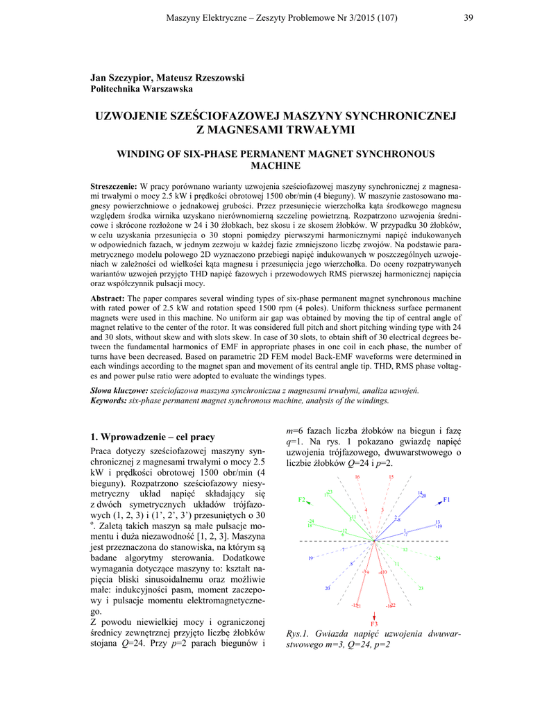Maszyny Elektryczne – Zeszyty Problemowe Nr 3/2015 (107) 39 Jan Szczypior, Mateusz Rzeszowski Politechnika Warszawska UZWOJENIE SZEŚCIOFAZOWEJ MASZYNY SYNCHRONICZNEJ Z MAGNESAMI TRWAŁYMI WINDING OF SIX-PHASE PERMANENT MAGNET SYNCHRONOUS MACHINE Streszczenie: W pracy porównano warianty uzwojenia sześciofazowej maszyny synchronicznej z magnesami trwałymi o mocy 2.5 kW i prędkości obrotowej 1500 obr/min (4 bieguny). W maszynie zastosowano magnesy powierzchniowe o jednakowej grubości. Przez przesunięcie wierzchołka kąta środkowego magnesu względem środka wirnika uzyskano nierównomierną szczelinę powietrzną. Rozpatrzono uzwojenia średnicowe i skrócone rozłożone w 24 i 30 żłobkach, bez skosu i ze skosem żłobków. W przypadku 30 żłobków, w celu uzyskania przesunięcia o 30 stopni pomiędzy pierwszymi harmonicznymi napięć indukowanych w odpowiednich fazach, w jednym zezwoju w każdej fazie zmniejszono liczbę zwojów. Na podstawie parametrycznego modelu polowego 2D wyznaczono przebiegi napięć indukowanych w poszczególnych uzwojeniach w zależności od wielkości kąta magnesu i przesunięcia jego wierzchołka. Do oceny rozpatrywanych wariantów uzwojeń przyjęto THD napięć fazowych i przewodowych RMS pierwszej harmonicznej napięcia oraz współczynnik pulsacji mocy. Abstract: The paper compares several winding types of six-phase permanent magnet synchronous machine with rated power of 2.5 kW and rotation speed 1500 rpm (4 poles). Uniform thickness surface permanent magnets were used in this machine. No uniform air gap was obtained by moving the tip of central angle of magnet relative to the center of the rotor. It was considered full pitch and short pitching winding type with 24 and 30 slots, without skew and with slots skew. In case of 30 slots, to obtain shift of 30 electrical degrees between the fundamental harmonics of EMF in appropriate phases in one coil in each phase, the number of turns have been decreased. Based on parametric 2D FEM model Back-EMF waveforms were determined in each windings according to the magnet span and movement of its central angle tip. THD, RMS phase voltages and power pulse ratio were adopted to evaluate the windings types. Słowa kluczowe: sześciofazowa maszyna synchroniczna z magnesami trwałymi, analiza uzwojeń. Keywords: six-phase permanent magnet synchronous machine, analysis of the windings. 1. Wprowadzenie – cel pracy Praca dotyczy sześciofazowej maszyny synchronicznej z magnesami trwałymi o mocy 2.5 kW i prędkości obrotowej 1500 obr/min (4 bieguny). Rozpatrzono sześciofazowy niesymetryczny układ napięć składający się z dwóch symetrycznych układów trójfazowych (1, 2, 3) i (1’, 2’, 3’) przesuniętych o 30 o . Zaletą takich maszyn są małe pulsacje momentu i duża niezawodność [1, 2, 3]. Maszyna jest przeznaczona do stanowiska, na którym są badane algorytmy sterowania. Dodatkowe wymagania dotyczące maszyny to: kształt napięcia bliski sinusoidalnemu oraz możliwie małe: indukcyjności pasm, moment zaczepowy i pulsacje momentu elektromagnetycznego. Z powodu niewielkiej mocy i ograniczonej średnicy zewnętrznej przyjęto liczbę żłobków stojana Q=24. Przy p=2 parach biegunów i m=6 fazach liczba żłobków na biegun i fazę q=1. Na rys. 1 pokazano gwiazdę napięć uzwojenia trójfazowego, dwuwarstwowego o liczbie żłobków Q=24 i p=2. 16 15 -23 17 F2 14 -20 4 -11 5 -24 18 F1 3 2 -8 13 -19 -12 6 1 -7 7 12 19 24 8 11 -3 9 -410 20 23 -1521 -1622 F3 Rys.1. Gwiazda napięć uzwojenia dwuwarstwowego m=3, Q=24, p=2 40 Maszyny Elektryczne – Zeszyty Problemowe Nr 3/2015 (107) Z rysunku tego wynika, że uzwojenie takie można łatwo przekształcić w interesujące nas uzwojenie sześciofazowe (2x3f/30). Dolne boki zezwojów poszczególnych faz powinny być umieszczone odpowiednio w żłobkach (1, -7, 13, -19) faza 1, (2, -8, 14, -20) faza 1’, (5, 11, 17 -23) faza 2, (6, -12, 18, -24) faza 2’, (9, -15, 21 -3) faza 3, (10, -16, 22, -4) faza 3’. Z rys. 1 wynika, że składowe napięć w grupach fazowych mają tę samą fazę. Współczynnik grupy takiego uzwojenia jest równy 1, a kształt napięcia – jego chwilowy przebieg zależy tylko od przestrzennego rozkładu pola magnetycznego. Przy 24 żłobkach rozpatrzono uzwojenie dwuwarstwowe średnicowe o poskoku y=6, dla którego współczynnik uzwojenia ku1=1 i uzwojenie skrócone o poskoku y=5 żłobków, dla którego współczynnik uzwojenia jest równy współczynnikowi skrótu (1) i jest równy ku2=0.966. yπ (1) k s = sin( ) τ 2 gdzie: y – poskok uzwojenia i τ – podziałka biegunowa są mierzone liczbą żłobków. Oprócz dwóch wariantów uzwojenia z 24 żłobkami rozpatrzono jeszcze uzwojenie o liczbie żłobków Q=30. Jest to uzwojenie ułamkowo-żłobkowe o q=1,25. Gwiazdę napięć dwuwarstwowego uzwojenia trójfazowego o Q=30 żłobkach pokazano na rys. 2. 19 20 -28 18 21 F2 -25 -29 17 -13 22 5 F1 4 3 6 -14 7 -30 -24 -10 2 23 16 -9 -15 1 8 -8 -23 15 9 30 14 10 24 -3 11 -4 12 -5 13 29 25 -18 28 26 -19 27 -20 F3 Rys.2. Gwiazda napięć uzwojenia dwuwarstwowego m=3, Q=30, p=2 Przy tej liczbie żłobków podział grup fazowych uzwojenia trójfazowego na dwie podgrupy przesunięte o 30 stopni jest możliwy tylko przy zmniejszeniu liczby zwojów w pewnych zezwojach poszczególnych faz. Wybrano do tego zezwoje leżące w żłobkach, reprezentowanych przez promienie najbardziej odchylone od osi poszczególnych faz. Są to odpowiednio żłobki: 9 w 1 fazie, 24 w fazie 1’, 14 w 2 fazie, 29 w fazie 2’, 4 w 3 fazie, 19 w fazie 3’. Z sumowania wektorowego promieni 1, -8, 16, -23 i zredukowanego promienia -9 oraz 2, -10, 17, -25 i zredukowanego 24 oraz warunku przesunięcia sum o 30 stopni wyznaczono współczynnik krz zmniejszenia liczby zwojów w wybranych żłobkach. Współczynnik ten spełnia równanie (2) i wynosi 0.8045 π π π j j j π (2) arg( 2e 30 + 2 e 10 + k rz e 6 ) = 12 Z rys. 2 wynika, że napięcie fazowe powst