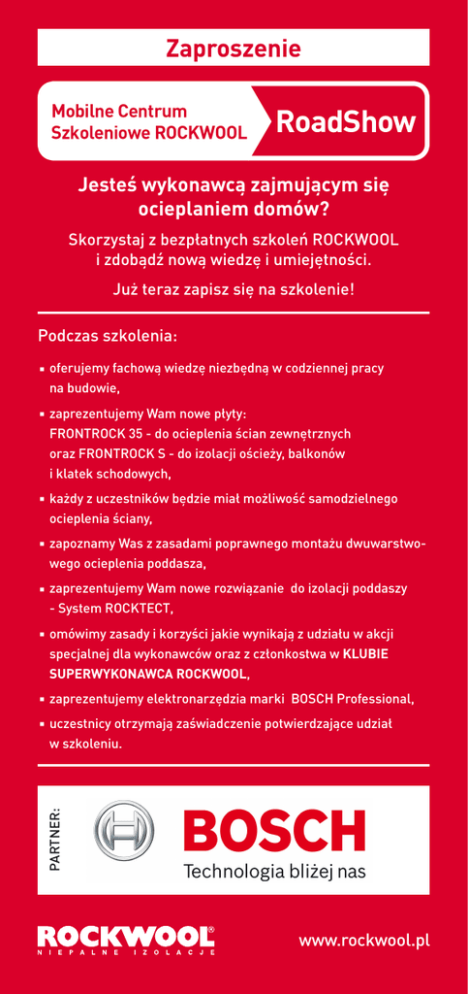 Zaproszenie Jesteś wykonawcą zajmującym się ocieplaniem domów? Skorzystaj z bezpłatnych szkoleń ROCKWOOL i zdobądź nową wiedzę i umiejętności. Już teraz zapisz się na szkolenie! Podczas szkolenia: fachową wiedzę niezbędną w codziennej pracy · oferujemy na budowie, Wam nowe płyty: · zaprezentujemy FRONTROCK 35 - do ocieplenia ścian zewnętrznych oraz FRONTROCK S - do izolacji ościeży, balkonów i klatek schodowych, z uczestników będzie miał możliwość samodzielnego · każdy ocieplenia ściany, Was z zasadami poprawnego montażu dwuwarstwo· zapoznamy wego ocieplenia poddasza, Wam nowe rozwiązanie do izolacji poddaszy · zaprezentujemy - System ROCKTECT, zasady i korzyści jakie wynikają z udziału w akcji · omówimy specjalnej dla wykonawców oraz z członkostwa w KLUBIE SUPERWYKONAWCA ROCKWOOL, zaprezentujemy elektronarzędzia marki BOSCH Professional, PARTNER: · otrzymają zaświadczenie potwierdzające udział · uczestnicy w szkoleniu. www.rockwool.pl Zaproszenie RoadShow to wyjątkowa okazja, aby spotkać się w gronie profesjonalistów, wymienić doświadczenia i nawiązać nowe znajomości. Udział w szkoleniu jest bezpłatny. Nie czekaj. Liczba miejsc jest ograniczona. O uczestnictwie w szkoleniu decyduje kolejność zgłoszeń. Zapisz się na www.rockwool.pl/roadshow, telefonicznie pod numerem 801300444 lub wysyłając SMS* pod numer 4622 o treści „Szkolenie”. * Koszt wysyłki SMS zgodny z taryfą operatora. www.rockwool.pl