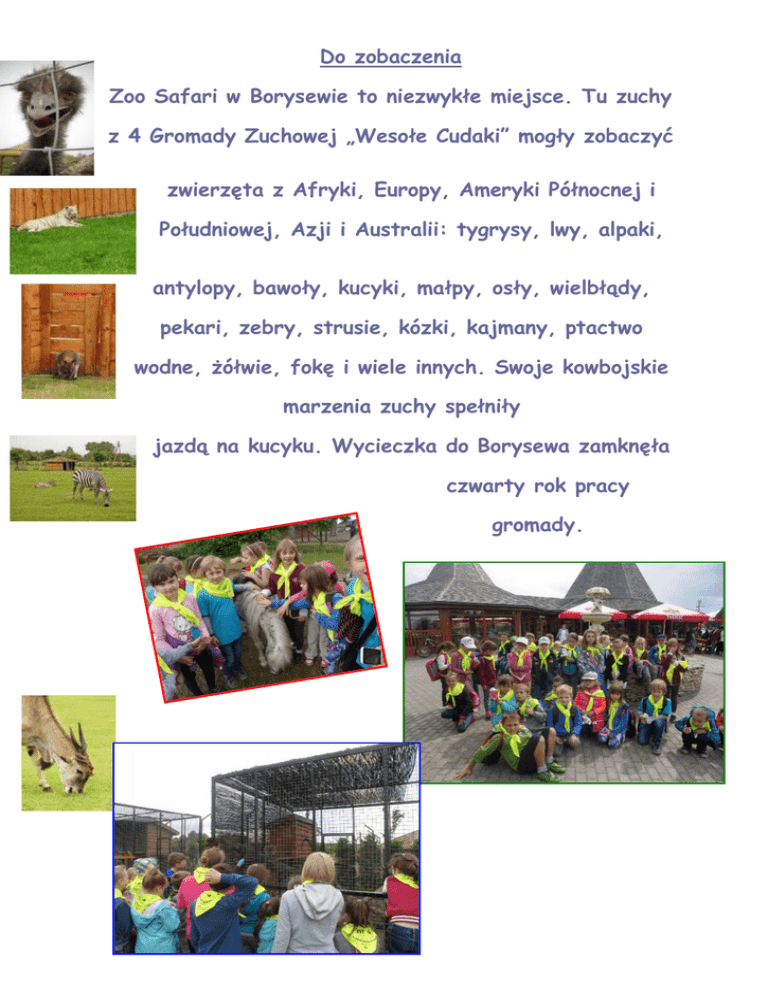 Do zobaczenia Zoo Safari w Borysewie to niezwykłe miejsce. Tu zuchy z 4 Gromady Zuchowej „Wesołe Cudaki” mogły zobaczyć zwierzęta z Afryki, Europy, Ameryki Północnej i Południowej, Azji i Australii: tygrysy, lwy, alpaki, antylopy, bawoły, kucyki, małpy, osły, wielbłądy, pekari, zebry, strusie, kózki, kajmany, ptactwo wodne, żółwie, fokę i wiele innych. Swoje kowbojskie marzenia zuchy spełniły jazdą na kucyku. Wycieczka do Borysewa zamknęła czwarty rok pracy gromady.