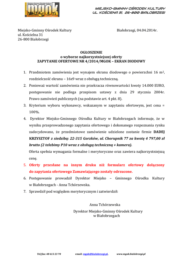 MIEJSKO-GMINNY OŚRODEK KULTURY UL. KOŚCIENA 31, 26-800 BIAŁOBRZEGI Miejsko-Gminny Ośrodek Kultury ul. Kościelna 31 26-800 Białobrzegi Białobrzegi, 04.04.2014r. OGŁOSZENIE o wyborze najkorzystniejszej oferty ZAPYTANIE OFERTOWE NR 4/2014/MGOK – EKRAN DIODOWY 1. Przedmiotem zamówienia jest wynajem ekranu diodowego o powierzchni 16 m2, rozdzielczość ekranu – 16x9 wraz z obsługą techniczną. 2. Ponieważ wartość zamówienia nie przekracza równowartości kwoty 14.000 EURO, postępowanie nie podlega przepisom ustawy z dnia 29 stycznia 2004r. Prawo zamówień publicznych (na podstawie art. 4 pkt. 8). 3. Kryterium wyboru wykonawcy, wskazanym w zapytaniu ofertowym, jest cena = 100%. 4. Dyrektor Miejsko-Gminnego Ośrodka Kultury w Białobrzegach informuje, że w wyniku przeprowadzonego zapytania ofertowego i dokonanego rozpoznania rynku zadecydowano, że przedmiotowe zamówienie udzielone zostanie firmie DADEJ KRZYSZTOF z siedzibą: 22-315 Gorzków, ul. Chorupnik 77 za kwotę 4 797,00 zł brutto (2 telebimy P10 wraz z obsługą techniczną + kamera). Oferta spełnia wymagania formalne i merytoryczne oraz zawiera najkorzystniejszą cenę. 5. Oferty przesłane na innym druku niż formularz ofertowy dołączony do zapytania ofertowego Zamawiającego zostały odrzucone. 6. Postępowanie prowadził Dyrektor Miejsko – Gminnego Ośrodka Kultury w Białobrzegach - Anna Tchórzewska. 7. Sprawdził pod względem merytorycznym i zatwierdził: Anna Tchórzewska Dyrektor Miejsko-Gminny Ośrodek Kultury w Białobrzegach Tel/fax: 48 613 23 70 email: [email protected], www.mgok.bialobrzegi.pl