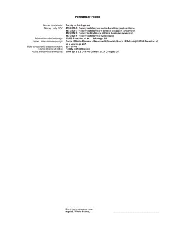 Przedmiar robót Nazwa zamówienia: Nazwy i kody CPV: Adres obiektu budowlanego: Nazwa i adres zamawiającego: Data opracowania przedmiaru robót: Nazwa obiektu lub robót: Nazwa jednostki opracowującej: Roboty technologiczne 45330000-9 Roboty instalacyjne wodno-kanalizacyjne i sanitarne 45332400-7 Roboty instalacyjne w zakresie urządzeń sanitarnych 45212212-5 Roboty budowlane w zakresie basenów pływackich 45332200-5 Roboty instalacyjne hydrauliczne 35-959 Rzeszów; ul. ks J. Jałowego 23A Gmina i Miasto Rzeszów - Rzeszowski Ośrodek Sportu i I Rekreacji 35-959 Rzeszów; ul. ks J. Jałowego 23A 2016-08-08 Roboty technologiczne MWM Sp. z o.o ; 44-100 Gliwice; ul. A. Grotgera 35 Kosztorys opracowany przez: mgr inż. Witold Franke, .................................................................................................... ROSiR_Roboty_technologiczne Zuzia10 (C) Datacomp 1994-2011(lic. 12209) strona nr: 2 Spis działów przedmiaru robót Nr Nazwa działu robót 1 Kody CPV: 45330000-9 Roboty instalacyjne wodno-kanalizacyjne i sanitarne 45332400-7 Roboty instalacyjne w zakresie urządzeń sanitarnych 45212212-5 Roboty budowlane w zakresie basenów pływackich 45332200-5 Roboty instalacyjne hydrauliczne DOSTAWY ELEMENTÓW I URZĄDZEŃ TECHNOLOGICZNYCH 1.1 Dostawa elementów wyposażenia basenów zgodnie z zestaw. w PT 1.2 Dostawa pomp obiegowych zgodnie z PT 1.3 Dostawa pomp atrakcji wodnych zgodnie z PT 1.4 Dostawa dmuchaw atrakcji wodnych zgodnie z PT 1.5 Montaż układu do pomiaru prametrów fizykochemicznych cieczy 1.6 Montaż układów do regulacji poziomu wody 1.7 Dostawa pozostałych urządzeń technologicznych 1.8 Dostawa i montaz pompy dozującej z silnikiem krokowym o wydajności 0,6 do 6 l/h wraz z lancą ssawną i zaworem dozującym i przewodem dl 50 mb 1.9 Dostawa i montaż rotametru o przepływie 0 - 1000 l/h z czujnikami min i max 2 Kody CPV: 45330000-9 Roboty instalacyjne wodno-kanalizacyjne i sanitarne 45332400-7 Roboty instalacyjne w zakresie urządzeń sanitarnych 45212212-5 Roboty budowlane w zakresie basenów pływackich 45332200-5 Roboty instalacyjne hydrauliczne MONTAŻ ELEMENTÓW I URZĄDZEŃ TECHNOLOGICZNYCH 2.1 Montaż pomp obiegowych SUW 2.2 Montaż pomp atrakcji wodnych 2.3 Montaż dmuchaw leżanek powietrznych 2.4 Montaż dmuchawy gejzerów powietrznych 3 Kody CPV: 45330000-9 Roboty instalacyjne wodno-kanalizacyjne i sanitarne 45332400-7 Roboty instalacyjne w zakresie urządzeń sanitarnych 45212212-5 Roboty budowlane w zakresie basenów pływackich 45332200-5 Roboty instalacyjne hydrauliczne RUROCIĄGI WEWNĘTRZNE 3.1 Rurociągi z rur PVC (do wody zimnej) łączone metodą klejenia na ścianach budynków niemieszkalnych, rurociągi o średnicy zewnętrznej d=16˙mm 3.2 Rurociągi z rur PVC (do wody zimnej) łączone metodą klejenia na ścianach budynków niemieszkalnych, rurociągi o średnicy zewnętrznej 25 mm do 63˙mm - rurociąg d=25 mm 3.3 Rurociągi z rur PVC (do wody zimnej) łączone metodą klejenia na ścianach budynków niemieszkalnych, rurociągi o średnicy zewnętrznej 25 mm do 63˙mm - rurociągi d=63 mm 3.4 Rurociągi z rur PVC (do wody zimnej) łączone metodą klejenia na ścianach budynków niemieszkalnych, rurociągi o średnicy zewnętrznej 75 90 mm - rurociągi d=75 mm 3.5 Rurociągi z rur PVC (do wody zimnej) łączone metodą klejenia na ścianach budynków niemieszkalnych, rurociągi o średnicy zewnętrznej 75 90 mm - rurociągi d=90 mm 3.6 Rurociągi z rur PVC (do wody zimnej) łączone metodą klejenia na ścianach budynków niemieszkalnych, rurociągi o średnicy zewnętrznej 110-140˙mm - rurociągi d=110 mm 3.7 Rurociągi z rur PVC (do wody zimnej) łączone metodą klejenia na ścianach budynków niemieszkalnych, rurociągi o średnicy zewnętrznej 110-140˙mm - rurociągi d=140 mm 3.8 Rurociągi z rur PVC (do wody zimnej) łączone metodą klejenia na ścianach budynków niemieszkalnych, rurociągi o średnicy zewnętrznej 160˙mm 3.9 Rurociągi z rur PVC (do wody zimnej) łączone metodą klejenia na ścianach budynków niemieszkalnych, rurociągi o średnicy zewnętrznej 225 mm 3.10 Rurociągi z rur PVC (do wody zimnej) łączone metodą klejenia na ścianach budynków niemieszkalnych, rurociągi o średnicy zewnętrznej 250 mm 3.11 Rurociągi z rur PVC (do wody zimnej) łączone metodą klejenia na ścianach budynków niemieszkalnych, rurociągi o średnicy zewnętrznej 280 mm 3.12 Rurociągi z rur PVC (do wody zimnej) łączone metodą klejenia na ścianach budynków niemieszkalnych, rurociągi o średnicy zewnętrznej 315 mm 3.13 Rurociągi z rur PVC (do wody zimnej) łączone metodą klejenia na ścianach budynków niemieszkalnych, rurociągi o średnicy zewnętrznej 400 mm 3.14 Montaż rurociągów z rur polietylenowych (PE, PEHD), Fi˙500˙mm 4 Kody CPV: 45330000-9 Roboty instalacyjne wodno-kanalizacyjne i sanitarne 45332400-7 Roboty instalacyjne w zakresie urządzeń sanitarnych 45212212-5 Roboty budowlane w zakresie basenów pływackich 45332200-5 Roboty instalacyjne hydrauliczne ARMATURA 4.1 Dostawa i montaż przepustnic z PVC do połączeń kołnierzowych Dn 100 mm 4.2 Dostawa i montaż przepustnic z PVC do połączeń kołnierzowych Dn 125˙mm 4.3 Dostawa i montaż przepustnic z PVC do połączeń kołnierzowych Dn 150˙mm 4.4 Dostawa i montaż przepustnic z PVC do połączeń kołnierzowych Dn 200˙mm 4.5 Dostawa i montaż przepustnic z PVC do połączeń kołnierzowych Dn 225˙mm 4.6 Dostawa i montaż przepustnic z PVC do połączeń kołnierzowych Dn 250˙mm 4.7 Dostawa i montaż przepustnic z PVC do połączeń kołnierzowych Dn 300 mm 4.8 Dostawa i montaż przepustnic żeliwnych z przekładnią mechaniczną do połączeń kołnierzowych Dn 400 mm 4.9 Dostawa i montaż przepustnic żeliwnych z przekładnią mechaniczną do połączeń kołnierzowych Dn 500 mm Roboty technologiczne ROSiR_Roboty_technologiczne Nr 4.10 4.11 4.12 4.13 4.14 4.15 4.16 4.17 4.18 4.19 4.20 4.21 4.22 4.23 4.24 4.25 4.26 4.27