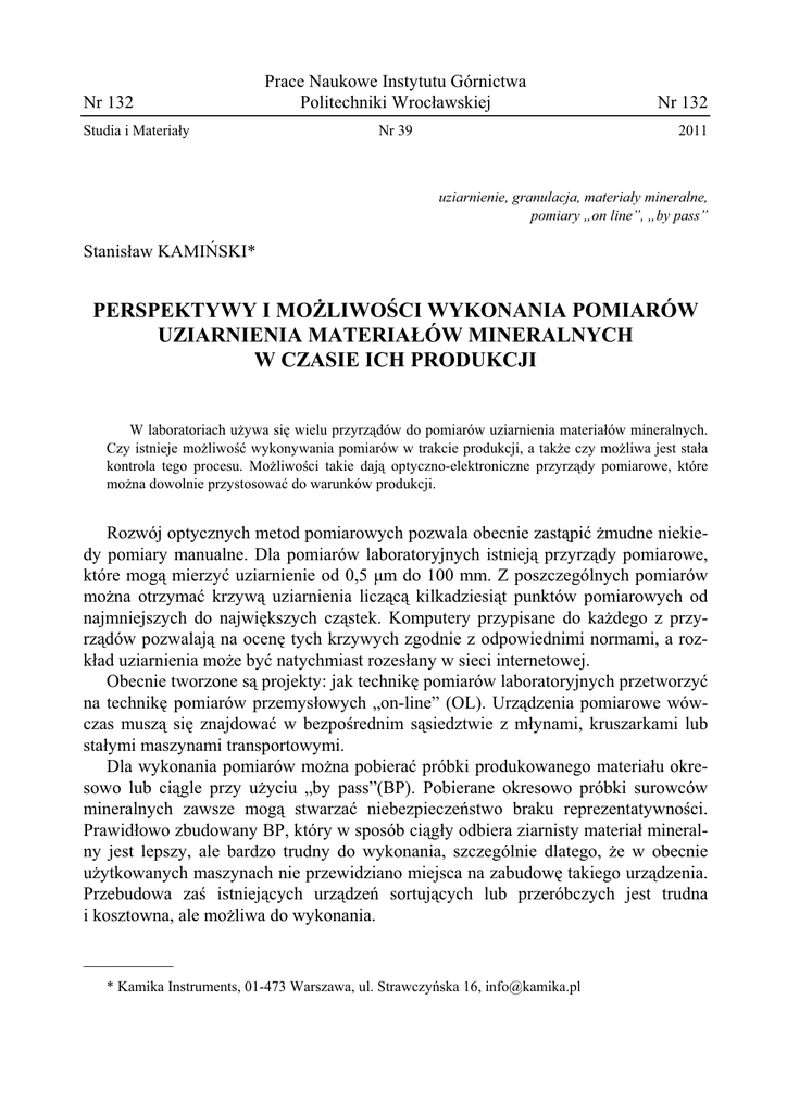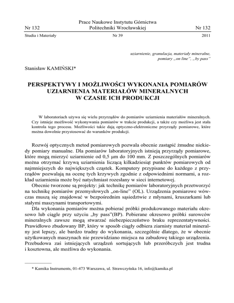 Nr 132 Studia i Materia y Prace Naukowe Instytutu Górnictwa Politechniki Wroc awskiej Nr 39 Nr 132 2011 uziarnienie, granulacja, materia y mineralne, pomiary „on line”, „by pass” Stanis aw KAMI!SKI* PERSPEKTYWY I MO LIWO!CI WYKONANIA POMIARÓW UZIARNIENIA MATERIA"ÓW MINERALNYCH W CZASIE ICH PRODUKCJI W laboratoriach u"ywa si# wielu przyrz$dów do pomiarów uziarnienia materia ów mineralnych. Czy istnieje mo"liwo%& wykonywania pomiarów w trakcie produkcji, a tak"e czy mo"liwa jest sta a kontrola tego procesu. Mo"liwo%ci takie daj$ optyczno-elektroniczne przyrz$dy pomiarowe, które mo"na dowolnie przystosowa& do warunków produkcji. Rozwój optycznych metod pomiarowych pozwala obecnie zast$pi& "mudne niekiedy pomiary manualne. Dla pomiarów laboratoryjnych istniej$ przyrz$dy pomiarowe, które mog$ mierzy& uziarnienie od 0,5 'm do 100 mm. Z poszczególnych pomiarów mo"na otrzyma& krzyw$ uziarnienia licz$c$ kilkadziesi$t punktów pomiarowych od najmniejszych do najwi#kszych cz$stek. Komputery przypisane do ka"dego z przyrz$dów pozwalaj$ na ocen# tych krzywych zgodnie z odpowiednimi normami, a rozk ad uziarnienia mo"e by& natychmiast rozes any w sieci internetowej. Obecnie tworzone s$ projekty: jak technik# pomiarów laboratoryjnych przetworzy& na technik# pomiarów przemys owych „on-line” (OL). Urz$dzenia pomiarowe wówczas musz$ si# znajdowa& w bezpo%rednim s$siedztwie z m ynami, kruszarkami lub sta ymi maszynami transportowymi. Dla wykonania pomiarów mo"na pobiera& próbki produkowanego materia u okresowo lub ci$gle przy u"yciu „by pass”(BP). Pobierane okresowo próbki surowców mineralnych zawsze mog$ stwarza& niebezpiecze(stwo braku reprezentatywno%ci. Prawid owo zbudowany BP, który w sposób ci$g y odbiera ziarnisty materia mineralny jest lepszy, ale bardzo trudny do wykonania, szczególnie dlatego, "e w obecnie u"ytkowanych maszynach nie przewidziano miejsca na zabudow# takiego urz$dzenia. Przebudowa za% istniej$cych urz$dze( sortuj$cych lub przeróbczych jest trudna i kosztowna, ale mo"liwa do wykonania. __________ * Kamika Instruments, 01-473 Warszawa, ul. Strawczy(ska 16, [email protected] 146 Produkowane obecnie laboratoryjne urz$dzenia pomiarowe optyczno-elektronicznych systemów pomiarowych mog$ by& stosunkowo szybko i tanio przekszta cone i przystosowane do pomiarów ci$g ych przy u"yciu BP. przetworzonymi wynikami pomiarów w postaci odpowiednich sygna ów elektrycznych mo"na b#dzie sterowa& maszynami przeróbczymi dla uzyskania odpowiednich w a%ciwo%ci surowców mineralnych. takie pomiary mog$ równie" s u"y& do mieszania w odpowiednich proporcjach ró"nych surowców mineralnych dla otrzymywania np. mieszanek asfaltowych. typowym rozwi$zaniem konstrukcyjnym mo"e by& schemat BP opisany na rys. 1. Rys. 1. Schemat „by pass” Fig. 1. „By pass” scheme Pod zw#"aj$c$ rur$ 1 umieszcza si# sto"ek 2, który zamocowany jest do dalszego ci$gu rur 3 transportuj$cych nosiwo. Przy podstawie sto"ka umieszczony jest wlot BP 4, pobieraj$cy pewn$ cz#%& materia u w stosunku d/()D) * 0,005. BP kieruje materia poza ruroci$g do przyrz$du pomiarowego 5, który po $czony jest z elektronicznym blokiem pomiarowym 6 i komputerem 7. 147 Przyk ady urz$dze( do pomiarów laboratoryjnych, które mog$ by& przystosowane do pomiarów OL przy stosowaniu odpowiednich BP przedstawiono na rys. 2–4, a opis tych i innych analizatorów mo"na znale+& na stronie internetowej [5]. Rys. 2. Analizator IPS UA; zakres pomiaru 0,5–2000 'm Fig. 2. IPS UA analyser; measuring range 0.5–2000 'm Rys. 3. Analizatory AWK 3D; zakres pomiaru 0,2–31,5 mm Fig. 3. AWK 3D analysers; measuring range 0.2–31.5 mm 148 Rys. 4. Analizator AWK B; zakres pomiaru 1–130 mm Fig. 4. AWK B analyser; measuring range 1–130 mm LITERATURA [1] KAMI!SKI S., ELSIEVE Optyczno-elektroniczna symulacja pomiarów mikroziaren powy!ej 0,5 mm wed ug sit mechanicznych, www.kamika.pl [2] KAMI!SKI S., KAMI!SKA D., Porównanie optyczno-elektronicznych metod pomiaru granulacji, Aparatura Badawcza i dydaktyczna, 2–3.XII, Warszawa 2007. [3] KAMI!SKI S., KAMI!SKA D., TRZCI!SKI J. Automatyczna analiza wielko"ci i kszta tu ziaren 3D z zastosowaniem analizatorów optyczno elektronicznych, 11th Baltic Sea Geotechnical Conference, 15–18 September, Gda(sk 2008. [4] KAMI!SKI S., TRZCI!SKI J., Optyczno-elektroniczny sposób okre"lania sk adu granulometrycznego gruntów i mo!liwo"ci zastosowania w geologii in!ynierskiej, Polski Kongres Geologiczny, 26– 28 czerwca 2009, Kraków. [5] www.kamika.pl OUTLOOKS AND CAPABILITIES OF MINERAL MATERIALS GRAIN SIZE MEASUREMENT DURING PRODUCTION PROCESS In laboratories one can use many analysers which can measure mineral materials grain size. Question is, is there a possibility to measure such materials during production process in order to control such process? Yes, it is possible thanks to opto-electronic analysers specially adapted to any production conditions.