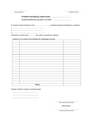 .......................................... .......................................... (pieczęć jednostki) (miejscowość, data) Protokół weryfikacji salda konta ........................................ przeprowadzonej wg stanu na dzień .................................... W wyniku przeprowadzonej w dniu ................................. weryfikacji zespół weryfikacyjny w składzie: 1. ......................................................................... 2. ......................................................................... 3. ......................................................................... stwierdził, że saldo konta ............... jest realne i prawidłowo ustalone. Ustalono, że na saldo konta składają się następujące pozycje: Razem: Podpisy członków zespołu weryfikacyjnego: .................................................. .................................................. .................................................. ............................................................ (podpis głównego księgowego) Zatwierdzam: ............................................................ (podpis kierownika jednostki)