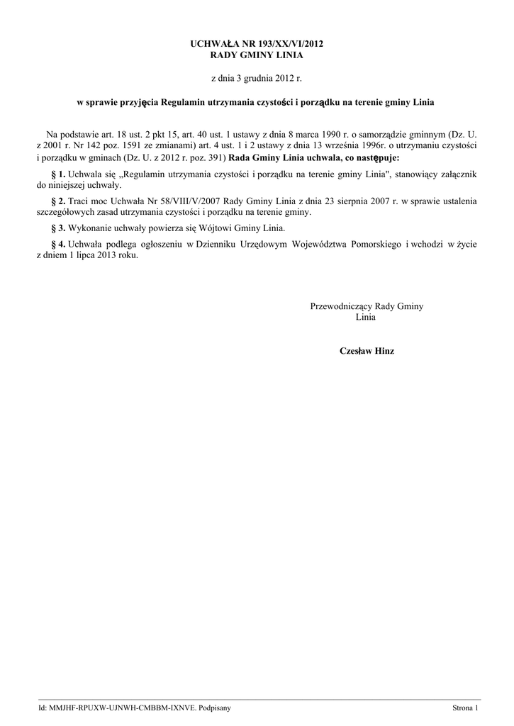 UCHWAŁA NR 193/XX/VI/2012 RADY GMINY LINIA z dnia 3 grudnia 2012 r. w sprawie przyjęcia Regulamin utrzymania czystości i porządku na terenie gminy Linia Na podstawie art. 18 ust. 2 pkt 15, art. 40 ust. 1 ustawy z dnia 8 marca 1990 r. o samorządzie gminnym (Dz. U. z 2001 r. Nr 142 poz. 1591 ze zmianami) art. 4 ust. 1 i 2 ustawy z dnia 13 września 1996r. o utrzymaniu czystości i porządku w gminach (Dz. U. z 2012 r. poz. 391) Rada Gminy Linia uchwala, co następuje: § 1. Uchwala się „Regulamin utrzymania czystości i porządku na terenie gminy Linia", stanowiący załącznik do niniejszej uchwały. § 2. Traci moc Uchwała Nr 58/VIII/V/2007 Rady Gminy Linia z dnia 23 sierpnia 2007 r. w sprawie ustalenia szczegółowych zasad utrzymania czystości i porządku na terenie gminy. § 3. Wykonanie uchwały powierza się Wójtowi Gminy Linia. § 4. Uchwała podlega ogłoszeniu w Dzienniku Urzędowym Województwa Pomorskiego i wchodzi w życie z dniem 1 lipca 2013 roku. Przewodniczący Rady Gminy Linia Czesław Hinz ————————————————————————————————————————————————————————— Id: MMJHF-RPUXW-UJNWH-CMBBM-IXNVE. Podpisany Strona 1 Załącznik do Uchwały Nr 193/XX/VI/2012 Rady Gminy Linia z dnia 3 grudnia 2012 r. REGULAMIN UTRZYMANIA CZYSTOŚCI I PORZĄDKU NA TERENIE GMINY LINIA Rozdział 1. Przepisy ogólne § 1. Regulamin określa wymagania i warunki utrzymania czystości i porządku na terenie nieruchomości znajdujących się w Gminie Linia dotyczące: 1. Wymagań w zakresie utrzymania czystości i porządku na terenie nieruchomości obejmujących: a) prowadzenie we wskazanym zakresie selektywnego zbierania i odbierania odpadów komunalnych, w tym powstających w gospodarstwach domowych przeterminowanych leków i chemikaliów, zużytych baterii i akumulatorów, zużytego sprzętu elektrycznego i elektronicznego, mebli i innych odpadów wielkogabarytowych, odpadów budowlanych i rozbiórkowych oraz zużytych opon, a także odpadów zielonych, b) uprzątanie błota, śniegu, lodu i innych zanieczyszczeń z części nieruchomości służących do użytku publicznego, c) mycie i naprawy pojazdów samochodowych poza myjniami i warsztatami naprawczymi, 2. Rodzaju i minimalnej pojemności urządzeń przeznaczonych do zbierania odpadów komunalnych na terenie nieruchomości oraz na drogach publicznych, warunków rozmieszczania tych urządzeń i ich utrzymania w odpowiednim stanie sanitarnym, porządkowym i technicznym. 3. Częstotliwości i sposobu pozbywania się odpadów komunalnych i nieczystości ciekłych z terenu nieruchomości oraz z terenów przeznaczonych do użytku publicznego. 4. Innych wymagań wynikających z wojewódzkiego planu gospodarki odpadami. 5. Obowiązków osób utrzymujących zwierzęta domowe, mających na celu ochronę przed zagrożeniem lub uciążliwością dla ludzi oraz przed zanieczyszczeniem terenów przeznaczonych do wspólnego użytku. 6. Wymagań utrzymywania zwierząt gospodarskich na terenach wyłączonych z produkcji rolniczej, w tym także zakazu ich utrzymywania na określonych obszarach lub w poszczególnych nieruchomościach. 7. Wyznaczania obszarów podlegających obowiązkowej deratyzacji i terminów jej przeprowadzania. § 2. Treść Regulaminu pozostaje w ścisłym związku z pojęciami i definicjami zawartymi w ustawie: 1) o utrzymaniu czystości i porządku w gminach z dnia 13 września 1996 r., 2) o odpadach z dnia 27 kwietnia 2001 r., 3) o zużytym sprzęcie elektrycznym i elektronicznym z dnia 29 lipca 2005 r., 4) o organizacji hodowli i rozrodzie zwierząt gospodarskich z dnia 29 czerwca 2007 r., 5) o ochronie zwierząt z dnia 21 sierpnia 1997 r. Rozdział 2. Wymagania w zakresie utrzymania czystości i porządku na terenie nieruchomości § 3. Właściciele nieruchomości obowiązani są do prowadzenia selektywnego zbierania a odbierający do odbierania następujących rodzajów odpadów: 1) zmieszane odpady opakowaniowe, w tym: papier, tekturę, metale, tworzywa sztuczne i opakowania wielomateriałowe, 2) opakowania szklane, ————————————————————————————————————————————————————————— Id: MMJHF-RPUXW-UJNWH-CMBBM-IXNVE. Podpisany Strona 1 3) meble i inne odpady wielkogabarytowe, 4) zużyty sprzęt elektryczny i elektroniczny, świetlówki i inne źródła światła, 5) przeterminowane leki i chemikalia, 6) zużyte baterie i akumulatory, 7) zużyte opony, 8) odpady zielone, 9) odpady budowlane i rozbiórkowe, 10) folia rolnicza, 11) pozostałe zmieszane odpady komunalne dalej zwane „zmieszanymi odpadami komunalnymi”. § 4. Na terenie nieruchomości pojemniki/worki na odpady należy ustawić w miejscu wyodrębnionym, dostępnym dla pracowników przedsiębiorcy odbierającego odpady lub, gdy takiej możliwości nie ma, należy wystawić je bezpośrednio przed terminem ich odbioru, przed posesję w sposób, który nie utrudnia przejścia lub przejazdu. § 5. Przyłączenia nieruchomości do istniejącej sieci kanalizacyjnej, gdy długość przyłącza nie przekracza 50 m. Podłączenie do istniejącej kanalizacji sanitarnej należy wykonać w okresie 2 lat od dnia wejścia w życie niniejszej uchwały, natomiast w przypadku budowy nowego odcinka sieci kanalizacyjnej w terminie 2 lat od dnia zakończenia budowy; 1) w przypadku braku możliwości przyłączenia nieruchomości do sieci kanalizacyjnej - wyposażenia w szczelny zbiornik bezodpływowy lub przydomową oczyszczalnię ścieków spełniającą wymagania określone w odrębnych przepisach; 2) przyłączenie nieruchomości do sieci kanalizacyjnej nie jest obowiązkowe, jeżeli nieruchomość przed wybudowaniem sieci kanalizacji sanitarnej została wyposażona w przydomową oczyszczalnię ścieków spełniającą wymagania określone w odrębnych przepisach; § 6. Usuw