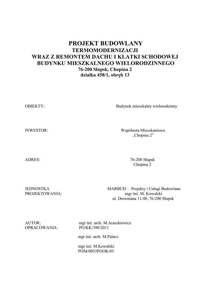 PROJEKT BUDOWLANY TERMOMODERNIZACJI WRAZ Z REMONTEM DACHU I KLATKI SCHODOWEJ BUDYNKU MIESZKALNEGO WIELORODZINNEGO 76-200 Słupsk, Chopina 2 działka 458/1, obręb 13 OBIEKTY: Budynek mieszkalny wielorodzinny INWESTOR: Wspólnota Mieszkaniowa „Chopina 2” ADRES: JEDNOSTKA PROJEKTOWANIA: AUTOR: OPRACOWANIA: 76-200 Słupsk Chopina 2 MARBUD – Projekty i Usługi Budowlane mgr inż. M. Kowalski ul. Drewniana 11/48, 76-200 Słupsk mgr inż. arch. M.Araszkiewicz PO/KK/390/2011 mgr inż. arch. M.Palacz mgr inż. M.Kowalski POM/0053POOK/05 Zawartość opracowania Część opisowa: 1. Oświadczenie projektantów o zgodności opracowania projektu z obowiązującymi przepisami oraz zasadami wiedzy technicznej budowlanego str.3 2. Opis techniczny str.4-16 3. Informacja dotycząca bezpieczeństwa i ochrony zdrowia str.17-19 4. Uprawnienia projektantów oraz aktualne zaświadczenia z właściwej izby inżynierów budownictwa str.20-24 Część graficzna: 1. Plan sytuacyjny 2. Inwentaryzacja - elewacja frontowa 3. Inwentaryzacja – elewacja boczna 4. Inwentaryzacja – elewacja tylna 5. Inwentaryzacja – rzut więźby dachowej 6. Inwentaryzacja – widok dachu 7. Inwentaryzacja – przekrój i rzut klatki schodowej 8. Elewacja frontowa – kolorystyka 9. Elewacja boczna – kolorystyka 10. Elewacja tylna – kolorystyka 11. Widok dachu- po robotach remontowych 12. Zestawienie stolarki okiennej i drzwiowej 13. Widok dachu – zakres prac remontowych 14. Szczegół docieplenia ścian zewnętrznych – widok z góry 15. Szczegół zabezpieczenia naroży okiennych i drzwiowych 16. Szczegół mocowania izolacji termicznej 17. Szczegół docieplenia naroża budynku – widok z góry 18. Szczegół docieplenia naroża budynku – aksonometria 19. Szczegół docieplenia okna i drzwi – przekrój poziomy 20. Szczegół docieplenia okna – przekrój pionowy 21. Szczegół docieplenia ściany piwnicznej – przekrój pionowy 22. Szczegół docieplenia okien piwnicznych – przekrój pionowy 23. Szczegół docieplenia balkonu – przekrój pionowy 24. Szczegół docieplenia ściany szczytowej klatki schodowej – przekrój pionowy 25. Szczegół docieplenia lukarn – przekrój pionowy 26. Szczegół docieplenia stropu nad ostatnią kondygnacją – przekrój pionowy 1:500 1:75 1:75 1:75 1:75 1:75 1:75 1:75 1:75 1:75 1:75 1:75 1:100 1:10 1:10 1:10 1:10 1:10 1:10 1:10 1:10 1:10 1:10 1:10 1:10 1:10 Słupsk, dnia 20-09-2012 OŚWIADCZENIE PROJEKTANTÓW O ZGODNOŚCI OPRACOWANIA PROJEKTU BUDOWLANEGO Z OBOWIĄZUJĄCYMI PRZEPISAMI ORAZ ZASADAMI WIEDZY TECHNICZNEJ Zgodnie z art. 20 ust. 4 ustawy z dnia 7 lipca 1994 r. Prawo budowlane (Dz. U. z 2003 r. Nr 207, poz.2016 z późniejszymi zmianami) o ś w i a d c z a m y, iż niniejszy projekt budowlany termomodernizacji wraz z remontem dachu i klatki schodowej budynku mieszkalnego wielorodzinnego Wspólnoty Mieszkaniowej „Chopina 2”, położonego w Słupsku w rejonie ulicy Chopina, zlokalizowanego na działce 458/1 obręb 13, został sporządzony zgodnie z obowiązującymi przepisami oraz zasadami wiedzy technicznej. PROJEKTANCI: OPIS TECHNICZNY 1. PODSTAWA OPRACOWANIA ÷Zlecenie inwestora – Wspólnoty Mieszkaniowej „Chopina 2”; ÷Wizja lokalna; ÷Inwentaryzacja budynku; ÷Normy i przepisy budowlane; ÷Instrukcja ITB nr334/96 „Ocieplenie ścian zewnętrznych budynków metodą „lekką”; ÷Wytyczne i informacje otrzymane od Zamawiającego; ÷Aprobata Techniczna ITB AT-15/3248/98 Łączniki tworzywowe KI 10 Koelner 2. ZAKRES OPRACOWANIA Projekt budowlany dotyczy technicznego rozwiązania docieplenia ścian zewnętrznych metodą „lekką-mokrą” wraz remontem dachu i klatki schodowej w budynku mieszkalnym wielorodzinnym w Słupsku przy ul. Chopina 2, działka 458/1, obręb 13. 3. STAN ISTNIEJĄCY Przedmiotowy budynek mieszkalny składa się z trzech kondygnacji nadziemnych, z częściowo użytkowym poddaszem oraz podpiwniczeniem. Jest to obiekt zbudowany w latach 20-tych XX - stulecia. Ściany piwnic wykonane z cegły pełnej ceramicznej pełnej gr. 38cm. Ściany parteru, piętra i II piętra wykonane z również cegły ceramicznej pełnej oraz cegły silikatowej gr.38 cm na zaprawie cementowo-wapiennej. Ściany poddasza nieużytkowego wykonane z cegły ceramicznej pełnej gr.24cm. Stropy międzykondygnacyjne o konstrukcji drewnianej, belki o wymiarach 20x14cm oparte na ścianach zewnętrznych. Biegi schodowe i spoczniki międzypiętrowe betonowe, obłożone lastrykiem lub okładziną drewnianą. Stolarka częściowo drewniana, w większości wymieniona na PCV. Istniejące okno na klatce schodowej drewniane. Pokrycie dachu wykonane z dachówki ceramicznej karpiówki ułożonej podwójnie. Budynek posiada wentylację grawitacyjną. Wyposażony jest w instalację c.o., sanitarną, elektryczną i gazową. Na podstawie wizji lokalnej stwierdzono miejscowe ubytki i odparzenia warstwy wykończeniowej ścian zewnętrznych. Warstwę wykończeniową wykonano z tynku cementowo – wapiennego barwionego w masie i w późniejszym okresie pokryto go barankiem wykonanych metodą nakrapiania. Cokół wykonany z tynku cementowego w technice drapanej. Stwierdzono zielone wykwity wokół balkonów na elewacji tylnej. Powodem zjawiska jest niewłaściwe odprowadzenie z nich wód opadowych poprzez nieszczelną poziomą izolację przeciwwodną zlokalizowaną w balkonach oraz nieszczelności przy wpustach balkonowych. 4. OBLICZENIA CIEPLNO – WILGOTNOŚCIOWE Na podstawie obliczeń cieplno-wilgotnościowych (załącznik Nr1 do opisu technicznego) oraz audytu remontowego budynku, przyjęto następującą grubość warstw dociepleniowych: - ściany zewnętrzne gr.38cm i gr. 24cm – styropian EPS 70-040 FASADA gr.14cm, 10cm i 8cm; - ściany piwnic – styropian ekstrudowany - płyty Austrotherm EPS 035 EXPERT gr.10cm; - balkon – od wewnątrz styropian EPS 70-040 FASADA gr.3cm; - ościeża okienne i drzwiowe - styropian EPS 035 EXPERT lub EPS 70-040 FASADA gr.3cm, w zależnoś