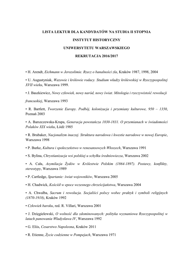 LISTA LEKTUR DLA KANDYDATÓW NA STUDIA II STOPNIA INSTYTUT HISTORYCZNY UNIWERSYTETU WARSZAWSKIEGO REKRUTACJA 2016/2017 • H. Arendt, Eichmann w Jerozolimie. Rzecz o banalności zła, Kraków 1987, 1998, 2004 • U. Augustyniak, Wazowie i królowie rodacy. Studium władzy królewskiej w Rzeczypospolitej XVII wieku, Warszawa 1999. • J. Baszkiewicz, Nowy człowiek, nowy naród, nowy świat. Mitologia i rzeczywistość rewolucji francuskiej, Warszawa 1993 • R. Bartlett, Tworzenie Europy. Podbój, kolonizacja i przemiany kulturowe, 950 – 1350, Poznań 2003 • A. Barszczewska-Krupa, Generacja powstańcza 1830-1831. O przemianach w świadomości Polaków XIX wieku, Łódź 1985 • R. Brubaker, Nacjonalizm inaczej. Struktura narodowa i kwestie narodowe w nowej Europie, Warszawa 1998 • P. Burke, Kultura i społeczeństwo w renesansowych Włoszech, Warszawa 1991 • S. Bylina, Chrystianizacja wsi polskiej u schyłku średniowiecza, Warszawa 2002 • A. Cała, Asymilacja Żydów w Królestwie Polskim (1864-1897). Postawy, konflikty, stereotypy, Warszawa 1989 • P. Cartledge, Spartanie: świat wojowników, Warszawa 2005 • H. Chadwick, Kościół w epoce wczesnego chrześcijaństwa, Warszawa 2004 • A. Chwalba, Sacrum i rewolucja. Socjaliści polscy wobec praktyk i symboli religijnych (1870-1918), Kraków 1992 • Człowiek baroku, red. R. Villari, Warszawa 2001 • J. Dzięgielewski, O wolność dla zdominowanych: polityka wyznaniowa Rzeczypospolitej w latach panowania Władysława IV, Warszawa 1992 • G. Eliis, Cesarstwo Napoleona, Kraków 2011 • R. Etienne, Życie codzienne w Pompejach, Warszawa 1971 • D. Gawin, Wielki zwrot. Ewolucja lewicy i odrodzenia społeczeństwa obywatelskiego 19561976, Kraków 2013 • A. Guriewicz, Kultura i społeczeństwo średniowiecznej Europy. Exempla XIII w., Warszawa 1997 • D. Grinberg, Ruch anarchistyczny w Europie zachodniej 1871 – 1914, Warszawa 1994 • R. Grunberger, Historia społeczna Trzeciej Rzeszy, Warszawa 1994 • J. Holzer, Europa wojen 1914-1945, Warszawa 2008 • E. Hornung, Jeden czy wielu? Koncepcja Boga w starożytnym Egipcie, Warszawa 1991 • M. Janowski, Narodziny inteligencji 1750-1831, Warszawa 2008 • J. Jedlicki, Błędne koło 1832-1864, Warszawa 2008 • J. Jedlicki, Jakiej cywilizacji Polacy potrzebują. Studia z dziejów idei i wyobraźni XIX wieku, Warszawa 1988, 2002 • T. Judt, Po wojnie: Historia Europy od roku 1945, Poznań 2008 • S. Kalemba, Wielka Emigracja 1831-1863, Toruń 2003 • Ł. Kądziela, Między zdradą a służbą Rzeczypospolitej. Fryderyk Moszyński w latach 17921793, Warszawa 1993 • A. Kersten, Hieronim Radziejowski. Studium władzy i opozycji, Warszawa 1988 • T. Kizwalter, O nowoczesności narodu – przypadek Polski, Warszawa 1999 • M. Koczerska, Rodzina szlachecka w Polsce późnośredniowiecznej, Warszawa 1975 • T. Kotula, Septymiusz Sewer. Cesarz z Lepcis Magna, Wrocław 1987 • W. Kriegseisen, Sejmiki w Rzeczypospolitej szlacheckiej w XVII i XVIII wieku, Warszawa 1991 • W. Kriegseisen, Stosunki wyznaniowe w relacjach państwo-kościół między reformacją a oświeceniem, Warszawa 2010 • C. Kuklo, Kobieta samotna w społeczeństwie miejskim u schyłku Rzeczypospolitej szlacheckiej: studium demograficzno – społeczne, Białystok 1998 • J. Kurtyka, Odrodzone Królestwo. Monarchia Władysława Łokietka i Kazimierza Wielkiego w świetle nowszych badań, Kraków 2001 • W. Lengauer, Religijność starożytnych Greków, Warszawa 1994 • H. Manikowska, Jerozolima, Rzym, Compostela: wielkie pielgrzymowanie u schyłku średniowiecza, Wrocław 2008 • A. Mączak, Klientela: nieformalne systemy władzy w Polsce i Europie XVI – XVIII w., Warszawa 2000 (lub wcześniejsze wydanie) • A. Mączak, Rządzący i rządzeni. Władza i społeczeństwo w Europie wczesnonowożytnej, wydanie II, Warszawa 2002 • Między monarchią a demokracją. Studia z dziejów Polski XV-XVIII w., red. A. SucheniGrabowska, M. Żaryn, Warszawa 1994 • J. Michalski, Rousseau i sarmacki republikanizm, Warszawa 1977 • M. Micińska, Zdrada, córka Nocy. Pojęcie zdrady narodowej w świadomości Polaków w latach 1861-1914, Warszawa 1998 • K. Modzelewski, Barbarzyńska Europa, Warszawa 2004 • K. Nawotka, Aleksander Wielki, Wrocław 2007 • D. Olszewski, Polska kultura religijna na przełomie XIX i XX wieku, Warszawa 1996 • E. Opaliński, Kultura polityczna szlachty polskiej w latach 1587 – 1652, Warszawa 1995 • K. Ożóg, Intelektualiści w służbie Królestwa Polskiego w latach 1306 – 1382, Kraków 1995 • A. Paczkowski, Wojna polsko – Jaruzelska: stan wojenny w Polsce 13 XII 1981 – 22 VII 1983, Warszawa 2007 • K. Pomian, Europa i jej narody, Warszawa 1992 • K. Reinsberg, Życie seksualne starożytnych Greków, Gdynia 1998 • E. Rostworowski, Legendy i fakty XVIII w., Warszawa 1963 • E. Rostworowski, Ostatni król Rzeczypospolitej, Warszawa 1966 • Rzeczpospolita wielu narodów i jej tradycje, red. A.K. Link-Lenczowski, M. Markiewicz, Kraków 1999 • K. Skwierczyński, Recepcja idei gregoriańskich w Polsce do początku XIII wieku, Wrocław 2005 • T. Snyder, Skrwawione ziemie, Warszawa 2011 • J. Strzelczyk, Otton III, Wrocław 2000 • T. Szarota, Życie codzienne w stolicach okupowanej Europy, Warszawa 1995. • A. Świderkówna, Życie codzienne w Egipcie greckich papirusów, Warszawa 1983 • Tradycje polityczne dawnej Polski, red. A. Sucheni-Grabowska, A. Dybkowska, Warszawa 1994 • H. Wereszycki, Pod berłem Habsburgów. Zagadnienia narodowościowe, Kraków 1986 • A. Wyczański, Wschód i zachód Europy w początkach doby nowożytnej, Warszawa 2003 • J.P. Vernant, Źródła myśli greckiej, Warszawa 1969, 1996 • A.B. Zakrzewski, Wielkie Księstwo Litewskie (XVI-XVIII w.) Prawo – ustrój – społeczeństwo, Warszawa 2013 • B. Zientara, Henryk Brodaty i jego czasy, Warszawa 1975 (i następne wydania) • V. Zubok, K. Pleszakow, Zimna wojna zza kulis 
