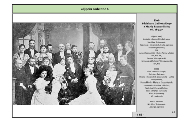 Zdjęcia rodzinne 6 Ślub Zdzisława Jabłońskiego z Marią Szczawińską ok. 1894 r. stoją od lewej: Leokadia z Jabłońskich Zalewska, Stanisław Bojanowski, Kazimiera z Jabłońskich, I voto Jagielska, II voto Bojanowska; NN; Antoni Szczawiński - Ojciec Panny Młodej; NN, NN, NN, Teodor Wietrzykowski, Henryka z Jabłońskich Wietrzykowska, NN, NN siedzą: Józef Zalewski - ksiądz; Kazimierz Zalewski; Helena z Jabłońskich Szczawińska - Matka Panny Młodej, Panna Młoda - Maria ze Szczawińskich: Pan Młody - Zdzisław Jabłoński; Waleria z Ryków Jabłońska; Józef Jabłoński z wnuczką Rózią Bojanowską; NN – zakonnik siedzą na ziemi: NN; Józef Bojanowski, Jadwiga Jagielska p. 3 - 145 -