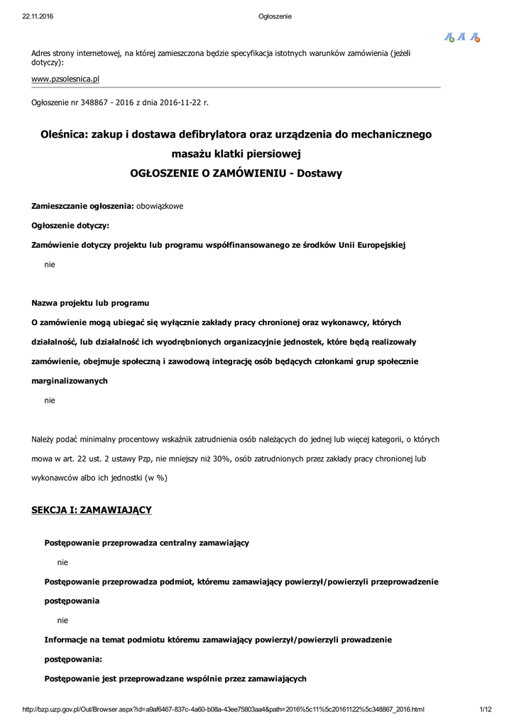 22.11.2016 Ogłoszenie Adres strony internetowej, na której zamieszczona będzie specyfikacja istotnych warunków zamówienia (jeżeli dotyczy): www.pzsolesnica.pl Ogłoszenie nr 348867 2016 z dnia 20161122 r. Oleśnica: zakup i dostawa defibrylatora oraz urządzenia do mechanicznego masażu klatki piersiowej OGŁOSZENIE O ZAMÓWIENIU Dostawy Zamieszczanie ogłoszenia: obowiązkowe Ogłoszenie dotyczy: Zamówienie dotyczy projektu lub programu współfinansowanego ze środków Unii Europejskiej nie Nazwa projektu lub programu O zamówienie mogą ubiegać się wyłącznie zakłady pracy chronionej oraz wykonawcy, których działalność, lub działalność ich wyodrębnionych organizacyjnie jednostek, które będą realizowały zamówienie, obejmuje społeczną i zawodową integrację osób będących członkami grup społecznie marginalizowanych nie Należy podać minimalny procentowy wskaźnik zatrudnienia osób należących do jednej lub więcej kategorii, o których mowa w art. 22 ust. 2 ustawy Pzp, nie mniejszy niż 30%, osób zatrudnionych przez zakłady pracy chronionej lub wykonawców albo ich jednostki (w %) SEKCJA I: ZAMAWIAJĄCY Postępowanie przeprowadza centralny zamawiający nie Postępowanie przeprowadza podmiot, któremu zamawiający powierzył/powierzyli przeprowadzenie postępowania nie Informacje na temat podmiotu któremu zamawiający powierzył/powierzyli prowadzenie postępowania: Postępowanie jest przeprowadzane wspólnie przez zamawiających http://bzp.uzp.gov.pl/Out/Browser.aspx?id=a9af6467837c4a60b08a43ee75803aa4&path=2016%5c11%5c20161122%5c348867_2016.html 1/12 22.11.2016 Ogłoszenie nie Jeżeli tak, należy wymienić zamawiających, którzy wspólnie przeprowadzają postępowanie oraz podać adresy ich siedzib, krajowe numery identyfikacyjne oraz osoby do kontaktów wraz z danymi do kontaktów: Postępowanie jest przeprowadzane wspólnie z zamawiającymi z innych państw członkowskich Unii Europejskiej nie W przypadku przeprowadzania postępowania wspólnie z zamawiającymi z innych państw członkowskich Unii Europejskiej – mające zastosowanie krajowe prawo zamówień publicznych: Informacje dodatkowe: I. 1) NAZWA I ADRES: Powiatowy Zespół Szpitali w Oleśnicy, krajowy numer identyfikacyjny 93296654000000, ul. ul. Armii Krajowej 1, 56400 Oleśnica, woj. dolnośląskie, państwo Polska, tel. 71 77 67 427, email , faks 71 77 67 307. Adres strony internetowej (URL): www.pzsolesnica.pl I. 2) RODZAJ ZAMAWIAJĄCEGO: Inny: SPZOZ I.3) WSPÓLNE UDZIELANIE ZAMÓWIENIA (jeżeli dotyczy): Podział obowiązków między zamawiającymi w przypadku wspólnego przeprowadzania postępowania, w tym w przypadku wspólnego przeprowadzania postępowania z zamawiającymi z innych państw członkowskich Unii Europejskiej (który z zamawiających jest odpowiedzialny za przeprowadzenie postępowania, czy i w jakim zakresie za przeprowadzenie postępowania odpowiadają pozostali zamawiający, czy zamówienie będzie udzielane przez każdego z zamawiających indywidualnie, czy zamówienie zostanie udzielone w imieniu i na rzecz pozostałych zamawiających): I.4) KOMUNIKACJA: Nieograniczony, pełny i bezpośredni dostęp do dokumentów z postępowania można uzyskać pod adresem (URL) tak www.pzsolesnica.pl Adres strony internetowej, na której zamieszczona będzie specyfikacja istotnych warunków zamówienia tak www.pzsolesnica.pl http://bzp.uzp.gov.pl/Out/Browser.aspx?id=a9af6467837c4a60b08a43ee75803aa4&path=2016%5c11%5c20161122%5c348867_2016.html 2/12 22.11.2016 Ogłoszenie Dostęp do dokumentów z postępowania jest ograniczony więcej informacji można uzyskać pod adresem nie Oferty lub wnioski o dopuszczenie do udziału w postępowaniu należy przesyłać: Elektronicznie nie adres Dopuszczone jest przesłanie ofert lub wniosków o dopuszczenie do udziału w postępowaniu w inny sposób: nie Wymagane jest przesłanie ofert lub wniosków o dopuszczenie do udziału w postępowaniu w inny sposób: tak Inny sposób: oferty nalezy składać w formie pisemnej Adres: Powiatowy Zespół Szpitali ul. Armii Krajowej 1, 56400 Oleśnica ( IV piętro administracja) Komunikacja elektroniczna wymaga korzystania z narzędzi i urządzeń lub formatów plików, które nie są ogólnie dostępne nie Nieograniczony, pełny, bezpośredni i bezpłatny dostęp do tych narzędzi można uzyskać pod adresem: (URL) SEKCJA II: PRZEDMIOT ZAMÓWIENIA II.1) Nazwa nadana zamówieniu przez zamawiającego: zakup i dostawa defibrylatora oraz urządzenia do mechanicznego masażu klatki piersiowej Numer referencyjny: PZS/PN/17/2016 Przed wszczęciem postępowania o udzielenie zamówienia przeprowadzono dialog techniczny nie http://bzp.uzp.gov.pl/Out/Browser.aspx?id=a9af6467837c4a60b08a43ee75803aa4&path=2016%5c11%5c20161122%5c348867_2016.html 3/12 22.11.2016 Ogłoszenie II.2) Rodzaj zamówienia: dostawy II.3) Informacja o możliwości składania ofert częściowych Zamówienie podzielone jest na części: Tak Oferty lub wnioski o dopuszczenie do udziału w postępowaniu można składać w odniesieniu do: wszystkich części II.4) Krótki opis przedmiotu zamówienia (wielkość, zakres, rodzaj i ilość dostaw, usług lub robót budowlanych lub określenie zapotrzebowania i wymagań ) a w przypadku partnerstwa innowacyjnego określenie zapotrzebowania na innowacyjny produkt, usługę lub roboty budowlane: Przedmiotem zamówienia jest zakup i dostawa: zad. 1) przenośnego defibrylatora wraz z torbą oraz zad.2) Urządzenie do kompresji klatki piersiowej charakterystyka produktów znajduje się w załączniku nr 5 do SIWZ II.5) Główny kod CPV: 331821000 Dodatkowe kody CPV:331822001 II.6) Całkowita wartość zamówienia (jeżeli zamawiający podaje informacje o wartości zamówienia): Wartość bez VAT: Waluta: (w przypadku umów ramowych lub dynamicznego systemu zakupów – szacunkowa całkowita maksymalna wartość w całym okresie obowiązywania umowy ramowej lub dynamicznego systemu zakupów) II.7) Czy prze