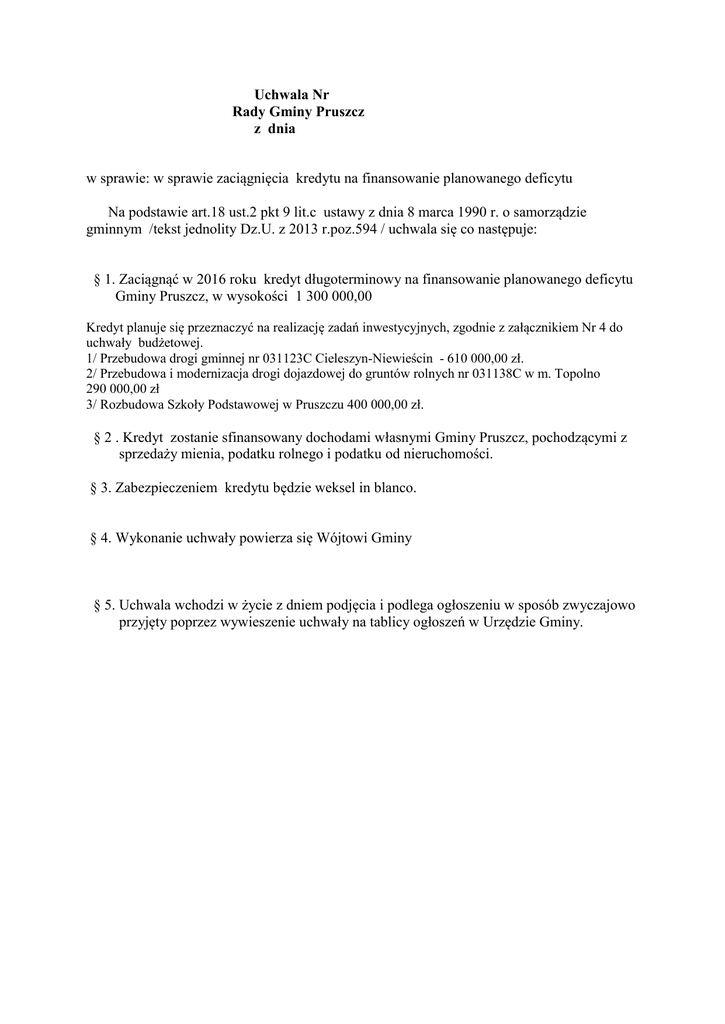 Uchwala Nr Rady Gminy Pruszcz z dnia w sprawie: w sprawie zaciągnięcia kredytu na finansowanie planowanego deficytu Na podstawie art.18 ust.2 pkt 9 lit.c ustawy z dnia 8 marca 1990 r. o samorządzie gminnym /tekst jednolity Dz.U. z 2013 r.poz.594 / uchwala się co następuje: § 1. Zaciągnąć w 2016 roku kredyt długoterminowy na finansowanie planowanego deficytu Gminy Pruszcz, w wysokości 1 300 000,00 Kredyt planuje się przeznaczyć na realizację zadań inwestycyjnych, zgodnie z załącznikiem Nr 4 do uchwały budżetowej. 1/ Przebudowa drogi gminnej nr 031123C Cieleszyn-Niewieścin - 610 000,00 zł. 2/ Przebudowa i modernizacja drogi dojazdowej do gruntów rolnych nr 031138C w m. Topolno 290 000,00 zł 3/ Rozbudowa Szkoły Podstawowej w Pruszczu 400 000,00 zł. § 2 . Kredyt zostanie sfinansowany dochodami własnymi Gminy Pruszcz, pochodzącymi z sprzedaży mienia, podatku rolnego i podatku od nieruchomości. § 3. Zabezpieczeniem kredytu będzie weksel in blanco. § 4. Wykonanie uchwały powierza się Wójtowi Gminy § 5. Uchwala wchodzi w życie z dniem podjęcia i podlega ogłoszeniu w sposób zwyczajowo przyjęty poprzez wywieszenie uchwały na tablicy ogłoszeń w Urzędzie Gminy. Uzasadnienie: Planowany deficyt w wysokości 1 300 000,00 dotyczy wydatków inwestycyjnych. Gmina na 2016 r. planuje wydatki inwestycyjne w łącznej wysokości 5 905 886,31. .Żródła finansowania inwestycji: - środki z Unii Europejskiej 1 938 225,49 - dotacja celowa z budżetu innej j.s.t. 533 086,01 - kredyt 1 300 000,00 - dochody własne 2 134 574,81 Kredyt w wysokości 1 300 000,00 planuje się wykorzystać na poniższe zadania: Koszt Środki Dotacja z Kredyt budżet Nazwa zadania w roku unijne budżetu 2016 innej j.s.t 1/ Przebudowa drogi gminnej nr 031123C CieleszynNiewieścin - 695 000,00 0,00 0,00 610 000,00 85 000,00 2/ Przebudowa i modernizacja drogi dojazdowej do gruntów rolnych nr 031138C w m. Topolno 523 756,13 0,00 131 250,00 290 000,00 102 506,13 5/ Rozbudowa Szkoły Podstawowej w Pruszczu 662 000,00 0,00 0,00 400 000,00 262 000,00 Jak z powyższego wynika tylko część inwestycji będzie realizowana z kredytu . W związku z powyższym wnioskuje się o kredyt na inwestycje wymienione w uchwale, § 1 pkt 1-3 .