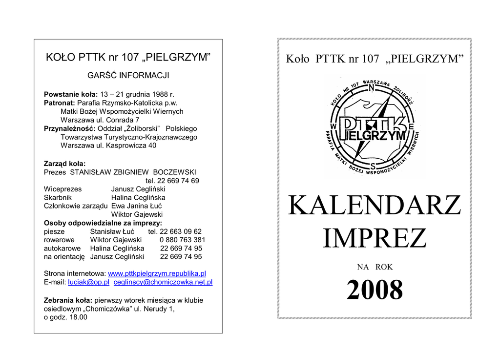 KOŁO PTTK nr 107 „PIELGRZYM” Koło PTTK nr 107 „PIELGRZYM” GARŚĆ INFORMACJI Powstanie koła: 13 – 21 grudnia 1988 r. Patronat: Parafia Rzymsko-Katolicka p.w. Matki Bożej Wspomożycielki Wiernych Warszawa ul. Conrada 7 Przynależność: Oddział „Żoliborski” Polskiego Towarzystwa Turystyczno-Krajoznawczego Warszawa ul. Kasprowicza 40 Zarząd koła: Prezes STANISŁAW ZBIGNIEW BOCZEWSKI tel. 22 669 74 69 Wiceprezes Janusz Cegliński Skarbnik Halina Ceglińska Członkowie zarządu Ewa Janina Łuć Wiktor Gajewski Osoby odpowiedzialne za imprezy: piesze Stanisław Łuć tel. 22 663 09 62 rowerowe Wiktor Gajewski 0 880 763 381 autokarowe Halina Ceglińska 22 669 74 95 na orientację Janusz Cegliński 22 669 74 95 Strona internetowa: www.pttkpielgrzym.republika.pl E-mail: [email protected] [email protected] Zebrania koła: pierwszy wtorek miesiąca w klubie osiedlowym „Chomiczówka” ul. Nerudy 1, o godz. 18.00 KALENDARZ IMPREZ NA ROK 2008 1. 06.01.08 Towarzyska Piesza 2. 28.01.08 Piesza 3. 02.02.08 Slajdowisko 4. 23.02.08 Piesza 5. 03.08 Slajdowisko 6. 30.03.08 Autokarowa 7. 05.04.08 Rowerowa 8. 13.04.08 Krajoznawcza 9. 19.04.08 Piesza 10. 01-04. Autokarowa 05.08 11. 22.05.08 Piesza 12. 14.06.08 Piesza 13. 13.07.08 Rowerowa 14. II połowa Kajakowa lipca.08 15. 07.09.08 Krajoznawcza 16. 27-28. Autokarowa 09.08 17. 12.10.08 Krajoznawcza Opłatek w Laskach Śladami Powstania Styczniowego (po raz dwudziesty) Z dalekich stron Mazowiecki Park Krajobrazowy Maroko Dworki i pałace Mazowsza (po raz ósmy) Chomiczówka – Lipków – Mariew – Truskaw – Chomiczówka Spacer po Żoliborzu i Bielanach (40-lecie Oddziału „Żoliborskiego” PTTK) – etap I Piechtą po Puszczy (część I) Ziemia Świętokrzyska Secymin – Boże Ciało w sanktuarium MB Radosnej Opiekunki Przyrody Piechtą po Puszczy (część II) Brzegiem Wisły: Chomiczówka – Józefów – Chomiczówka Wakacyjny spływ kajakowy Spacer po Żoliborzu i Bielanach (40-lecie Oddziału „Żoliborskiego” PTTK) – etap II Miasto Łódź Spacer po Żoliborzu i Bielanach (40-lecie Oddziału „Żoliborskiego” PTTK) – etap III 18. 18.10.08 Piesza Rowerowa 19. 01.11.08 Piesza 20. 09.11.08 Krajoznawcza 21. 15.11.08 Piesza 22. 16.11.08 Krajoznawcza 23. 30.11.08 Piesza 24. 07.12.08 Krajoznawcza Centralny Zlot Młodzieży „PALMIRY” 2008 Nocne przejście Kampinosu Cmentarze Warszawy Piechtą po Puszczy (część III) Muzea Warszawy – Muzeum Wojska Polskiego Zimowa Puszcza Spacer po Żoliborzu i Bielanach (40-lecie Oddziału „Żoliborskiego” PTTK i 20-lecie naszego koła) – etap IV UWAGA! Z różnych przyczyn niektóre z imprez mogą się odbyć w innym terminie niż podany. Wszelkie zmiany oraz dokładne informacje dotyczące konkretnej imprezy będą umieszczane na tablicy naszego Koła (tablica znajduje się przy wejściu na teren kościoła M.B.W.W. ul. Conrada 7) oraz na naszej stronie internetowej pod adresem www.pttkpielgrzym.republika.pl jak też pod podanymi numerami telefonów. W 2008 roku Oddział Żoliborski obchodzi 40-lecie swojego istnienia, dlatego też Koło nasze włącza się w obchody tego jubileuszu – w kalendarzu są zaznaczone imprezy związane z tą rocznicą. Rok 2008 jest również jubileuszowy dla naszego koła; w grudniu będziemy świętowali XX-lecie! Pierwszą imprezą związaną z tym faktem jest spacer 27.01.2008 – śladami powstania styczniowego, który odbędzie się już po raz dwudziesty.