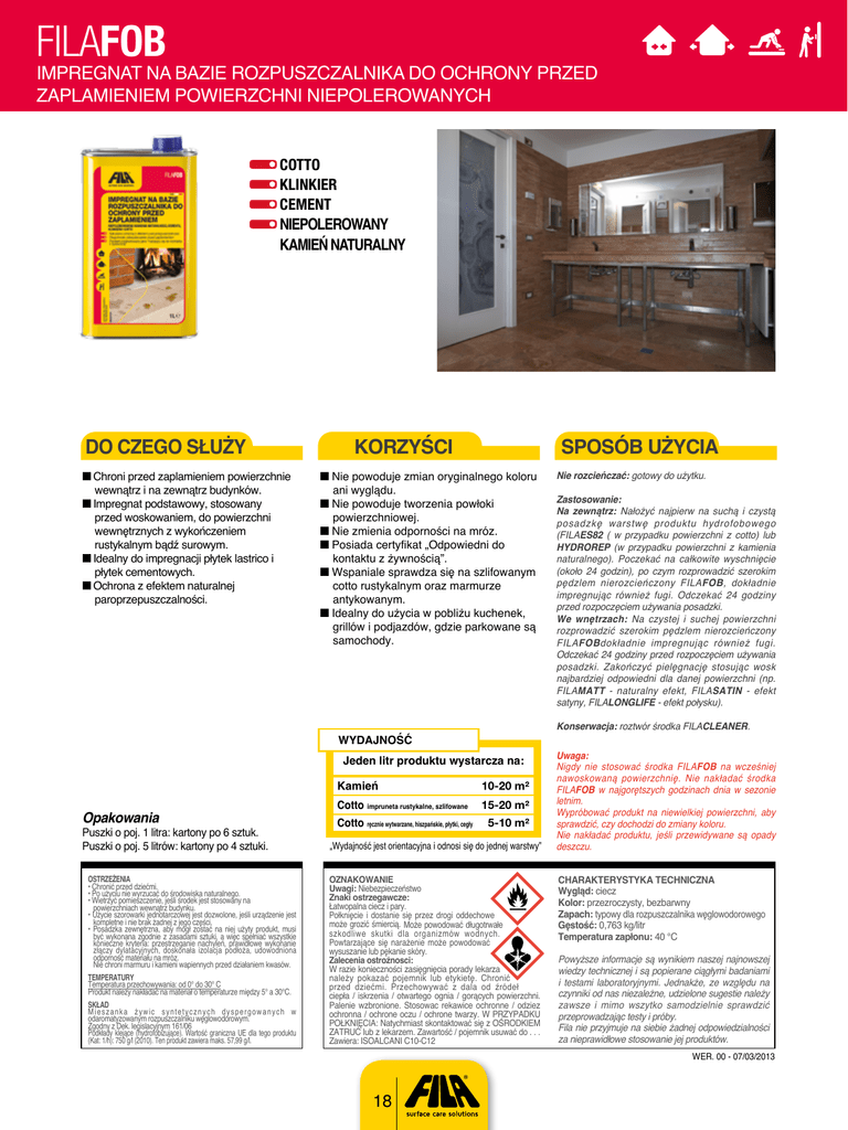 FILAFOB IMPREGNAT NA BAZIE ROZPUSZCZALNIKA DO OCHRONY PRZED ZAPLAMIENIEM POWIERZCHNI NIEPOLEROWANYCH COTTO KLINKIER CEMENT NIEPOLEROWANY KAMIEŃ NATURALNY DO CZEGO SŁUŻY Chroni przed zaplamieniem powierzchnie wewnątrz i na zewnątrz budynków. Impregnat podstawowy, stosowany przed woskowaniem, do powierzchni wewnętrznych z wykończeniem rustykalnym bądź surowym. Idealny do impregnacji płytek lastrico i płytek cementowych. Ochrona z efektem naturalnej paroprzepuszczalności. KORZYŚCI SPOSÓB UŻYCIA Nie powoduje zmian oryginalnego koloru ani wyglądu. Nie powoduje tworzenia powłoki powierzchniowej. Nie zmienia odporności na mróz. Posiada certyfikat „Odpowiedni do kontaktu z żywnością”. Wspaniale sprawdza się na szlifowanym cotto rustykalnym oraz marmurze antykowanym. Idealny do użycia w pobliżu kuchenek, grillów i podjazdów, gdzie parkowane są samochody. Jeden litr produktu wystarcza na: Puszki o poj. 1 litra: kartony po 6 sztuk. Puszki o poj. 5 litrów: kartony po 4 sztuki. OSTRZEŻENIA • Chronić przed dziećmi. • Po użyciu nie wyrzucać do środowiska naturalnego. • Wietrzyć pomieszczenie, jeśli środek jest stosowany na powierzchniach wewnątrz budynku. • Użycie szorowarki jednotarczowej jest dozwolone, jeśli urządzenie jest kompletne i nie brak żadnej z jego części. • Posadzka zewnętrzna, aby mógł zostać na niej użyty produkt, musi być wykonana zgodnie z zasadami sztuki, a więc spełniać wszystkie konieczne kryteria: przestrzeganie nachyleń, prawidłowe wykonanie złączy dylatacyjnych, doskonała izolacja podłoża, udowodniona odporność materiału na mróz. Nie chroni marmuru i kamieni wapiennych przed działaniem kwasów. TEMPERATURY Temperatura przechowywania: od 0° do 30° C Produkt należy nakładać na materiał o temperaturze między 5° a 30°C. SKŁAD M ieszanka żyw ic syntet ycznych dyspergowanych w odaromatyzowanym rozpuszczalniku węglowodorowym. Zgodny z Dek. legislacyjnym 161/06 Podkłady klejące (hydrofobizujące). Wartość graniczna UE dla tego produktu (Kat: 1/h): 750 g/l (2010). Ten produkt zawiera maks. 57,99 g/l. Kamień 10-20 m² Cotto impruneta rustykalne, szlifowane 15-20 m² Cotto ręcznie wytwarzane, hiszpańskie, płytki, cegły Zastosowanie: Na zewnątrz: Nałożyć najpierw na suchą i czystą posadzkę warstwę produktu hydrofobowego (FILAES82 ( w przypadku powierzchni z cotto) lub HYDROREP (w przypadku powierzchni z kamienia naturalnego). Poczekać na całkowite wyschnięcie (około 24 godzin), po czym rozprowadzić szerokim pędzlem nierozcieńczony FILAFOB, dokładnie impregnując również fugi. Odczekać 24 godziny przed rozpoczęciem używania posadzki. We wnętrzach: Na czystej i suchej powierzchni rozprowadzić szerokim pędzlem nierozcieńczony FILAFOBdokładnie impregnując również fugi. Odczekać 24 godziny przed rozpoczęciem używania posadzki. Zakończyć pielęgnację stosując wosk najbardziej odpowiedni dla danej powierzchni (np. FILAMATT - naturalny efekt, FILASATIN - efekt satyny, FILALONGLIFE - efekt połysku). Konserwacja: roztwór środka FILACLEANER. WYDAJNOŚĆ Opakowania Nie rozcieńczać: gotowy do użytku. 5-10 m² „Wydajność jest orientacyjna i odnosi się do jednej warstwy” OZNAKOWANIE Uwagi: Niebezpieczeństwo Znaki ostrzegawcze: Łatwopalna ciecz i pary. Połknięcie i dostanie się przez drogi oddechowe może grozić śmiercią. Może powodować długotrwałe szkodliwe skutki dla organizmów wodnych. Powtarzające się narażenie może powodować wysuszanie lub pękanie skóry. Zalecenia ostrożnosci: W razie konieczności zasięgnięcia porady lekarza należy pokazać pojemnik lub etykietę. Chronić przed dziećmi. Przechowywać z dala od źródeł ciepła / iskrzenia / otwartego ognia / gorących powierzchni. Palenie wzbronione. Stosowac rekawice ochronne / odziez ochronna / ochrone oczu / ochrone twarzy. W PRZYPADKU POŁKNIĘCIA: Natychmiast skontaktować się z OŚRODKIEM ZATRUĆ lub z lekarzem. Zawartość / pojemnik usuwać do . . . Zawiera: ISOALCANI C10-C12 Uwaga: Nigdy nie stosować środka FILAFOB na wcześniej nawoskowaną powierzchnię. Nie nakładać środka FILAFOB w najgorętszych godzinach dnia w sezonie letnim. Wypróbować produkt na niewielkiej powierzchni, aby sprawdzić, czy dochodzi do zmiany koloru. Nie nakładać produktu, jeśli przewidywane są opady deszczu. CHARAKTERYSTYKA TECHNICZNA Wygląd: ciecz Kolor: przezroczysty, bezbarwny Zapach: typowy dla rozpuszczalnika węglowodorowego Gęstość: 0,763 kg/litr Temperatura zapłonu: 40 °C Powyższe informacje są wynikiem naszej najnowszej wiedzy technicznej i są popierane ciągłymi badaniami i testami laboratoryjnymi. Jednakże, ze względu na czynniki od nas niezależne, udzielone sugestie należy zawsze i mimo wszytko samodzielnie sprawdzić przeprowadzając testy i próby. Fila nie przyjmuje na siebie żadnej odpowiedzialności za nieprawidłowe stosowanie jej produktów. WER. 00 - 07/03/2013 18