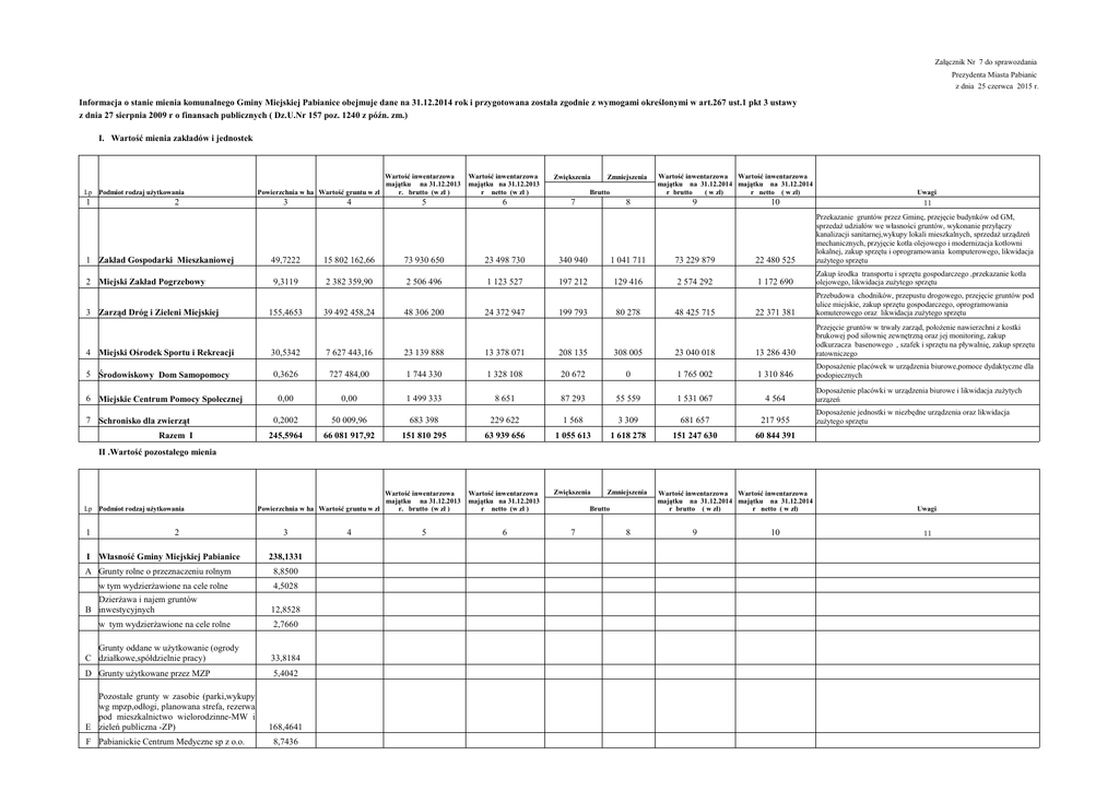 Załącznik Nr 7 do sprawozdania Prezydenta Miasta Pabianic z dnia 25 czerwca 2015 r. Informacja o stanie mienia komunalnego Gminy Miejskiej Pabianice obejmuje dane na 31.12.2014 rok i przygotowana została zgodnie z wymogami określonymi w art.267 ust.1 pkt 3 ustawy z dnia 27 sierpnia 2009 r o finansach publicznych ( Dz.U.Nr 157 poz. 1240 z późn. zm.) I. Wartość mienia zakładów i jednostek Lp Podmiot rodzaj użytkowania 1 2 Powierzchnia w ha Wartość gruntu w zł 3 4 Wartość inwentarzowa majątku na 31.12.2013 r. brutto (w zł ) Wartość inwentarzowa majątku na 31.12.2013 r netto (w zł ) Zwiększenia 5 6 7 Zmniejszenia Brutto 8 Wartość inwentarzowa Wartość inwentarzowa majątku na 31.12.2014 majątku na 31.12.2014 r brutto ( w zł) r netto ( w zł) 9 10 Uwagi 11 1 Zakład Gospodarki Mieszkaniowej 49,7222 15 802 162,66 73 930 650 23 498 730 340 940 1 041 711 73 229 879 22 480 525 Przekazanie gruntów przez Gminę, przejęcie budynków od GM, sprzedaż udziałów we własności gruntów, wykonanie przyłączy kanalizacji sanitarnej,wykupy lokali mieszkalnych, sprzedaż urządzeń mechanicznych, przyjęcie kotła olejowego i modernizacja kotłowni lokalnej, zakup sprzętu i oprogramowania komputerowego, likwidacja zużytego sprzętu 2 Miejski Zakład Pogrzebowy 9,3119 2 382 359,90 2 506 496 1 123 527 197 212 129 416 2 574 292 1 172 690 Zakup środka transportu i sprzętu gospodarczego ,przekazanie kotła olejowego, likwidacja zużytego sprzętu 155,4653 39 492 458,24 48 306 200 24 372 947 199 793 80 278 48 425 715 22 371 381 Przebudowa chodników, przepustu drogowego, przejęcie gruntów pod ulice miejskie, zakup sprzętu gospodarczego, oprogramowania komuterowego oraz likwidacja zużytego sprzętu 3 Zarząd Dróg i Zieleni Miejskiej 4 Miejski Ośrodek Sportu i Rekreacji 30,5342 7 627 443,16 23 139 888 13 378 071 208 135 308 005 23 040 018 13 286 430 Przejęcie gruntów w trwały zarząd, położenie nawierzchni z kostki brukowej pod siłownię zewnętrzną oraz jej monitoring, zakup odkurzacza basenowego , szafek i sprzętu na pływalnię, zakup sprzętu ratowniczego 5 Środowiskowy Dom Samopomocy 0,3626 727 484,00 1 744 330 1 328 108 20 672 0 1 765 002 1 310 846 Doposażenie placówek w urządzenia biurowe,pomoce dydaktyczne dla podopiecznych 0,00 0,00 1 499 333 8 651 87 293 55 559 1 531 067 4 564 0,2002 50 009,96 683 398 229 622 1 568 3 309 681 657 217 955 245,5964 66 081 917,92 151 810 295 63 939 656 1 055 613 1 618 278 151 247 630 60 844 391 Wartość inwentarzowa majątku na 31.12.2013 r. brutto (w zł ) Wartość inwentarzowa majątku na 31.12.2013 r netto (w zł ) Zwiększenia Zmniejszenia 5 6 7 6 Miejskie Centrum Pomocy Społecznej 7 Schronisko dla zwierząt Razem I Doposażenie placówki w urządzenia biurowe i likwidacja zużytych urzązeń Doposażenie jednostki w niezbędne urządzenia oraz likwidacja zużytego sprzętu II .Wartość pozostałego mienia Lp Podmiot rodzaj użytkowania 1 2 I Własność Gminy Miejskiej Pabianice Powierzchnia w ha Wartość gruntu w zł 3 238,1331 A Grunty rolne o przeznaczeniu rolnym 8,8500 w tym wydzierżawione na cele rolne Dzierżawa i najem gruntów B inwestycyjnych 4,5028 12,8528 w tym wydzierżawione na cele rolne 2,7660 Grunty oddane w użytkowanie (ogrody C działkowe,spółdzielnie pracy) 33,8184 D Grunty użytkowane przez MZP 5,4042 Pozostałe grunty w zasobie (parki,wykupy wg mpzp,odłogi, planowana strefa, rezerwa pod mieszkalnictwo wielorodzinne-MW i E zieleń publiczna -ZP) F Pabianickie Centrum Medyczne sp z o.o. 168,4641 8,7436 4 Brutto 8 Wartość inwentarzowa Wartość inwentarzowa majątku na 31.12.2014 majątku na 31.12.2014 r brutto ( w zł) r netto ( w zł) 9 10 Uwagi 11 II Zasoby poza terenem Pabianic 9,6713 A Gmina Dobroń-Dobroń Poduchowny 6,1942 B Gmina Pabianice -Szynkielew 1,6594 C Gmina Pabianice -Piątkowisko Gmina Pabianice D Hermanów,Bychlew,Jadwinin 0,2967 E Gmina Łódź -Łaskowice 1,3638 0,1572 Grunty stanowiące własność Gminy Miejskiej Pabianice ,oddane w III użytkowanie wieczyste w tym: 175,5334 Mieszkalnictwo,handel,usługi A ,rzemiosło,garaże ,przemysł 150,2134 B Ogrody działkowe 25,3200 Łącznie grunty Wydziału Gospodarki Nieruchomościami 1 Infrastruktura społeczna 423,3378 105 319 459,81 18,9668 13 411 839,52 35 880 484 12 467 835 1 352 272 368 154 36 864 602 12 180 894 A Przedszkola 5,0596 5 385 480,92 7 796 001 2 793 802 244 728 49 663 7 991 066 2 599 744 Doposażenie placówek w pomoce dydaktyczne, uzupełnienie podstawowego wyposażenia placówek, zakup sprzęt rehabilitacyjny, zakup maszyn ogrodniczych, sprzętu AGD zakup programy komputerowe oraz ikwidacja zużytego sprzętu B Szkoły 12,6717 7 717 730,70 18 816 063 4 919 779 594 222 262 899 19 147 386 4 728 330 Zakup sprzętu biurowego, pomocy dydaktycznych, drobnego sprzętu AGD,doposażęnie świetlic szkolnych i sal gimnastycznych , likwidacja księgozbiorów bibliotecznych, zużytego sprzętu C Żłobek 0,9353 233 637,94 1 239 827 574 291 92 673 0 1 332 500 552 170 Zakup wyposażenia placówki w sprzęt kuchenny, AGD.Wyposażenie sal dziecięcych, załóżenie monitoringu oraz systemu alarmowego 4 300 650 Zakup sprzętu i oprogramowania komputerowego, iurządzeń technicznych, księgozbiorów, powiększenie zbiorów muzealnych pochodzących z darów ,doposażenie instytucji w urządzenia biurowe, likwidacja zużytego sprzętu komputerowego 43 554 483 Zakup, sprzedaż i przekazanie budynków, zakup wiat przystankowych, budowa GPZOK, wymiana przyłącza ciepłowniczego, zakup sprzętu komputerowego, zakup mebli biurowych sprzętu i wyposażenia, zakup licencji oprogramowania likwidacja obiektów wolnostojących na.nieruchomościach, likwidacja wyposażenia i sprzętu komputerowego D Biblioteka,MOK, Muzeum 0,3002 74 989,96 2 Urząd Miejski w Pabianicach 3 Łaskowice -składowisko odpadów 81 164 893 10,3798 2 592 874,04 Razem II 452,6844 121 324 173,37 RAZEM I + II 698,2808 Stan na 31.12.2013 r 187 406 091,29 Stan n
