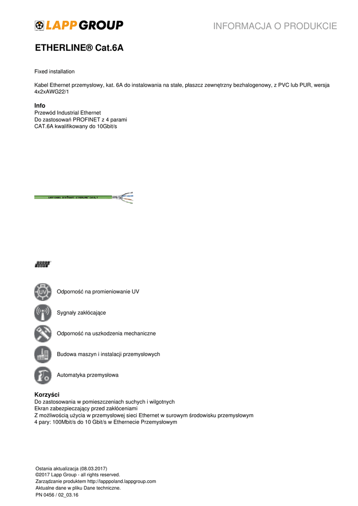 INFORMACJA O PRODUKCIE ETHERLINE® Cat.6A Fixed installation Kabel Ethernet przemysłowy, kat. 6A do instalowania na stałe, płaszcz zewnętrzny bezhalogenowy, z PVC lub PUR, wersja 4x2xAWG22/1 Info Przewód Industrial Ethernet Do zastosowań PROFINET z 4 parami CAT.6A kwalifikowany do 10Gbit/s Odporność na promieniowanie UV Sygnały zakłócające Odporność na uszkodzenia mechaniczne Budowa maszyn i instalacji przemysłowych Automatyka przemysłowa Korzyści Do zastosowania w pomieszczeniach suchych i wilgotnych Ekran zabezpieczający przed zakłóceniami Z możliwością użycia w przemysłowej sieci Ethernet w surowym środowisku przemysłowym 4 pary: 100Mbit/s do 10 Gbit/s w Ethernecie Przemysłowym Ostania aktualizacja (08.03.2017) ©2017 Lapp Group - all rights reserved. Zarządzanie produktem http://lapppoland.lappgroup.com Aktualne dane w pliku Dane techniczne. PN 0456 / 02_03.16 INFORMACJA O PRODUKCIE ETHERLINE® Cat.6A Zakres zastosowania Okablowanie przemysłowe poziomu drugiego i trzeciego zgodnie z EN 50173-3 ISO/IEC 24702 Okablowanie maszyn, narzędzi, urządzeń, przyrządów i szaf sterowniczych Maksymalna długość przewodu dla 100 Mbit/s to 100 m Maksymalna długość przewodu dla 10 Gbit/s to 100 m Odpowiedni do sieci w standardach EtherCAT i EtherNet/IP Cechy produktu Płaszcz zewnetrzny z PUR jest w wysokim stopniu odporny na ścieranie i działanie olejów mineralnych Płaszcz zewnętrzny bezhalogenowy, wytrzymały Olejoodporna izolacja z PVC umożliwia zastosowanie w szczególności w obszarach przemysłowych Wysokiej jakości ekranowanie podwójne zapewnia dużą niezawodność transmisji w obszarach z zakłóceniami elektromagnetycznymi Budowa produktu Żyła jednodrutowa z czystej miedzi AWG22 Izolacja żyły wykonana z polietylenu (PE) S/FTP: miedziany oplot do ekranowania ogólnego i aluminiowa folia kompozytowa do ekranowania par przewodów Kolor: zielony (podobny do RAL 6018) Dane techniczne Klasyfikacja: ETIM 5.0 Class-ID: EC000830 Opis klasy ETIM 5.0: Przewody do transmisji danych Szczytowe napięcie robocze: (nie do zastosowań silnoprądowych) 125 V Minimalny promień gięcia: Połączenie nieruchome: 10 x średnica zewnętrzna Impedancja falowa: 100 Om przy 1–100 MHz Zakres temperatury: Płaszcz PUR Połączenia nieruchome: VDE od -30°C do +80°C; UL/CSA od -30°C do +80°C Połączenia ruchome: VDE od -5°C do +50°C; UL/CSA od -5°C do +80°C Wersja bezhalogenowa Połączenia nieruchome: -25°C to +80°C Wersja PVC Połączenia nieruchome: -40°C to +80°C Wskazówka Standardowe odcinki proszę sprawdzić na: www.lapppolska.pl Rodzaj opakowania: krążek ≤ 30 kg lub ≤ 250 m, w przeciwnym razie bęben Prosimy określić wielkość opakowania (np. 1 x 500 m bęben lub 5 x 100 m krążek) PRINET® jest zastrzeżoną marką the PNO (organizacja użytkowników PROFIBUS) Fotografie nie mogą być używane do wymiarowania oraz nie stanowią szczegółowego odwzorowania przedstawionych produktów. * Podane ceny to ceny netto bez podatku VAT i dodatkowych opłat. Sprzedaż klientom biznesowym. Ostania aktualizacja (08.03.2017) ©2017 Lapp Group - all rights reserved. Zarządzanie produktem http://lapppoland.lappgroup.com Aktualne dane w pliku Dane techniczne. PN 0456 / 02_03.16 Powered by TCPDF (www.tcpdf.org) Oznaczenie wyrobu Liczba par i rozmiar AWG żyły Maksymalna średnica zewnętrzna [mm] Indeks miedzi [kg/km] Waga [kg/km] ETHERLINE® Cat.6A H 4 x 2 x AWG22/1 9 53 99 ETHERLINE® CAT.6A P 4 x 2 x AWG22/1 9 53 91 ETHERLINE® Cat.6A Y 4 x 2 x AWG22/1 9 53 98 Płaszcz bezhalogenowy 2170466 Płaszcz zewnętrzny z PUR, bezhalogenowy 2170465 Płaszcz zewnętrzny PVC 2170464 ETHERLINE® Cat.6A Ostania aktualizacja (08.03.2017) ©2017 Lapp Group - all rights reserved. Zarządzanie produktem http://lapppoland.lappgroup.com Aktualne dane w pliku Dane techniczne. PN 0456 / 02_03.16 INFORMACJA O PRODUKCIE Powered by TCPDF (www.tcpdf.org) Numer katalogowy