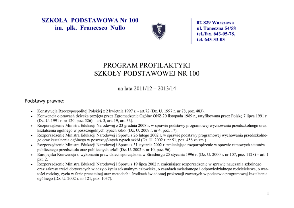 SZKOŁA PODSTAWOWA Nr 100 im. płk. Francesco Nullo 02-829 Warszawa ul. Taneczna 54/58 tel./fax. 643-05-78, tel. 643-33-03 PROGRAM PROFILAKTYKI SZKOŁY PODSTAWOWEJ NR 100 na lata 2011/12 – 2013/14 Podstawy prawne: • • • • • • • Konstytucja Rzeczypospolitej Polskiej z 2 kwietnia 1997 r. - art.72 (Dz. U. 1997 r. nr 78, poz. 483). Konwencja o prawach dziecka przyjęta przez Zgromadzenie Ogólne ONZ 20 listopada 1989 r., ratyfikowana przez Polskę 7 lipca 1991 r. (Dz. U. 1991 r. nr 120, poz. 526) – art. 3, art. 19, art. 33). Rozporządzenie Ministra Edukacji Narodowej z 23 grudnia 2008 r. w sprawie podstawy programowej wychowania przedszkolnego oraz kształcenia ogólnego w poszczególnych typach szkół (Dz. U. 2009 r. nr 4, poz. 17). Rozporządzenie Ministra Edukacji Narodowej i Sportu z 26 lutego 2002 r. w sprawie podstawy programowej wychowania przedszkolnego oraz kształcenia ogólnego w poszczególnych typach szkół (Dz. U. 2002 r. nr 51, poz. 458 ze zm.). Rozporządzenie Ministra Edukacji Narodowej i Sportu z 31 stycznia 2002 r. zmieniające rozporządzenie w sprawie ramowych statutów publicznego przedszkola oraz publicznych szkół (Dz. U. 2002 r. nr 10, poz. 96). Europejska Konwencja o wykonaniu praw dzieci sporządzona w Strasburgu 25 stycznia 1996 r. (Dz. U. 2000 r. nr 107, poz. 1128) – art. 1 pkt. 2. Rozporządzenie Ministra Edukacji Narodowej i Sportu z 19 lipca 2002 r. zmieniające rozporządzenie w sprawie nauczania szkolnego oraz zakresu treści dotyczących wiedzy o Ŝyciu seksualnym człowieka, o zasadach świadomego i odpowiedzialnego rodzicielstwa, o wartości rodziny, Ŝycia w fazie prenatalnej oraz metodach i środkach świadomej prokreacji zawartych w podstawie programowej kształcenia ogólnego (Dz. U. 2002 r. nr 121, poz. 1037). 1 • • • • • • • • • • Ustawa z 8 stycznia 1999 r. - Przepisy wprowadzające reformę ustroju szkolnego (Dz. U. 1999 r. nr 12, poz. 96 ze zm.). Ustawa z 19 stycznia 1994 r. o ochronie zdrowia psychicznego (Dz. U. 1994 r. nr 111, poz. 535 ze zm.). Ustawa z 26 października 1982 r. o wychowaniu w trzeźwości i przeciwdziałaniu alkoholizmowi (Dz. U. 1982 r. nr 35, poz. 230 ze zm.). Ustawa z 24 kwietnia 1997 r. o przeciwdziałaniu narkomanii (Dz. U. 2003 r. nr 24, poz. 198). Ustawa z 9 listopada 1995 r. o ochronie zdrowia przed następstwami uŜywania tytoniu i wyrobów tytoniowych (Dz. U. 1996 r. nr 10, poz. 55). Ustawa z 7 września 1991 r. o systemie oświaty (Dz. U. 2004 r. nr 256, poz. 2572 ze zm.). Rozporządzenie Ministra Zdrowia z 22 grudnia 2004 r. w sprawie zakresu i organizacji profilaktycznej opieki zdrowotnej nad dziećmi i młodzieŜą (Dz. U. 2004 r. nr 282, poz. 2814 ze zm.). Obwieszczenie Marszałka Sejmu Rzeczypospolitej Polskiej z 22 stycznia 2003 r. w sprawie ogłoszenia jednolitego tekstu ustawy o przeciwdziałaniu narkomanii (Dz. U. 2003 r. nr 24, poz. 198). Rozporządzenie Ministra Edukacji Narodowej i Sportu z 31 stycznia 2003 r. w sprawie szczegółowych form działalności wychowawczej i zapobiegawczej wśród dzieci i młodzieŜy zagroŜonych uzaleŜnieniem (Dz. U. 2003 r. nr 26, poz. 226). Obwieszczenie Ministra Zdrowia z 22 lipca 2002 r. w sprawie ogłoszenia jednolitego tekstu ustawy o wychowaniu w trzeźwości i przeciwdziałaniu alkoholizmowi (Dz. U. 2002 r. nr 147, poz. 1231 ze zm.). Program profilaktyki jest spójny z programem wychowawczym, który, obok prowadzonej diagnozy potrzeb wśród uczniów i rodziców , a takŜe uwzględnienia działań profilaktycznych prowadzonych przez władze lokalne m. st. Warszawy stał się materiałem wyjściowym do określenia zadań profilaktycznych realizowanych w naszej szkole. Profilaktykę rozumiemy jako systematyczne działania wspierające zdrowie psychiczne i fizyczne ucznia i jego rodziny poprzez dostarczenie wiedzy o zagroŜeniach dla tego zdrowia oraz nabywania umiejętności przeciwdziałania tym zagroŜeniom. Eliminowanie czynników ryzyka musi iść w parze z działaniami wzmacniającymi czynniki chroniące tj.: silna więź emocjonalna z rodzicami, zainteresowanie nauką, aktywne uczestniczenie w Ŝyciu szkoły, przywiązanie do wartości religijnych, poszanowanie norm prawnych i przyjętych w rodzinie i w szkole wartości moralnych, a takŜe poszanowanie autorytetów społecznych czy umiejętność wiązania się z pozytywną grupą rówieśniczą. Budując trzyletni program profilaktyki, oparto się na następujących wskaźnikach: 1) diagnoza rzeczywistych problemów występujących w społeczności lokalnej 2) ustawy i rozporządzenia będące podstawą prawną dla działań profilaktycznych 3) analiza programu wychowawczego szkoły pod kątem zadań, które stanowią wytyczne do działań profilaktycznych 2 Program profilaktyki SP 100 uwzględnia specyfikę rozwojową odbiorców, którymi są uczniowie w wieku od 6 do 12 lat i ich najbliŜsza rodzina. Planowane działania z jednej strony promują zdrowy styl Ŝycia, z drugiej – mają zapobiegać pojawianiu się problemów związanych z działaniami dysfunkcyjnymi. W oddziale przedszkolnym i w edukacji wczesnoszkolnej działania profilaktyczne obejmują: - promocję zdrowia, w tym prawidłowe Ŝywienie - upowszechnianie wiedzy o uzaleŜniających właściwościach leków i uŜywek, - przekazywanie praktycznych wskazówek, jak unikać potencjalnych zagroŜeń ze strony rówieśników, dorosłych, zwierząt, niebezpiecznych przedmiotów czy substancji, - informowanie dorosłych o wszystkim, co zagraŜa zdrowiu i bezpieczeństwu, - rozumienie faktu, Ŝe kaŜdy człowiek jest osobą wartościową, niepowtarzalną, - tworzenie więzi między rówieśnikami, szeroko rozumiana integracja – praca z uczniem nieśmiałym, włączanie nowych uczniów do zespołu klasowego, umiejętność rozwiązywania konfliktów - zapoznawanie uczniów z normami społecznymi oraz wdraŜanie do przestrzegania odpowiednich zasad i norm - profilaktyka oparta na metodach aktywizujących, dost