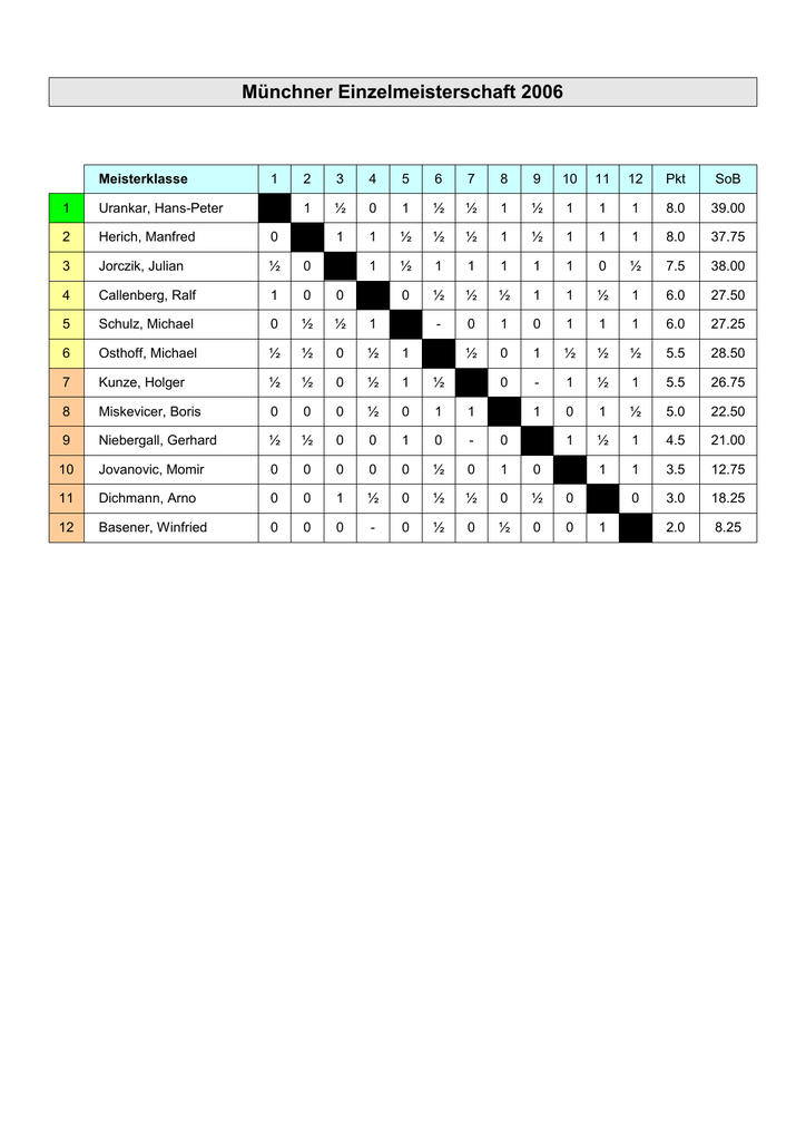 Münchner Einzelmeisterschaft 2006 Meisterklasse 1 2 3 4 5 6 7 8 9 10 11 12 Pkt SoB 1 ½ 0 1 ½ ½ 1 ½ 1 1 1 8.0 39.00 1 1 ½ ½ ½ 1 ½ 1 1 1 8.0 37.75 1 ½ 1 1 1 1 1 0 ½ 7.5 38.00 0 ½ ½ ½ 1 1 ½ 1 6.0 27.50 - 0 1 0 1 1 1 6.0 27.25 ½ 0 1 ½ ½ ½ 5.5 28.50 0 - 1 ½ 1 5.5 26.75 1 0 1 ½ 5.0 22.50 1 ½ 1 4.5 21.00 1 1 3.5 12.75 0 3.0 18.25 2.0 8.25 1 Urankar, Hans-Peter 2 Herich, Manfred 0 3 Jorczik, Julian ½ 0 4 Callenberg, Ralf 1 0 0 5 Schulz, Michael 0 ½ ½ 1 6 Osthoff, Michael ½ ½ 0 ½ 1 7 Kunze, Holger ½ ½ 0 ½ 1 ½ 8 Miskevicer, Boris 0 0 0 ½ 0 1 1 9 Niebergall, Gerhard ½ ½ 0 0 1 0 - 0 10 Jovanovic, Momir 0 0 0 0 0 ½ 0 1 0 11 Dichmann, Arno 0 0 1 ½ 0 ½ ½ 0 ½ 0 12 Basener, Winfried 0 0 0 - 0 ½ 0 ½ 0 0 1 Vormeisterklasse 1 1 2 3 4 5 6 7 8 9 Pkt SoB 1 1 1 1 1 1 1 1 8.0 28.00 ½ ½ 1 1 ½ 1 1 5.5 17.25 ½ ½ 1 ½ 1 0 4.0 14.25 1 ½ ½ ½ 0 3.5 13.00 ½ 1 ½ 1 3.5 10.25 1 ½ 1 1 3.5 10.00 ½ + ½ 3.0 10.00 3.0 8.75 2.0 7.50 1 Otte, Marco 2 Hönnekes, Klaus 0 3 Geisberger, Thomas 0 ½ 4 Hahn, Dietmar 0 ½ ½ 5 Schmidt, Walter 0 0 ½ 0 6 Solger, Bernhard 0 0 0 ½ ½ 7 Suligoy, Alois 0 ½ ½ ½ 0 0 8 Utz, Günther 0 0 0 ½ ½ ½ ½ 9 Niedergesaess, Herbert 0 0 1 1 0 0 - 10 Jagdhuber, Hans 0 ½ Vormeisterklasse 2 ½ 1 10 ½ + - 2 3 4 5 6 7 8 9 10 Pkt SoB ½ ½ 1 ½ ½ ½ 1 1 1 6.5 26.50 1 ½ 1 ½ ½ 0 1 1 6.0 25.50 ½ 1 ½ 1 ½ ½ 1 5.5 22.00 0 1 ½ 1 1 1 5.5 21.00 1 0 1 1 0 4.5 19.75 1 0 1 1 4.5 18.00 1 0 0 3.5 17.00 0 1 3.5 15.75 ½ 3.0 11.00 2.5 9.50 1 Beck, Alexander 2 Santl, Anton ½ 3 Taimanov, Alexander ½ 0 4 Schmitzer, Peter 0 ½ ½ 5 Erhart, Tristan ½ 0 0 1 6 Sakkal, Cherin ½ ½ ½ 0 0 7 Engl, Heinz ½ ½ 0 ½ 1 0 8 Staudacher, Thomas 0 1 ½ 0 0 1 0 9 Biberger, Hans 0 0 ½ 0 0 0 1 1 10 Schaffranietz, Horst 0 0 0 0 1 0 1 0 ½ Hauptturnier 1 1 2 3 4 5 6 7 8 9 10 Pkt SoB 0 1 1 1 1 1 1 1 ½ 7.5 30.00 ½ 0 ½ 1 1 1 1 1 7.0 25.75 ½ 1 1 1 1 1 1 7.0 23.75 1 1 0 1 1 1 6.5 24.00 1 0 1 1 1 4.5 12.50 1 1 1 1 4.0 8.50 0 1 ½ 3.5 13.50 0 1 2.0 4.50 1 2.0 3.00 1.0 5.50 1 Neusatz, Bruno 2 Höfelsauer, Thomas 1 3 Krombholz, Martin 0 ½ 4 Lux, Jürgen 0 1 ½ 5 Litke, Eduard 0 ½ 0 0 6 Mattes, Heinz, Dr. - 0 - 0 - 7 Kaplan, Marc 0 0 0 1 1 0 8 Sewa, Enzar-Gol 0 0 0 0 0 0 1 9 Hiltner, Karlpeter, Dr. 0 0 0 0 0 0 0 1 10 Ruf, Karl ½ 0 0 0 0 0 ½ 0 0 Hauptturnier 2 1 2 3 4 5 6 7 8 9 10 Pkt SoB 0 0 1 1 1 1 1 1 1 7.0 27.50 1 0 0 ½ ½ ½ 1 1 5.5 24.00 0 1 1 0 1 1 0 5.0 23.00 0 ½ 1 1 ½ 0 5.0 21.25 1 0 0 1 1 5.0 21.00 ½ 1 ½ 1 4.0 15.25 0 ½ 0 3.5 16.50 0 1 3.5 14.25 1 3.5 12.75 3.0 13.50 1 Karrer, Werner 2 Sander, Norbert 1 3 Ronkina, Vera 1 0 4 Roth, Patrick 0 1 1 5 Cabrera, Elmo 0 1 0 1 6 Ebermayer, Anton 0 ½ 0 ½ 0 7 Kelling, Arno 0 ½ 1 0 1 ½ 8 Blosze, Winfried 0 ½ 0 0 1 0 1 9 Wallendik, Thomas 0 0 0 ½ 0 ½ ½ 1 10 Rochleder, Eric, Dr. 0 0 1 1 0 0 1 0 0 Hauptturnier 3 1 2 3 4 5 6 7 8 9 10 Pkt SoB 1 1 0 1 ½ 1 1 1 1 7.5 29.75 1 1 0 1 1 1 1 1 7.0 25.50 0 1 1 1 1 1 1 6.5 19.00 0 1 ½ 0 1 1 5.5 22.25 1 0 1 0 1 5.0 21.50 1 1 1 1 4.5 13.25 ½ ½ 1 3.5 11.25 1 1 3.5 9.75 0 1.5 6.75 1.0 1.50 Pkt SoB 1 Kappes, Dieter 2 Kuhlmann, Hans-Peter 0 3 Damaske, Ronny 0 0 4 Karst, Christian 1 0 1 5 Fabian, Laszlo 0 1 0 1 6 Dervisevic, Ramiz ½ - - - 0 7 Habicht, Oswald 0 0 0 ½ 1 0 8 Schönfelder, Heinrich 0 0 0 1 0 0 ½ 9 Heinrichsen, Peter 0 0 0 0 1 0 ½ 0 10 Kellner, Adolf 0 0 0 0 0 0 0 0 1 Hauptturnier 4 1 2 3 4 5 6 7 8 9 ½ 1 0 + + 1 1 1 6.5 23.00 = 1 ½ + 1 0 ½ 5.0 19.50 1 0 1 1 1 ½ 5.0 17.50 1 0 - 1 1 4.0 15.00 0 1 1 0 3.5 14.00 ½ - 1 3.5 11.25 1 1 3.5 10.75 1 3.0 10.50 2.0 8.50 1 Brenninger, Anton 2 Jasarevic', Izudin ½ 3 Kuchling, Gerhard 0 = 4 Tunka, Philipp 1 0 0 5 Schmid, Johann - ½ 1 0 6 Kümmel, Hansjörg, Dr. - - 0 1 1 7 Krafzik, Joachim 0 0 0 + 0 ½ 8 Zohr, Adelbert 0 1 0 0 0 + 0 9 Grams, Arthur 0 ½ ½ 0 1 0 0 10 0 10 Hauptturnier 5 1 2 3 4 5 6 7 8 9 10 Pkt SoB 1 ½ 0 1 1 0 1 1 1 6.5 27.50 0 ½ 1 1 1 1 1 1 6.5 24.50 1 ½ ½ 1 ½ 0 0 5.0 24.75 1 ½ ½ ½ 0 1 5.0 23.00 ½ 1 1 1 1 5.0 17.25 1 0 1 1 4.5 16.50 1 1 0 3.5 15.50 1 ½ 3.5 13.75 1 3.0 12.50 2.5 10.25 1 Cehajic, Hazim 2 Ilic, Andreas 0 3 Bergmann, Thomas ½ 1 4 Maroske, Carlos 1 ½ 0 5 Tafelmayer, Karl 0 0 ½ 0 6 Hahn, Horst 0 0 ½ ½ ½ 7 Wawrinsky, Ludwig 1 0 0 ½ 0 0 8 Yin, Zixiao 0 0 ½ ½ - 1 0 9 Hornung, Richard 0 0 1 1 0 0 0 0 10 Gerlach, Peter 0 0 1 0 0 0 1 ½ 0 Grundturnier 1 1 2 3 4 5 6 7 8 9 10 Pkt SoB ½ ½ 1 1 1 1 1 ½ 0 6.5 30.25 ½ ½ ½ ½ 1 1 ½ 1 6.0 23.75 0 1 0 1 1 1 1 6.0 22.75 0 1 0 1 1 1 5.5 20.50 0 1 1 1 1 5.5 19.50 0 ½ ½ 1 4.5 18.50 0 1 1 4.0 13.50 1 1 3.5 9.75 1 2.5 9.50 1.0 6.50 1 Eichhorn, Erich 2 Stegmaier, Erika ½ 3 Schäufele, Jörg ½ ½ 4 Strunz, Heinrich 0 ½ 1 5 Maurer, Markus 0 ½ 0 1 6 Schirdewahn, Werner 0 ½ 1 0 1 7 Rebien, Inge 0 0 0 1 0 1 8 Primavesi, Doris 0 0 0 0 0 ½ 1 9 Tyszewicz, Marek ½ ½ 0 0 0 ½ - 0 10 Popp, Juliane 1 0 0 0 0 0 0 0 0 Grundturnier 2 1 2 3 4 5 6 7 8 9 10 Pkt SoB 1 1 ½ ½ 1 1 0 1 1 7.0 29.25 1 ½ ½ 1 1 1 1 1 7.0 25.25 ½ 1 1 1 1 1 1 6.5 21.50 ½ ½ ½ 1 1 1 6.0 22.25 0 1 1 1 1 5.5 19.00 ½ 0 1 1 4.0 12.75 1 ½ 1 3.5 9.25 0 1 3.0 11.00 1 2.5 4.75 0.0 0.00 1 Kron, Hans-Peter 2 Heischmann, Rudolf 0 3 Klein, Reinhard 0 0 4 Romano, Gianfranco ½ ½ ½ 5 Trompke, Jürgen ½ ½ 0 ½ 6 Frohnholzer, August 0 0 0 ½ 1 7 Bitzer, Johannes 0 0 0 ½ 0 ½ 8 Mittelstaedt, Ewald 1 0 0 0 0 1 0 9 Schmidt, Axel 0 0 0 0 0 0 ½ 1 10 Rückert, Ferdinand 0 0 0 0 0 0 0 0 0 Grundturnier 3 1 2 3 4 5 6 7 8 9 10 Pkt SoB 0 ½ 1 1 1 1 1 1 1 7.5 27.25 0 1 1 1 0 1 1 1 7.0 28.50 ½ 1 ½ 0 1 1 1 6.5 27.00 ½ 1 1 1 1 1 6.0 18.50 1 1 1 1 1 5.5 15.50 1 1 ½ ½ 3.5 10.50 0 0 1 3.0 14.50 1 ½ 2.5 6.00 1 2.5 5.75 1.0 3.00 1 Pöting, Carsten 2 Kohn, Robert 1 3 Borchert, Florian ½ 1 4 Szanto, Arpad 0 0 ½ 5 Seizmair, Georg 0 0 0 ½ 6 Stoll, Guido 0 0 ½ - 0 7 Berger, Johannes 0 1 1 0 0 0 8 Cagna, Roberto 0 0 0 0 0 0 1 9 Gronbach, Karl 0 0 0 0 0 ½ 1 0 10 Timm, Wolfgang 0 0 0 0 0 ½ 0 ½ 0 Grundturnier 4 1 2 3 4 5 6 7 8 Pkt SoB 1 1 ½ 1 1 1 1 6.5 19.25 1 1 1 1 1 1 6.0 15.50 1 1 1 1 1 5.0 