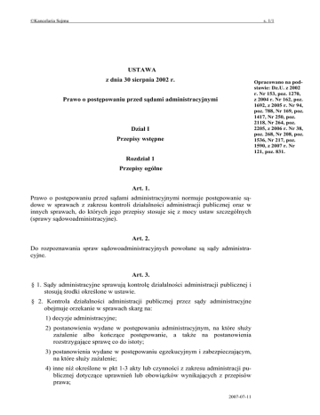 ©Kancelaria Sejmu s. 1/1 USTAWA z dnia 30 sierpnia 2002 r. Opracowano na podstawie: Dz.U. z 2002 r. Nr 153, poz. 1270, z 2004 r. Nr 162, poz. 1692, z 2005 r. Nr 94, poz. 788, Nr 169, poz. 1417, Nr 250, poz. 2118, Nr 264, poz. 2205, z 2006 r. Nr 38, poz. 268, Nr 208, poz. 1536, Nr 217, poz. 1590, z 2007 r. Nr 121, poz. 831. Prawo o postępowaniu przed sądami administracyjnymi Dział I Przepisy wstępne Rozdział 1 Przepisy ogólne Art. 1. Prawo o postępowaniu przed sądami administracyjnymi normuje postępowanie sądowe w sprawach z zakresu kontroli działalności administracji publicznej oraz w innych sprawach, do których jego przepisy stosuje się z mocy ustaw szczególnych (sprawy sądowoadministracyjne). Art. 2. Do rozpoznawania spraw sądowoadministracyjnych powołane są sądy administracyjne. Art. 3. § 1. Sądy administracyjne sprawują kontrolę działalności administracji publicznej i stosują środki określone w ustawie. § 2. Kontrola działalności administracji publicznej przez sądy administracyjne obejmuje orzekanie w sprawach skarg na: 1) decyzje administracyjne; 2) postanowienia wydane w postępowaniu administracyjnym, na które służy zażalenie albo kończące postępowanie, a także na postanowienia rozstrzygające sprawę co do istoty; 3) postanowienia wydane w postępowaniu egzekucyjnym i zabezpieczającym, na które służy zażalenie; 4) inne niż określone w pkt 1-3 akty lub czynności z zakresu administracji publicznej dotyczące uprawnień lub obowiązków wynikających z przepisów prawa; 2007-07-11 ©Kancelaria Sejmu s. 2/2 <4a) pisemne interpretacje przepisów prawa podatkowego wydawane w indywidualnych sprawach;> 5) akty prawa miejscowego organów jednostek samorządu terytorialnego i terenowych organów administracji rządowej; 6) akty organów jednostek samorządu terytorialnego i ich związków, inne niż określone w pkt 5, podejmowane w sprawach z zakresu administracji puw art. 3 w § 2: dodablicznej; ny pkt 4a i nowe 7) akty nadzoru nad działalnością organów jednostek samorządu terytorialne- brzmienie pkt 8 go; wchodzi w życie z dn. [8) bezczynność organów w przypadkach określonych w pkt 1-4.] <8) bezczynność organów w przypadkach określonych w pkt 1-4a.> § 3. Sądy administracyjne orzekają także w sprawach, w których przepisy ustaw szczególnych przewidują sądową kontrolę, i stosują środki określone w tych przepisach. Art. 4. Sądy administracyjne rozstrzygają spory o właściwość między organami jednostek samorządu terytorialnego i między samorządowymi kolegiami odwoławczymi, o ile odrębna ustawa nie stanowi inaczej, oraz spory kompetencyjne między organami tych jednostek a organami administracji rządowej. Art. 5. Sądy administracyjne nie są właściwe w sprawach: 1) wynikających z nadrzędności i podległości organizacyjnej w stosunkach między organami administracji publicznej; 2) wynikających z podległości służbowej między przełożonymi i podwładnymi; 3) odmowy mianowania na stanowiska lub powołania do pełnienia funkcji w organach administracji publicznej, chyba że obowiązek mianowania lub powołania wynika z przepisów prawa; 4) wiz wydawanych przez konsulów. Art. 6. Sąd administracyjny powinien udzielać stronom występującym w sprawie bez adwokata lub radcy prawnego potrzebnych wskazówek co do czynności procesowych oraz pouczać ich o skutkach prawnych tych czynności i skutkach zaniedbań. Art. 7. Sąd administracyjny powinien podejmować czynności zmierzające do szybkiego załatwienia sprawy i dążyć do jej rozstrzygnięcia na pierwszym posiedzeniu. 2007-07-11 1.07.2007 r. (Dz.U. z 2006 r. Nr 217, poz. 1590) ©Kancelaria Sejmu s. 3/3 Art. 8. Prokurator oraz Rzecznik Praw Obywatelskich mogą wziąć udział w każdym toczącym się postępowaniu, a także wnieść skargę, skargę kasacyjną, zażalenie oraz skargę o wznowienie postępowania, jeżeli według ich oceny wymagają tego ochrona praworządności lub praw człowieka i obywatela. W takim przypadku przysługują im prawa strony. Art. 9. Organizacja społeczna, w zakresie swojej działalności statutowej, może brać udział w postępowaniu w przypadkach określonych w niniejszej ustawie. Art. 10. Rozpoznanie spraw odbywa się jawnie, chyba że przepis szczególny stanowi inaczej. Art. 11. Ustalenia wydanego w postępowaniu karnym prawomocnego wyroku skazującego co do popełnienia przestępstwa wiążą sąd administracyjny. Art. 12. Ilekroć w niniejszej ustawie jest mowa o stronie, rozumie się przez to również uczestnika postępowania. Rozdział 2 Właściwość wojewódzkich sądów administracyjnych Art. 13. § 1. Wojewódzkie sądy administracyjne rozpoznają wszystkie sprawy sądowoadministracyjne z wyjątkiem spraw, dla których zastrzeżona jest właściwość Naczelnego Sądu Administracyjnego. § 2. Do rozpoznania sprawy właściwy jest wojewódzki sąd administracyjny, na którego obszarze właściwości ma siedzibę organ administracji publicznej, którego działalność została zaskarżona. § 3. Prezydent Rzeczypospolitej Polskiej, w drodze rozporządzenia, może przekazać wojewódzkiemu sądowi administracyjnemu rozpoznawanie spraw określonego rodzaju należących do właściwości innego wojewódzkiego sądu administracyjnego, jeżeli wymagają tego względy celowości. Art. 14. Wojewódzki sąd administracyjny właściwy w chwili wniesienia skargi pozostaje właściwy aż do ukończenia postępowania, choćby podstawy właściwości zmieniły się w toku sprawy, chyba że przepis szczególny stanowi inaczej. 2007-07-11 ©Kancelaria Sejmu s. 4/4 Rozdział 3 Właściwość Naczelnego Sądu Administracyjnego Art. 15. § 1. Naczelny Sąd Administracyjny: 1) rozpoznaje środki odwoławcze od orzeczeń wojewódzkich sądów administracyjnych, stosownie do przepisów ustawy; 2) podejmuje uchwały mające na celu wyjaśnienie przepisów prawnych, których stosowanie wywołało rozbieżności w orzec