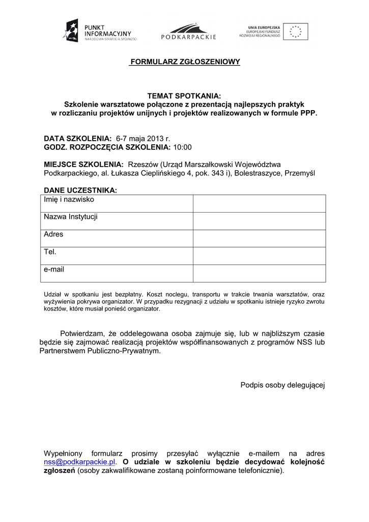 FORMULARZ ZGŁOSZENIOWY TEMAT SPOTKANIA: Szkolenie warsztatowe połączone z prezentacją najlepszych praktyk w rozliczaniu projektów unijnych i projektów realizowanych w formule PPP. DATA SZKOLENIA: 6-7 maja 2013 r. GODZ. ROZPOCZĘCIA SZKOLENIA: 10:00 MIEJSCE SZKOLENIA: Rzeszów (Urząd Marszałkowski Województwa Podkarpackiego, al. Łukasza Cieplińskiego 4, pok. 343 i), Bolestraszyce, Przemyśl DANE UCZESTNIKA: Imię i nazwisko Nazwa Instytucji Adres Tel. e-mail Udział w spotkaniu jest bezpłatny. Koszt noclegu, transportu w trakcie trwania warsztatów, oraz wyżywienia pokrywa organizator. W przypadku rezygnacji z udziału w spotkaniu istnieje ryzyko zwrotu kosztów, które musiał ponieść organizator. Potwierdzam, że oddelegowana osoba zajmuje się, lub w najbliższym czasie będzie się zajmować realizacją projektów współfinansowanych z programów NSS lub Partnerstwem Publiczno-Prywatnym. Podpis osoby delegującej Wypełniony formularz prosimy przesyłać wyłącznie e-mailem na adres [email protected]. O udziale w szkoleniu będzie decydować kolejność zgłoszeń (osoby zakwalifikowane zostaną poinformowane telefonicznie).